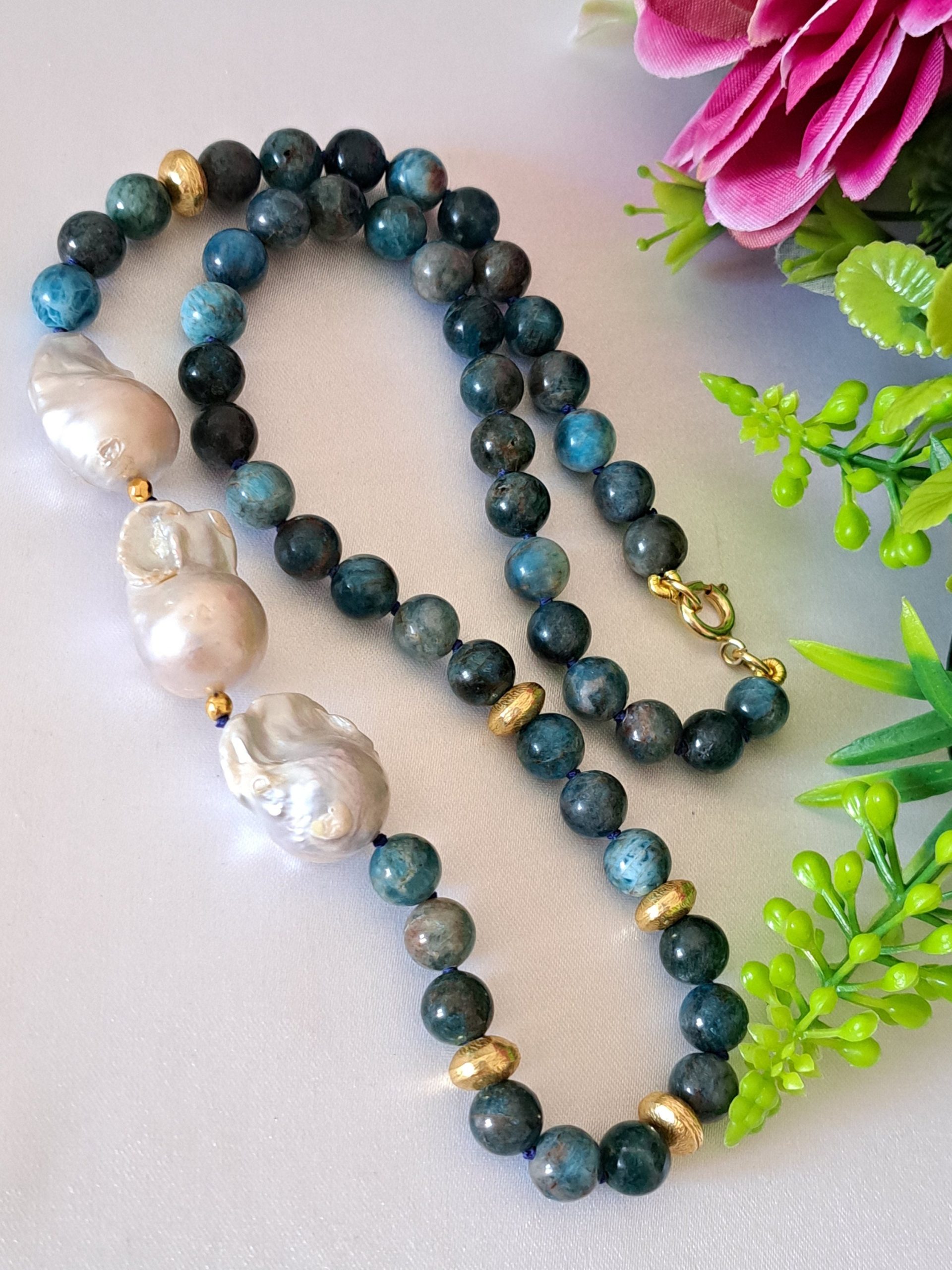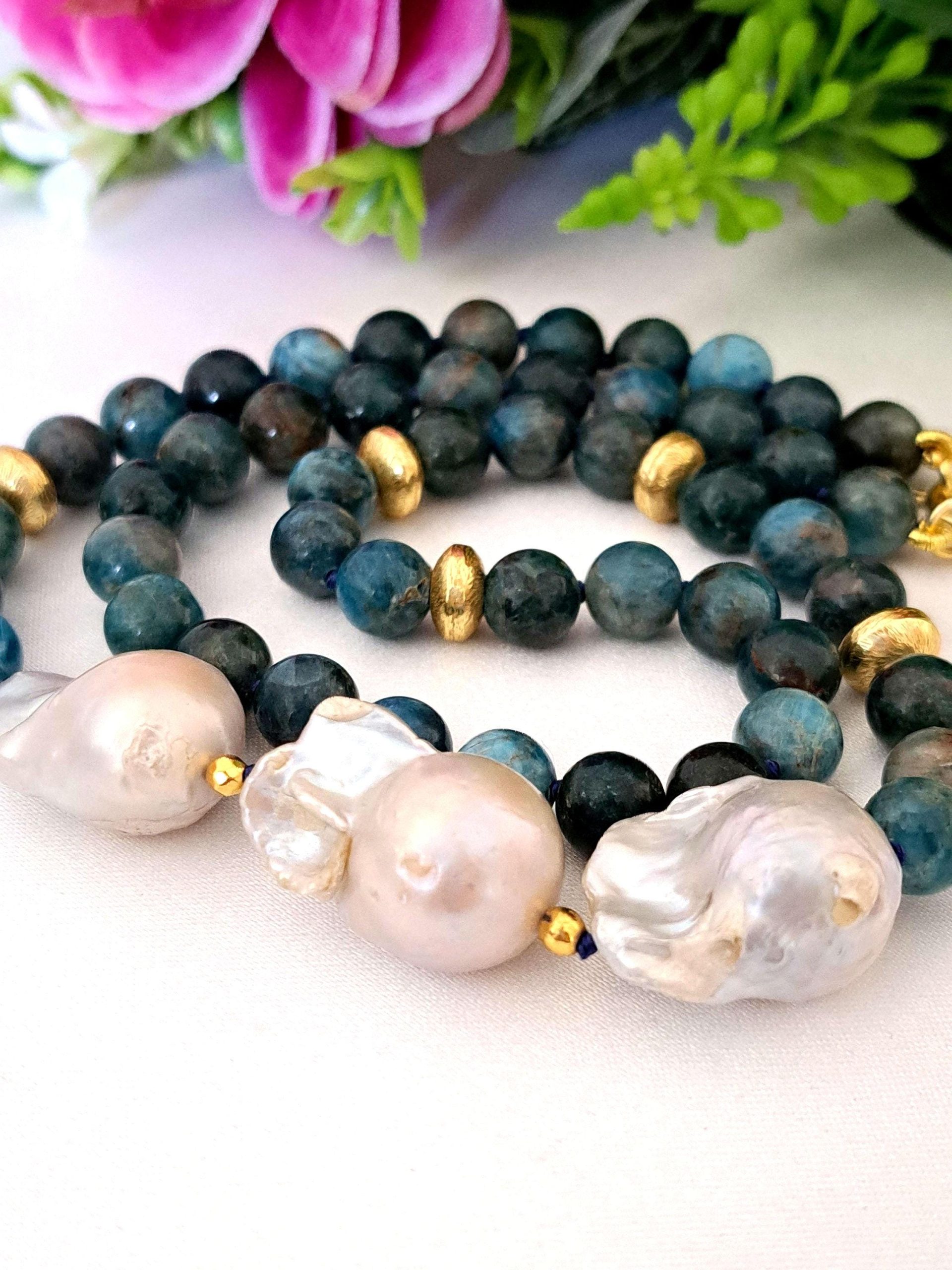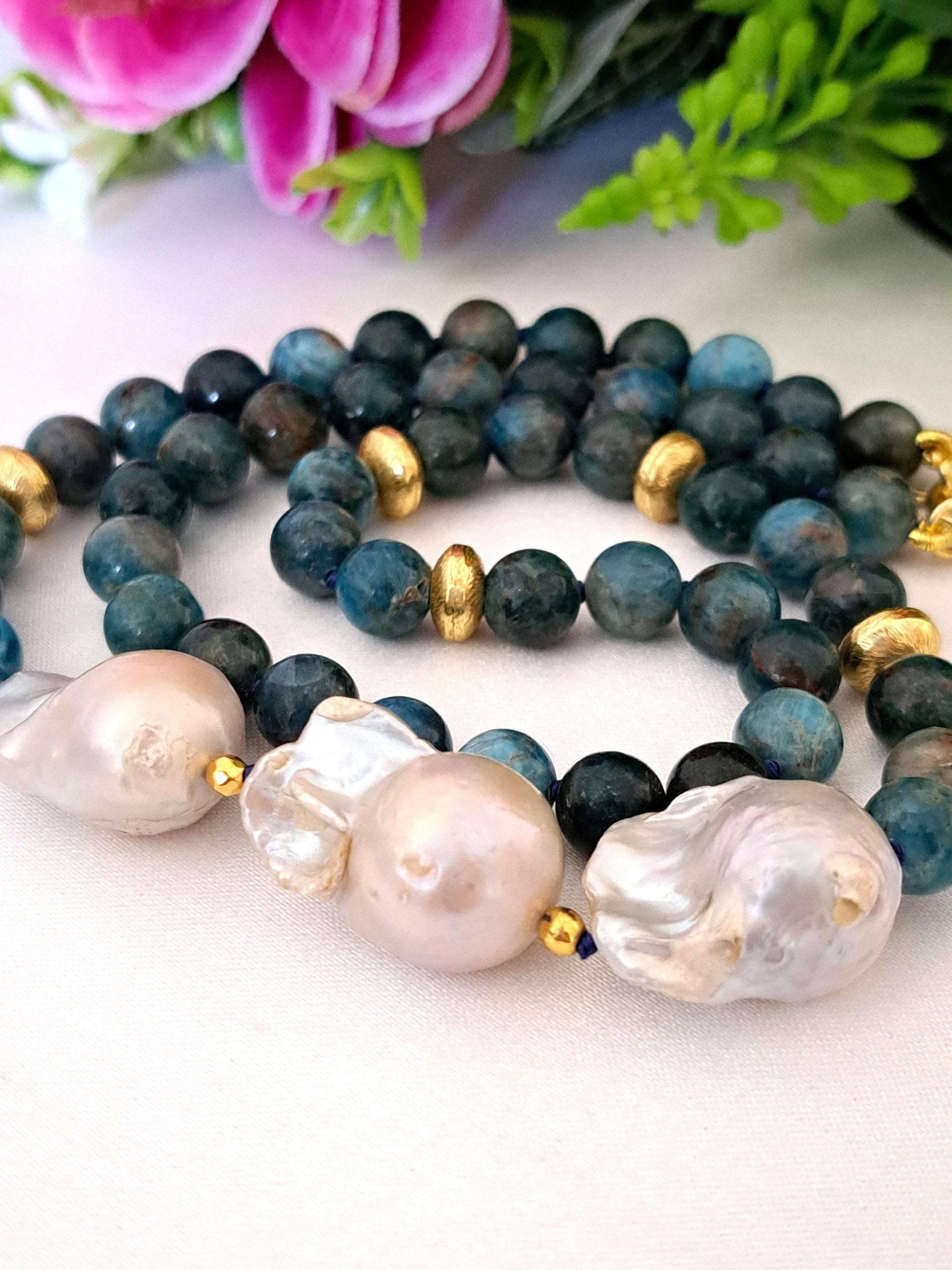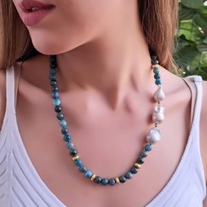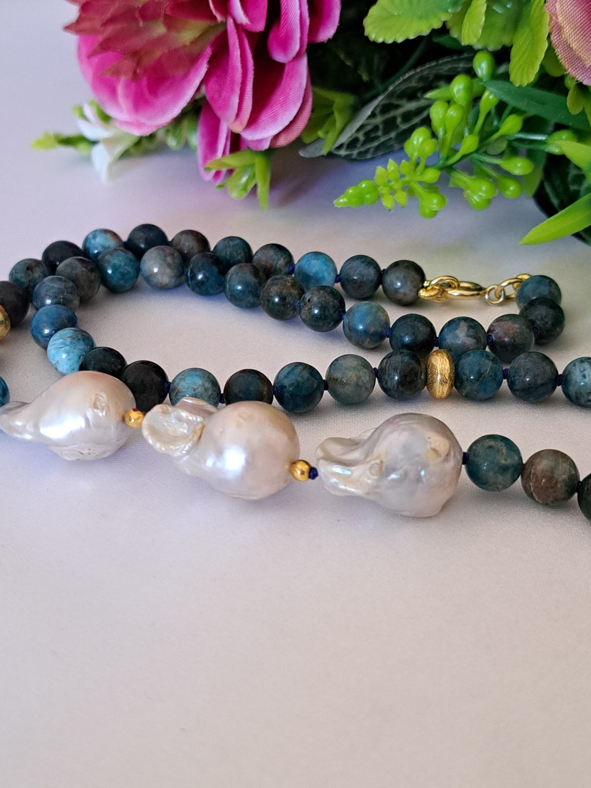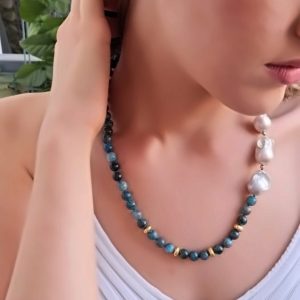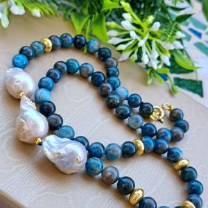 Collana pietre dure apatite blu e perle barocche bianche, collana girocollo