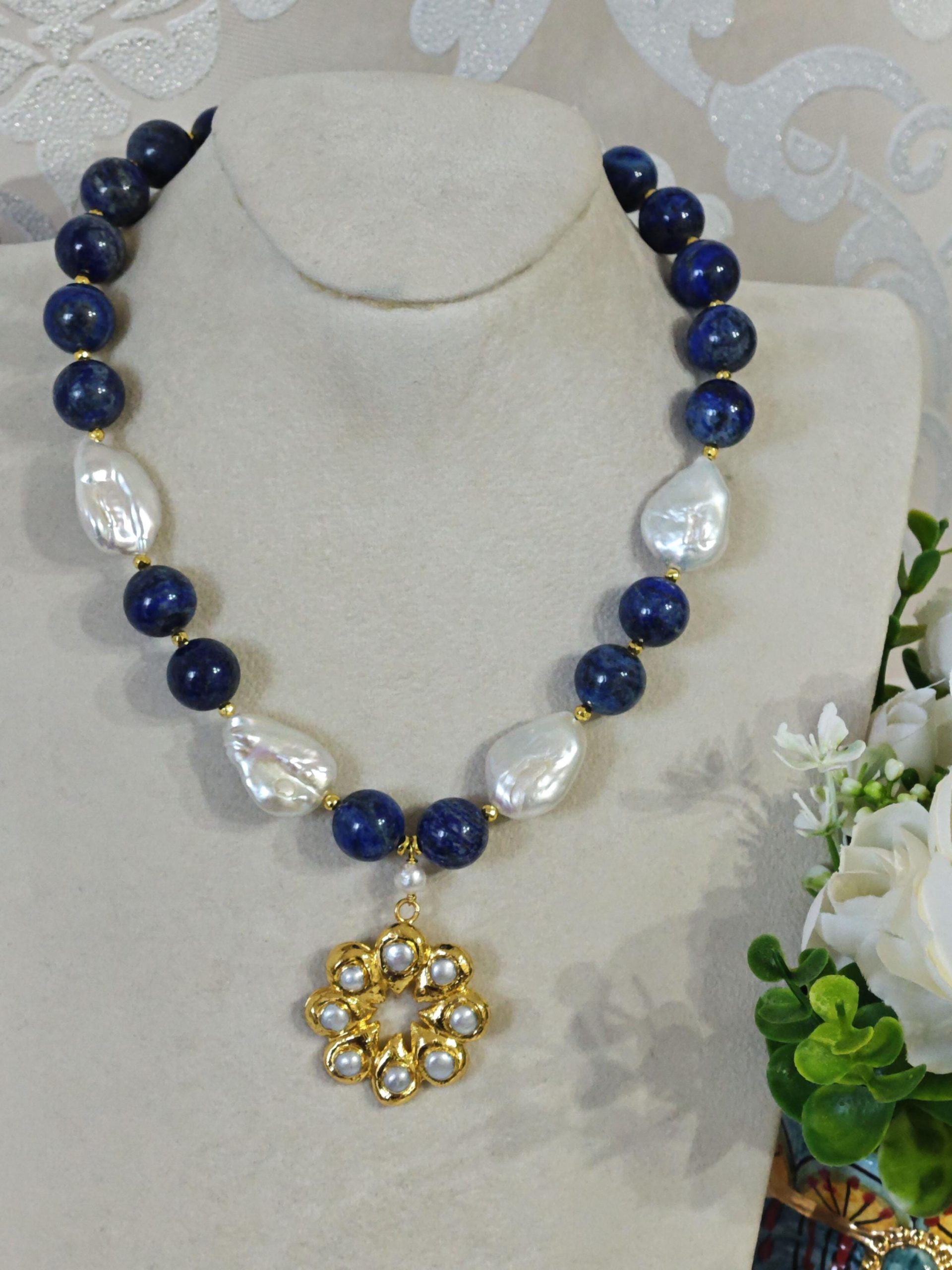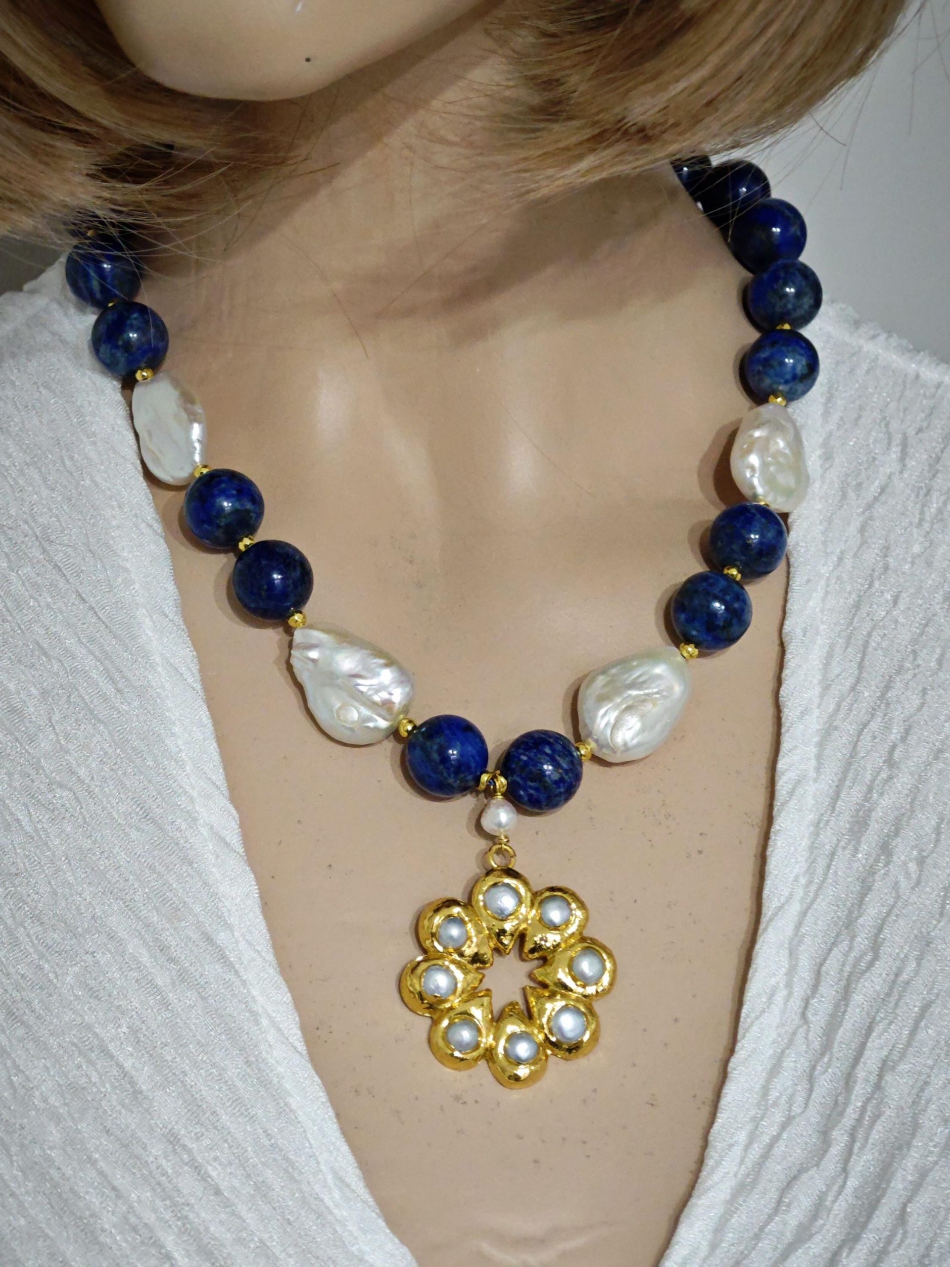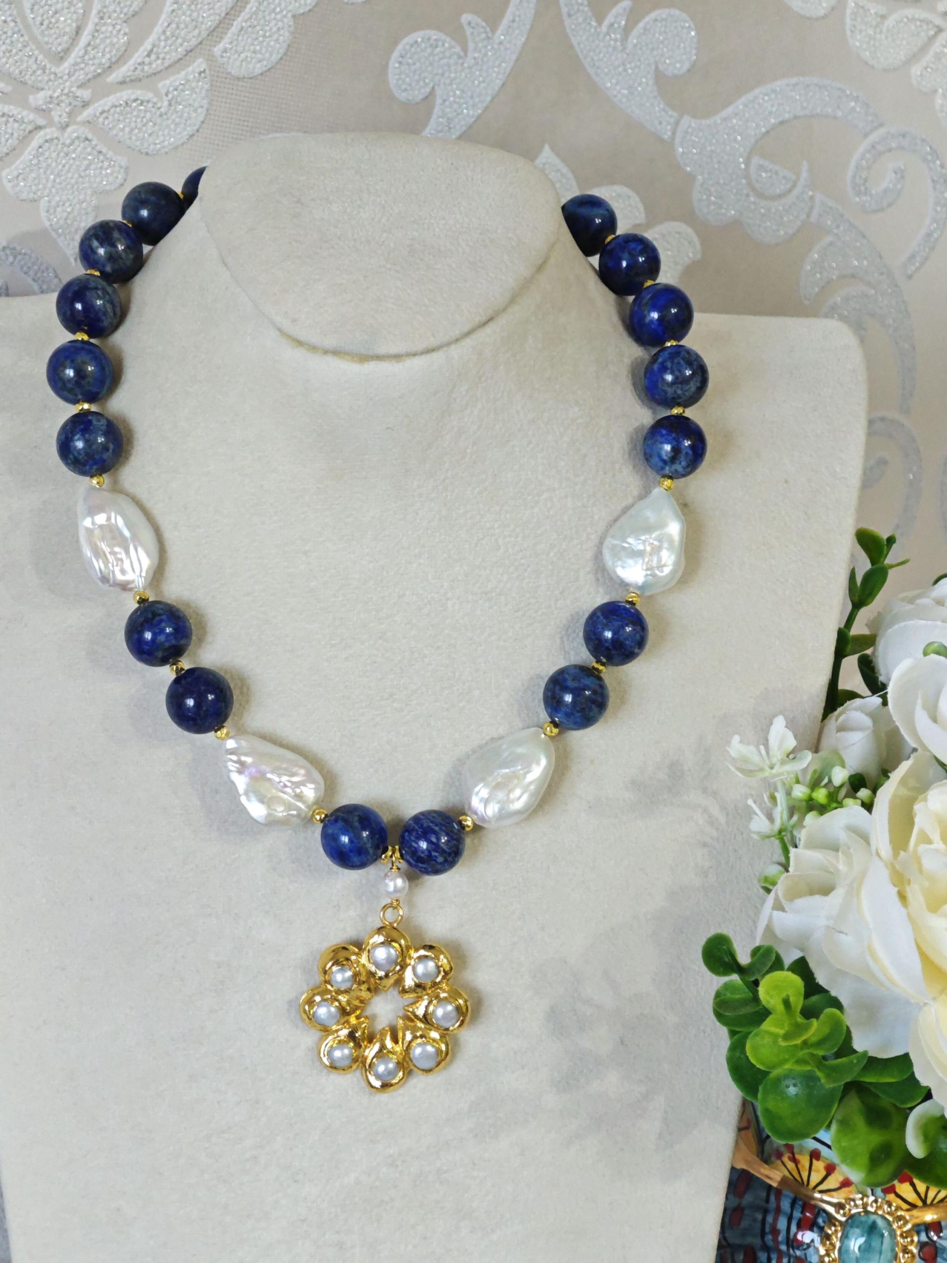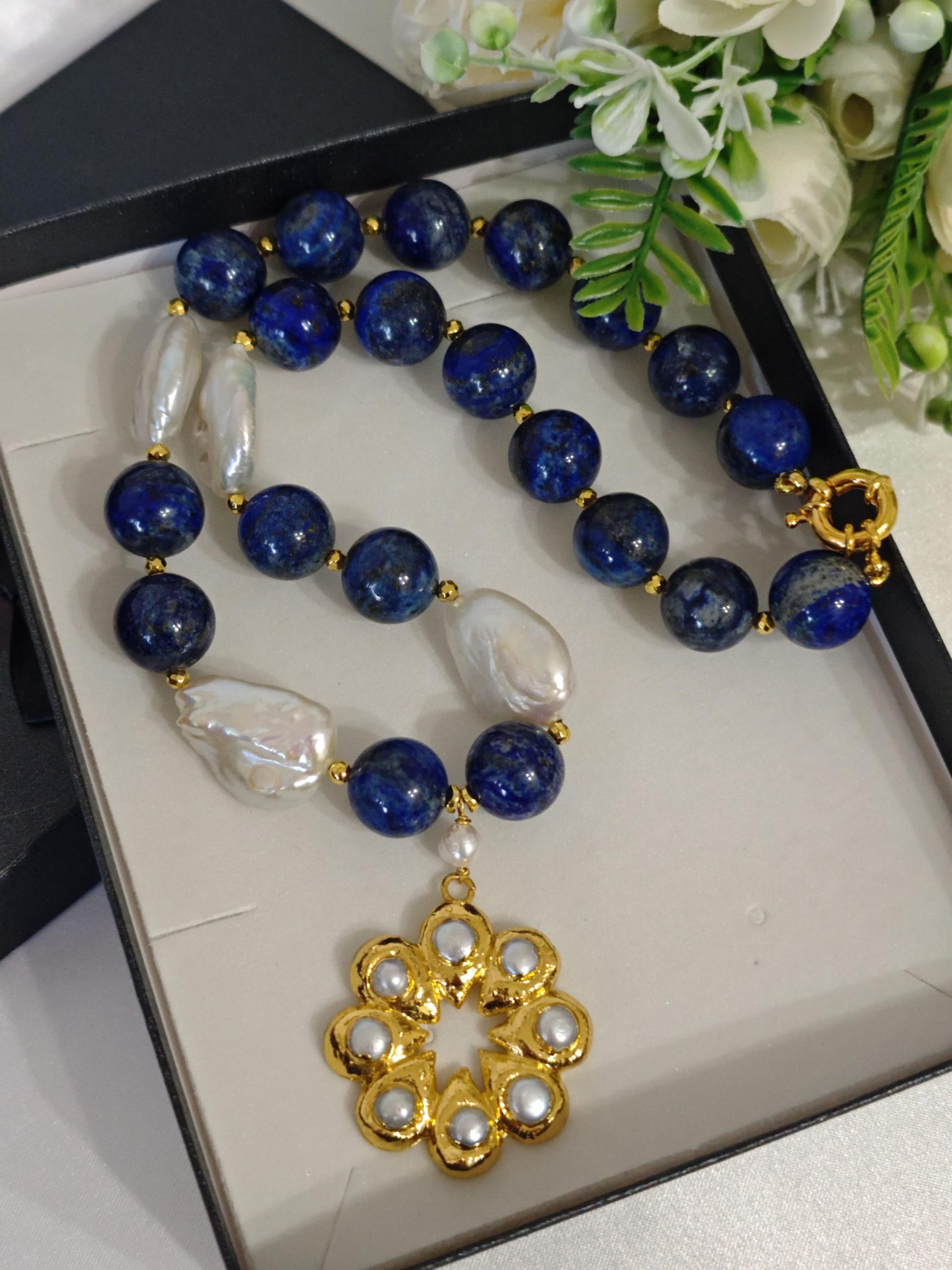 Collana girocollo realizzata con pietre dure lapislazzuli 14 mm con perle bianche barocche e pendente in ottone dorato con perle bianche.
