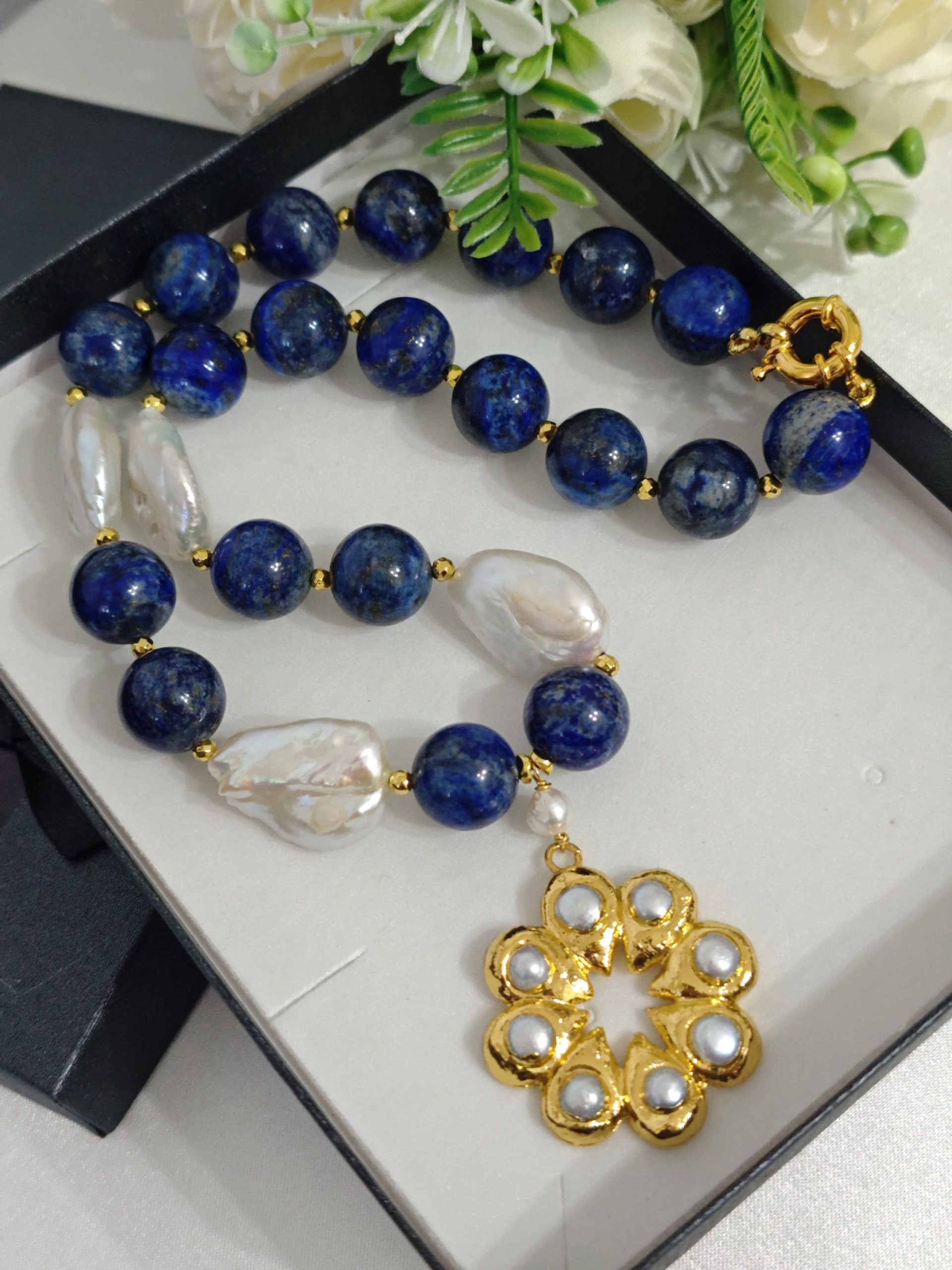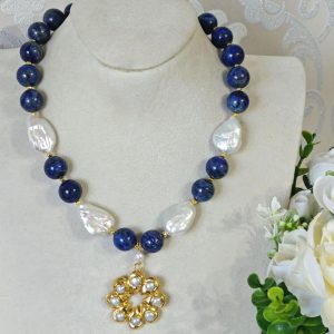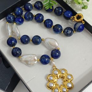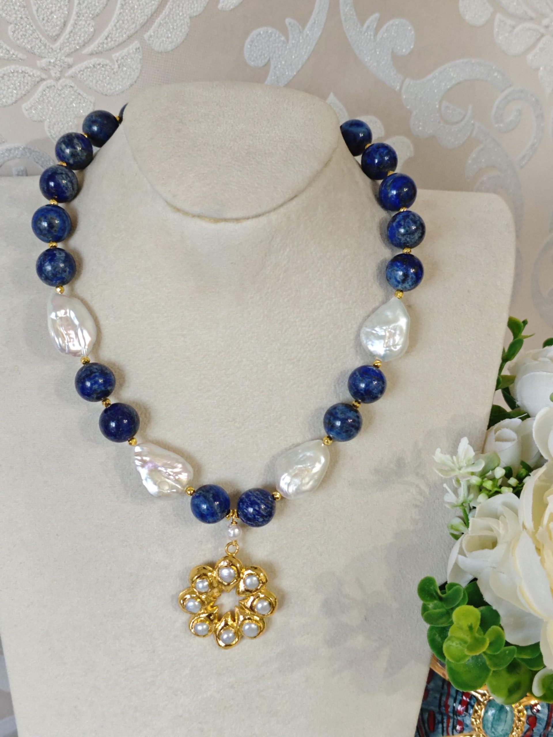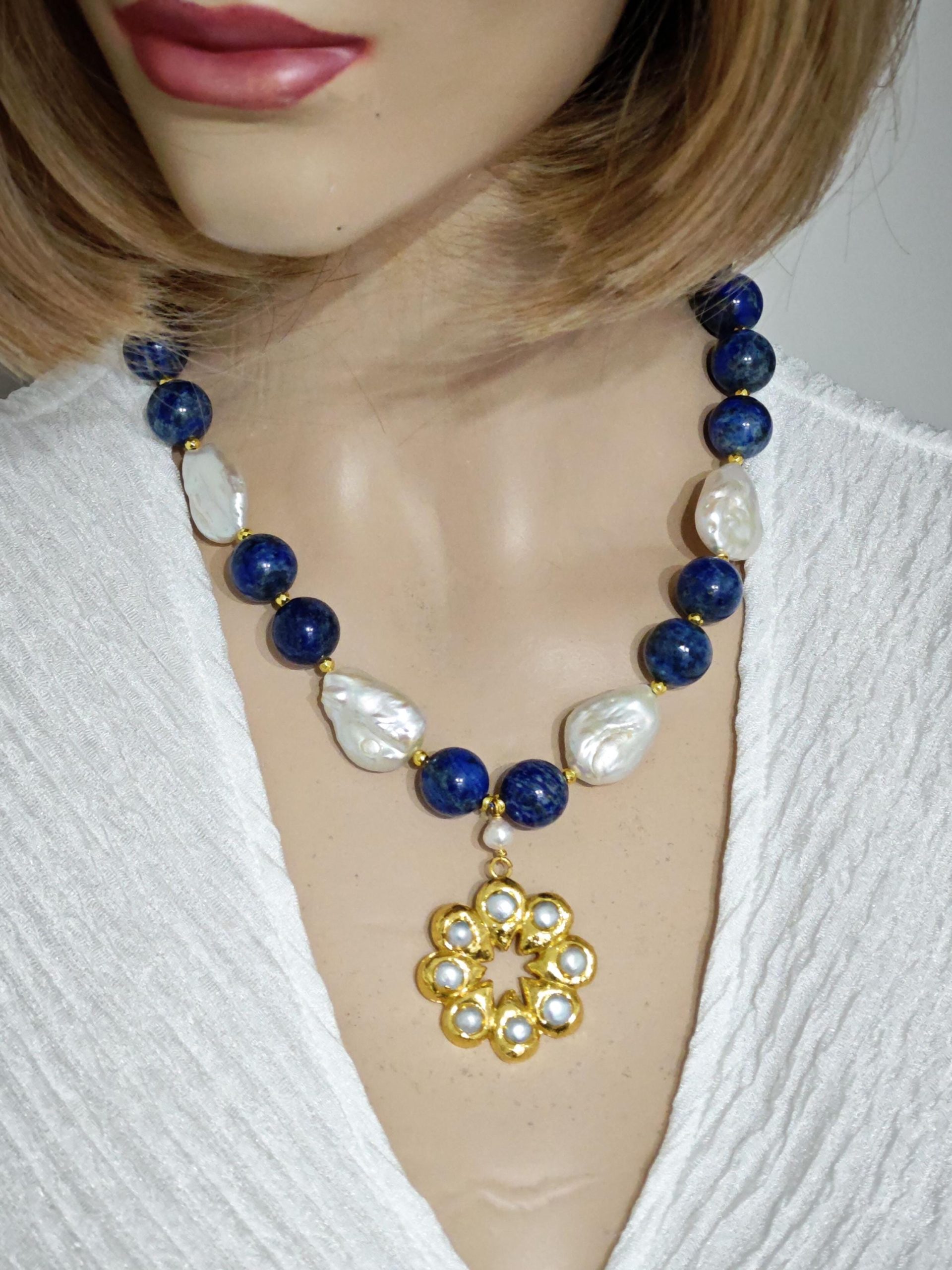 Collana girocollo realizzata con pietre dure lapislazzuli 14 mm con perle bianche barocche e pendente in ottone dorato con perle bianche.