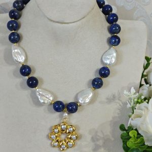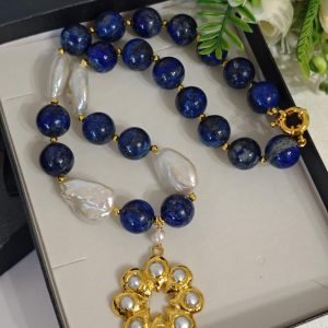 Collana pietre dure lapislazzuli e perle barocche bianche, collana girocollo moderna
