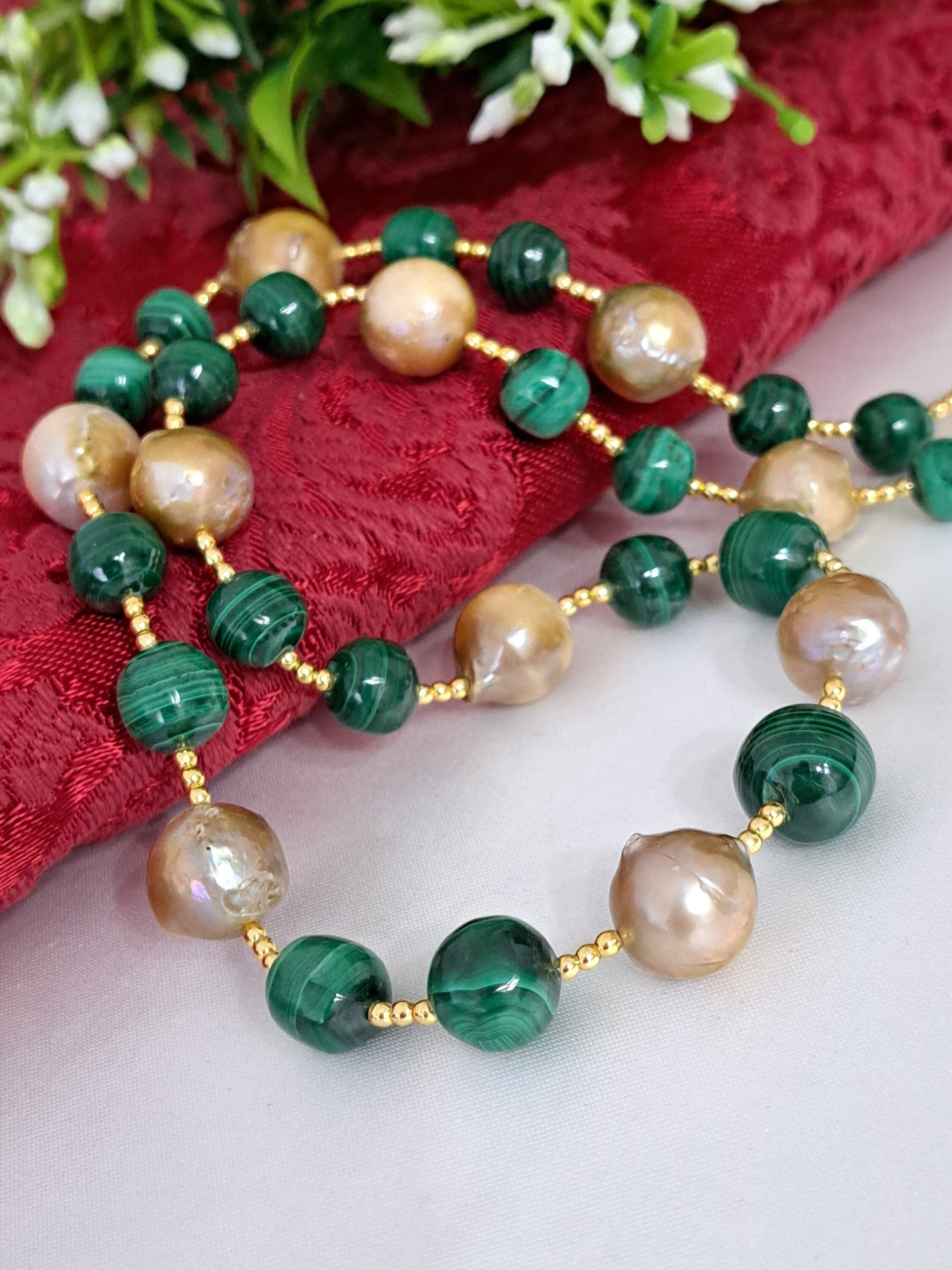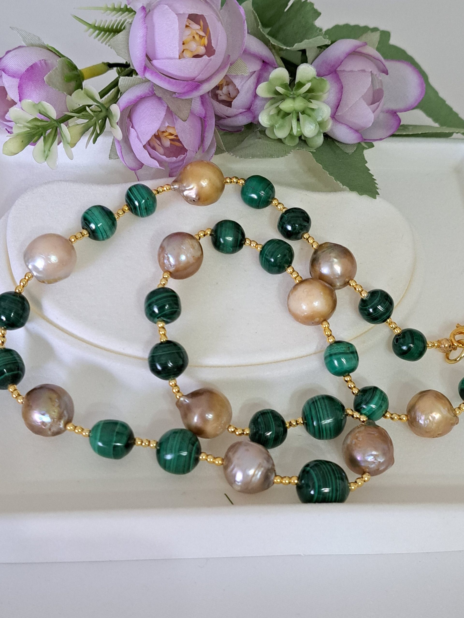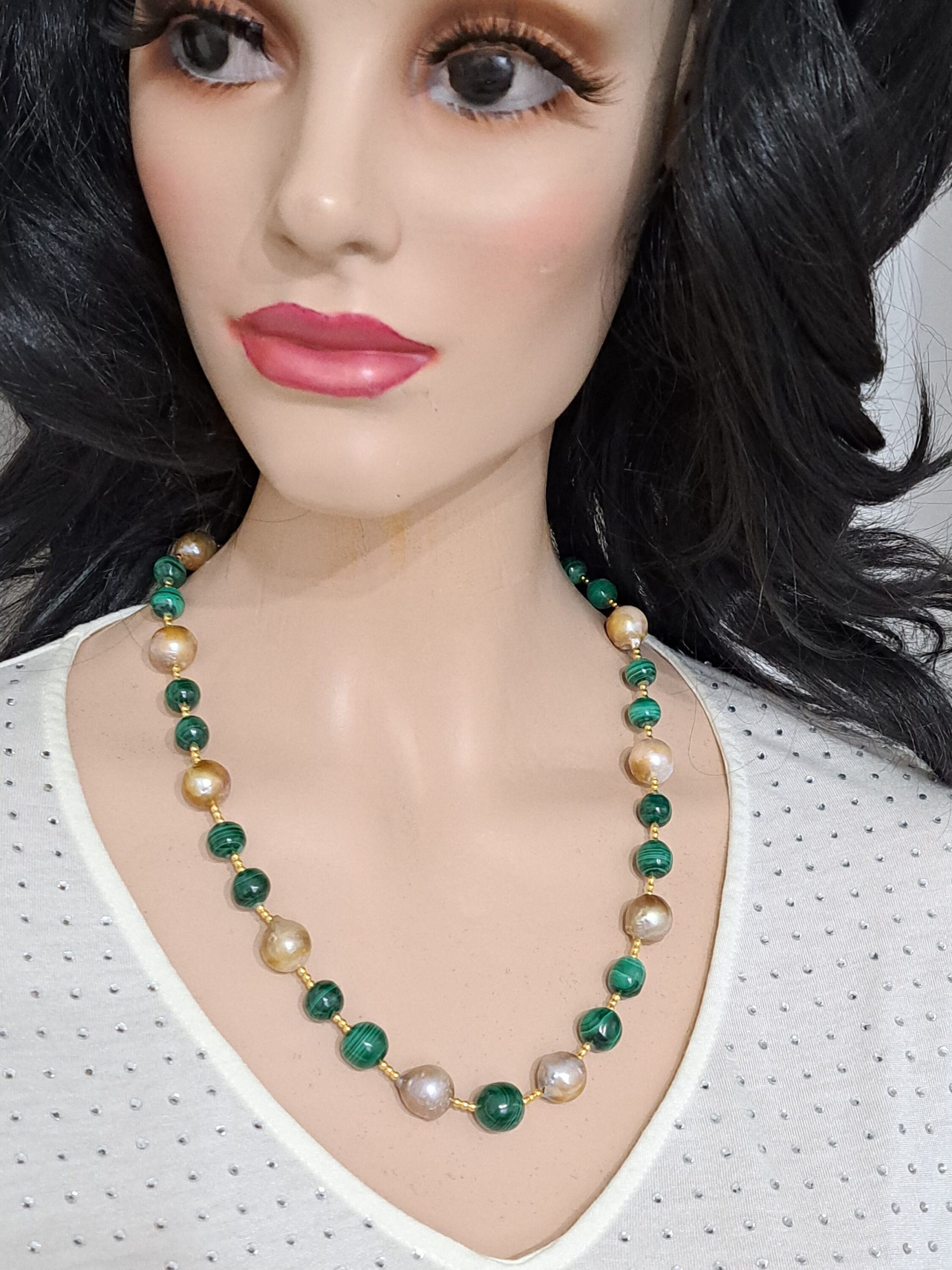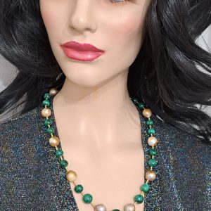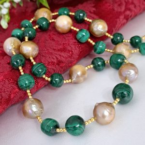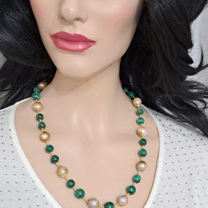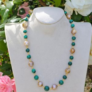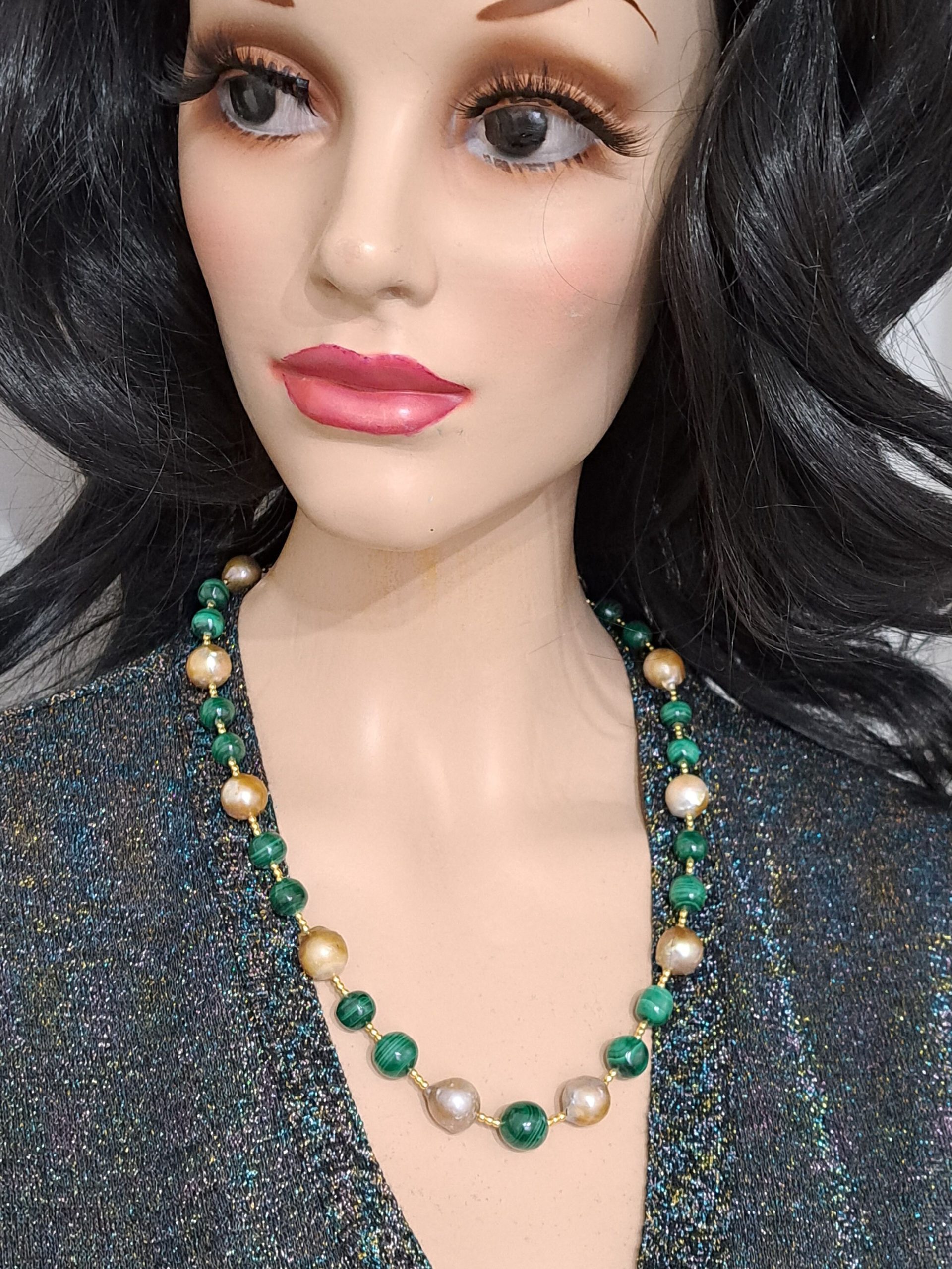 Collana pietre dure malachite e perle barocche, gioielli italiani