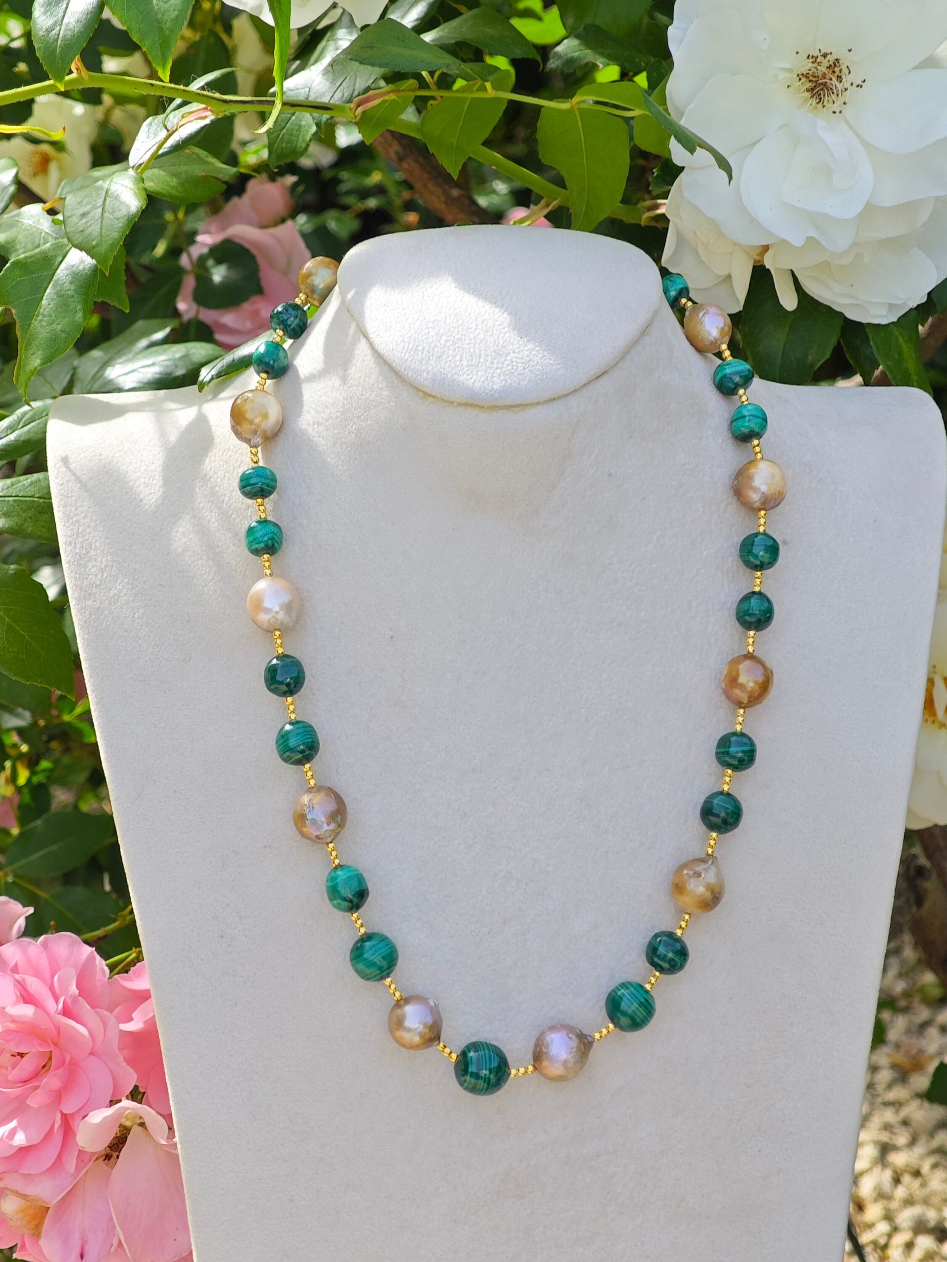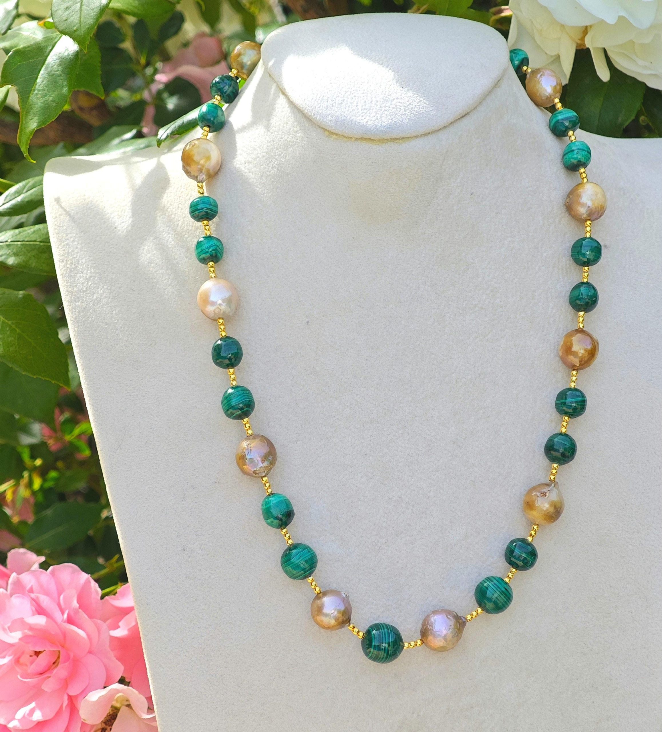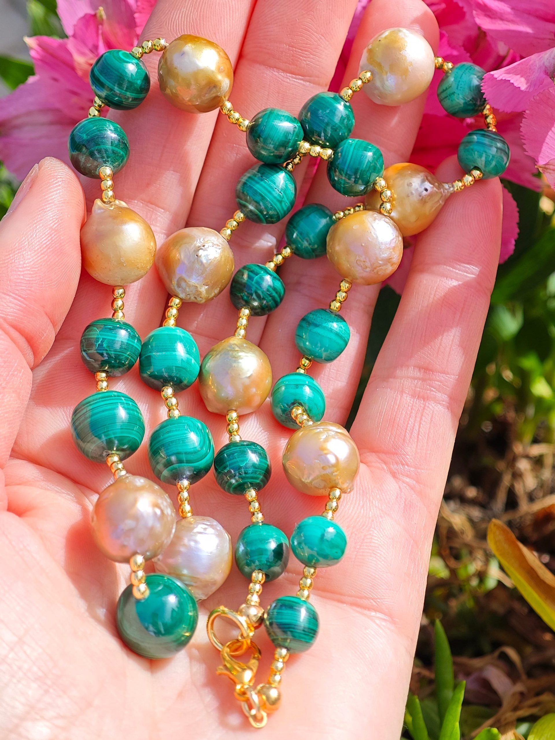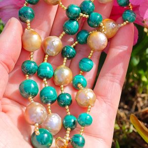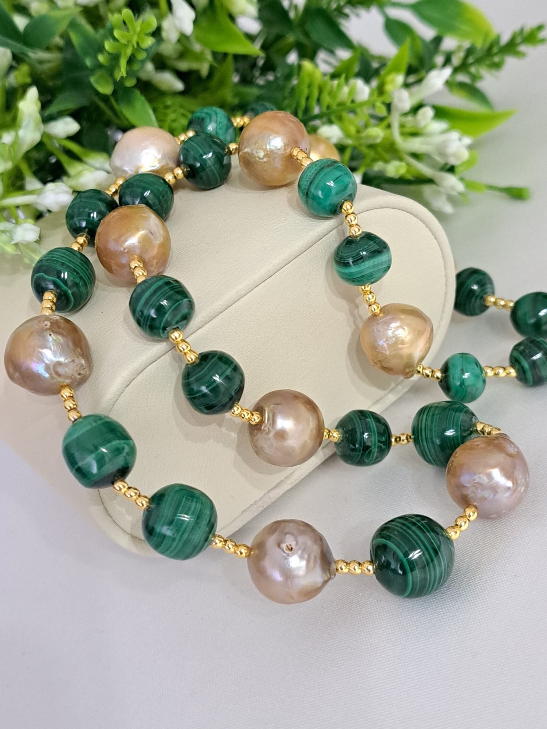 Collana pietre dure malachite e perle barocche, gioielli italiani