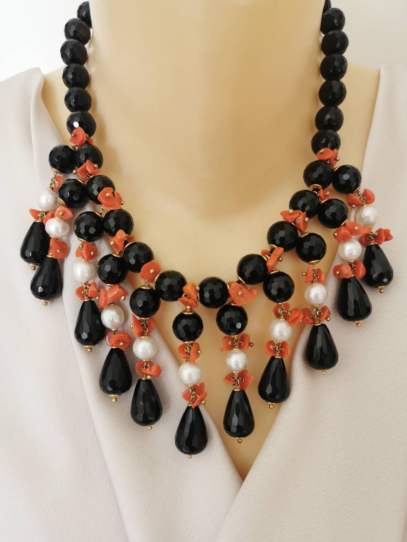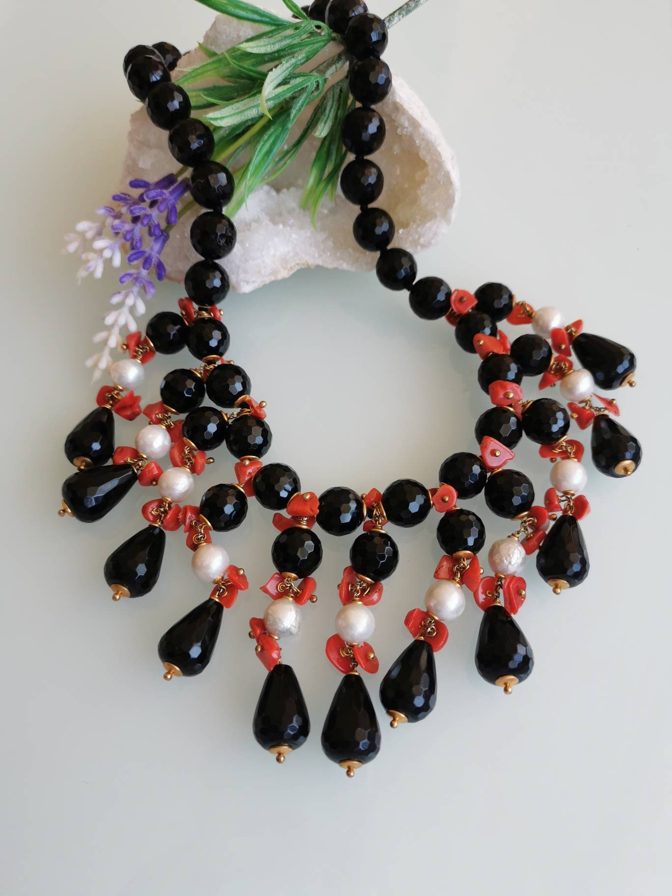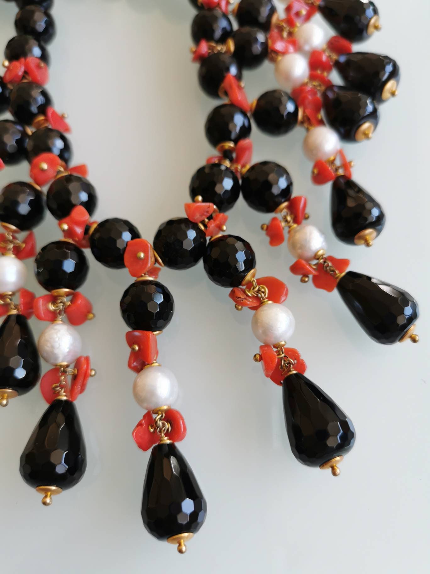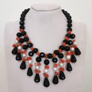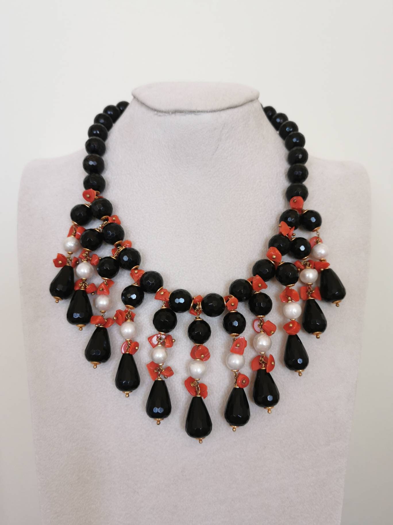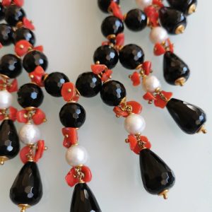 Collana girocollo con pietre dure tonde e a goccia sfaccettate onice nero , perle bianche e corallo rosso mediterraneo.