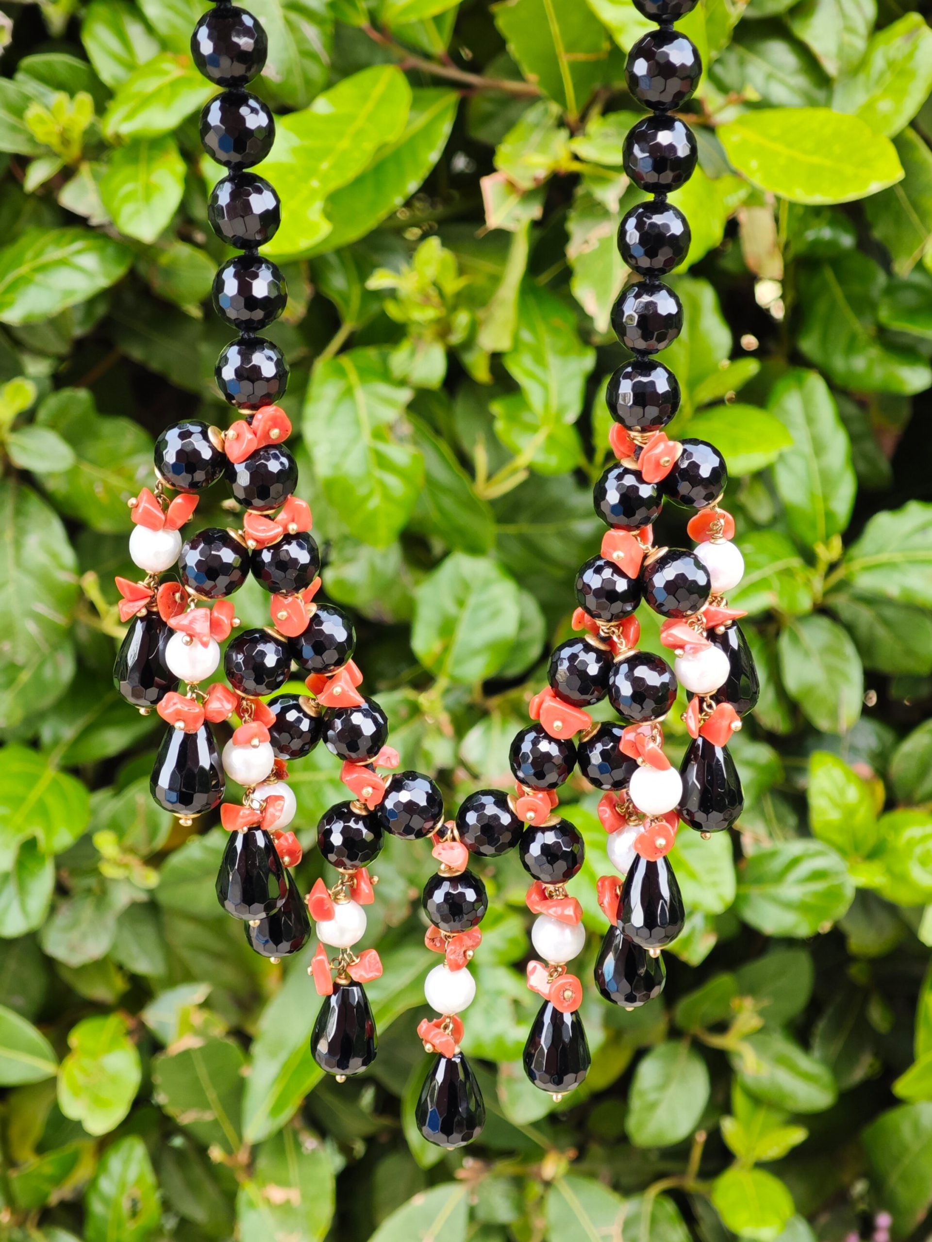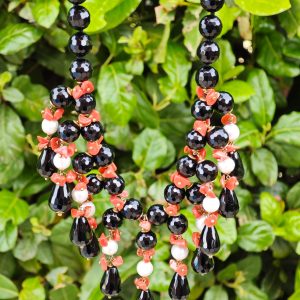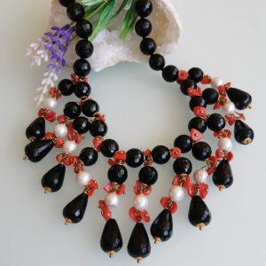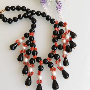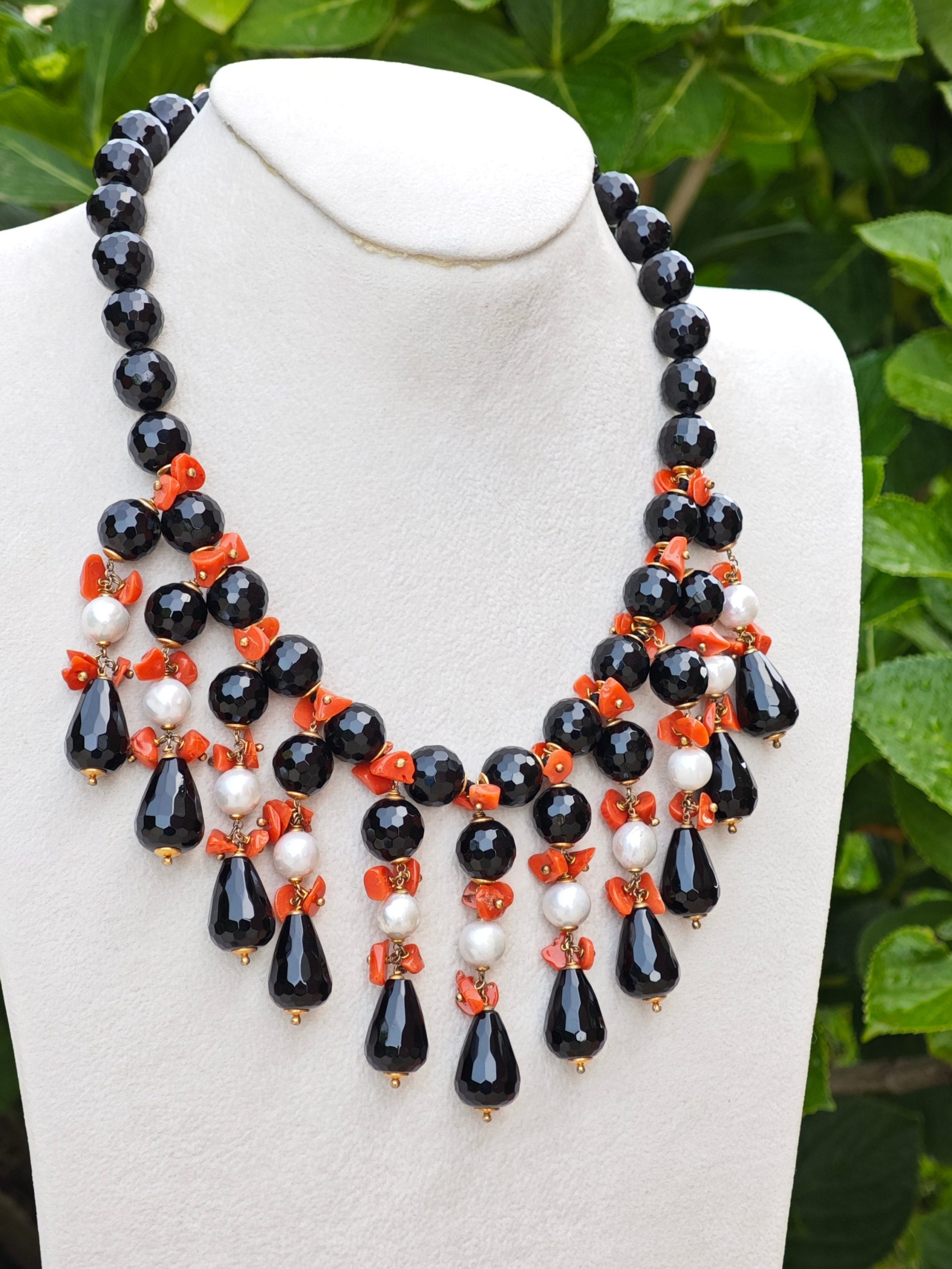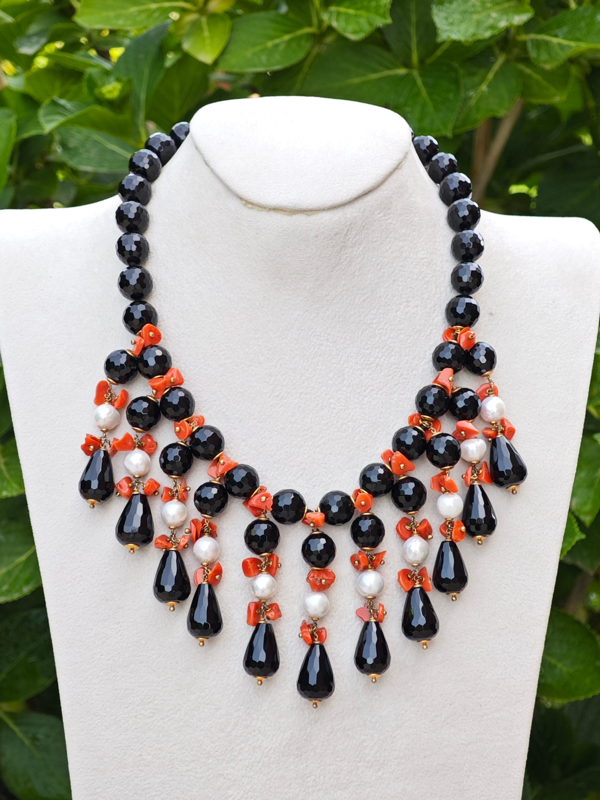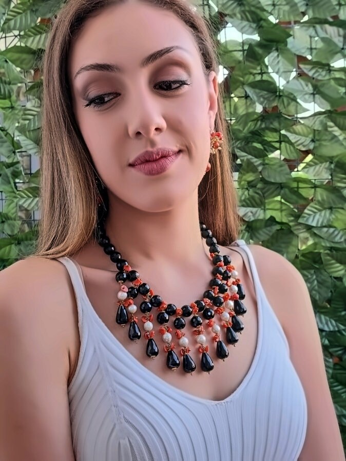 Collana girocollo con pietre dure tonde e a goccia sfaccettate onice nero , perle bianche e corallo rosso mediterraneo.