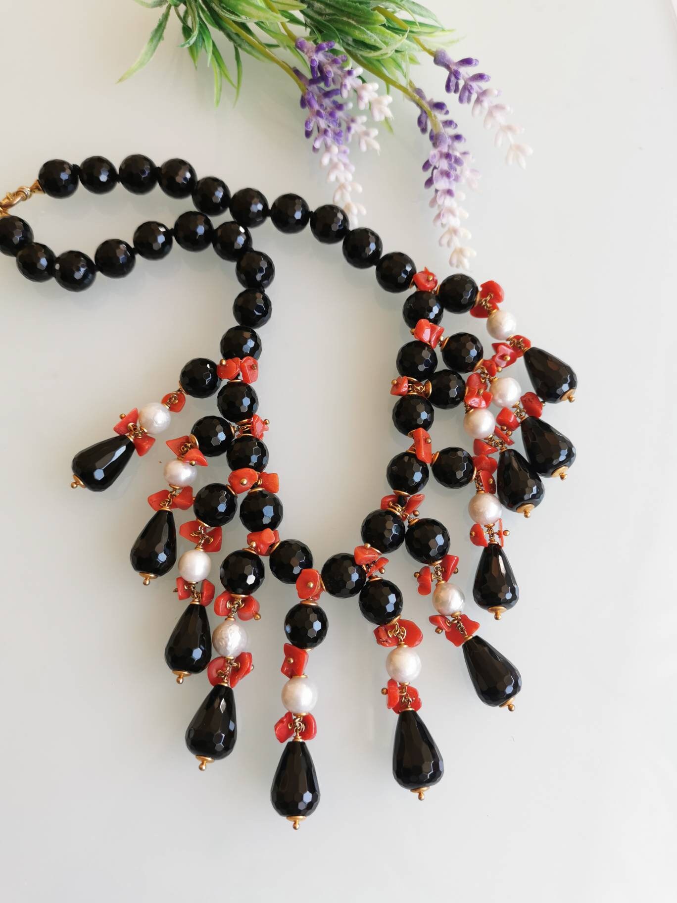 Collana pietre goccia onice nero, perle bianche e corallo rosso mediterraneo, collana girocollo