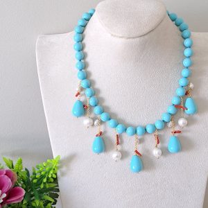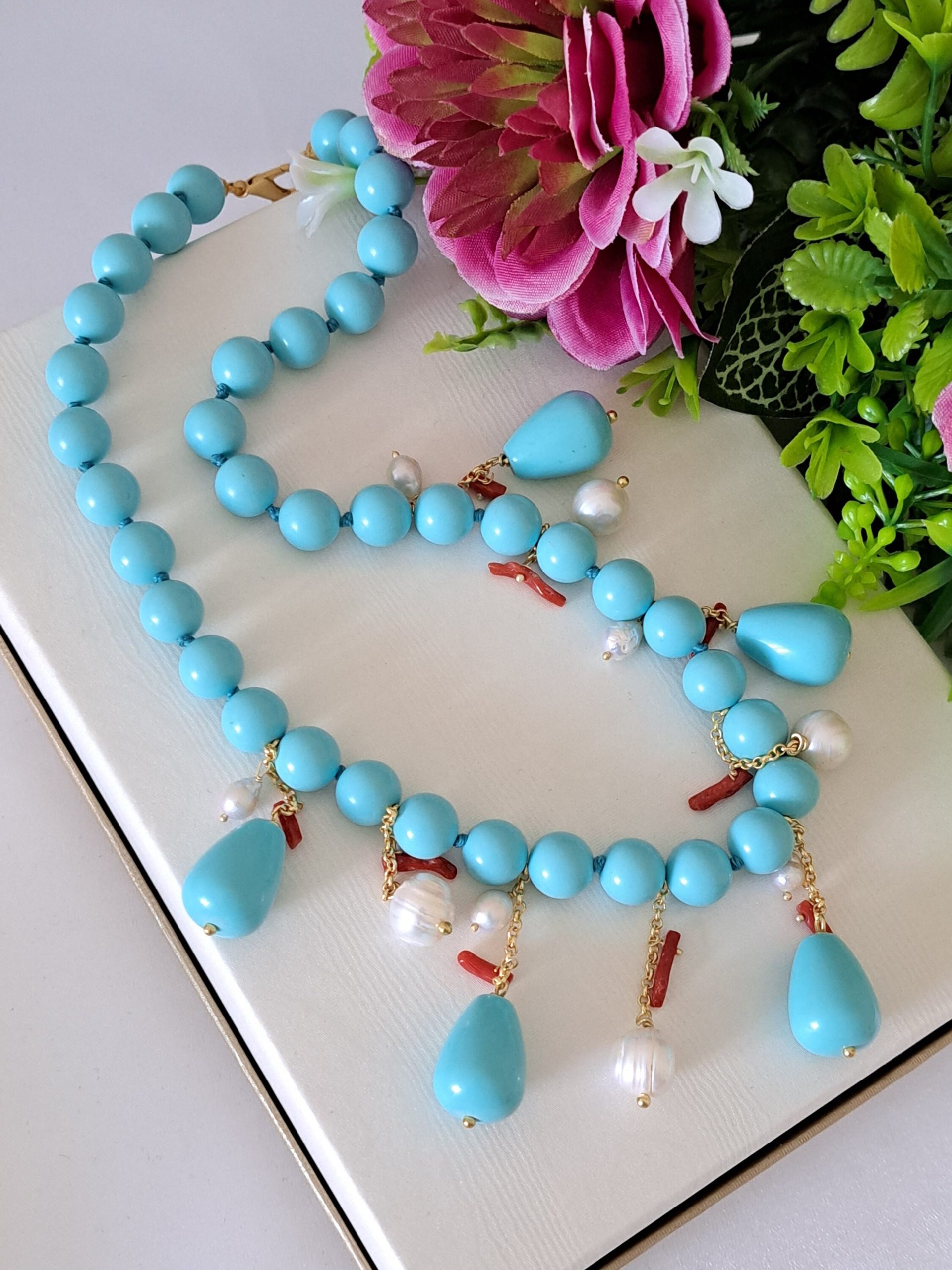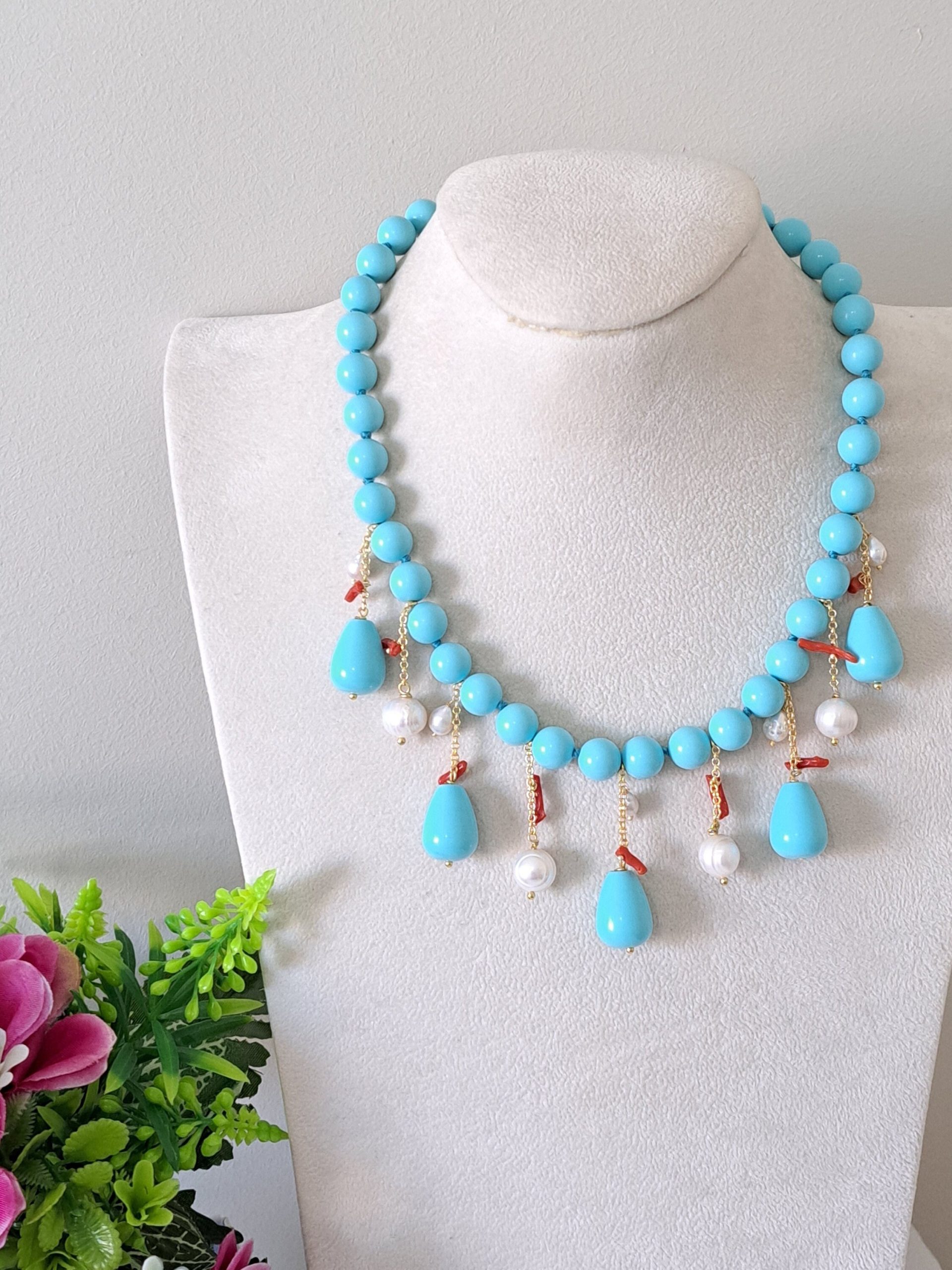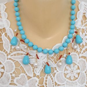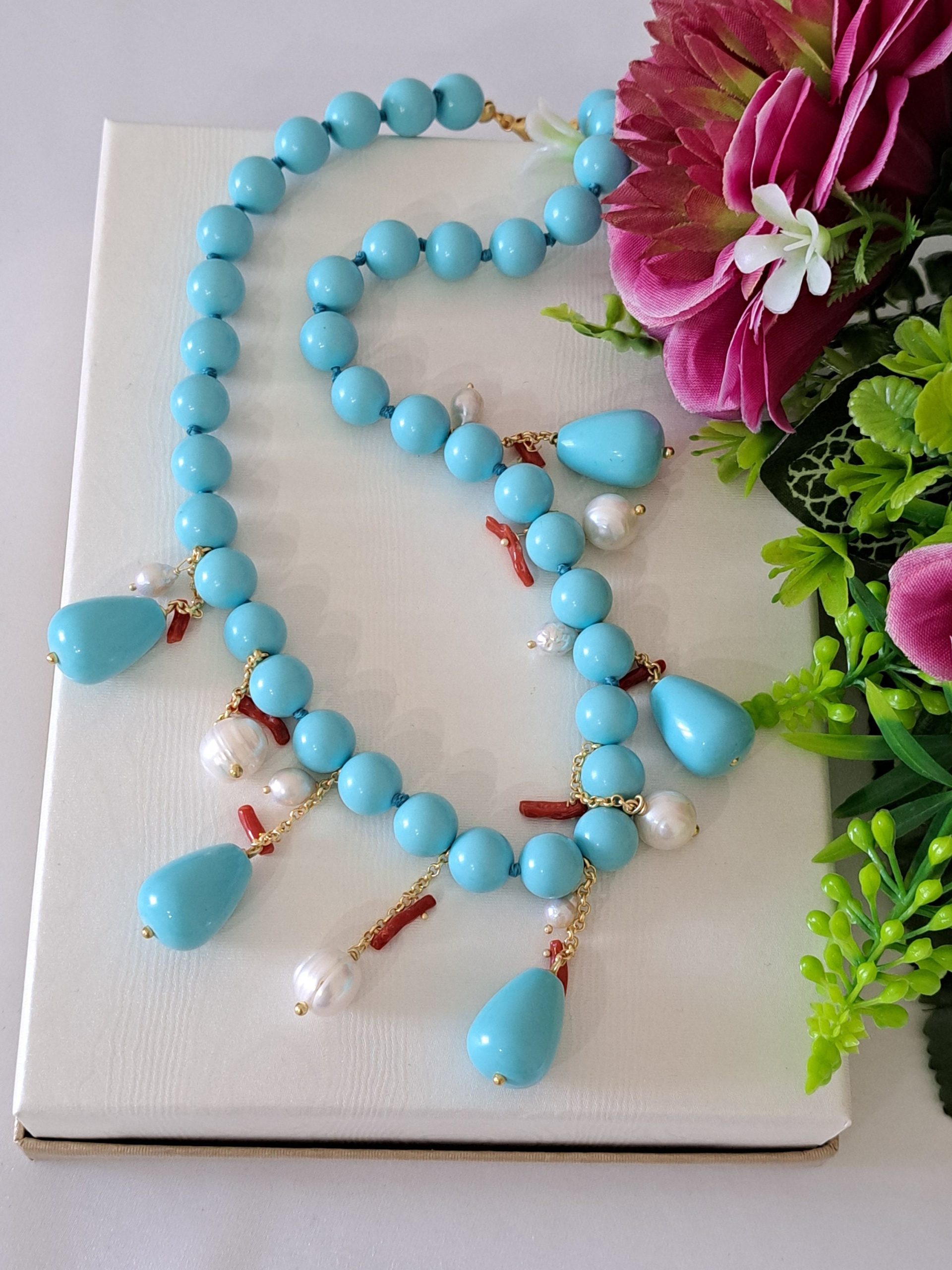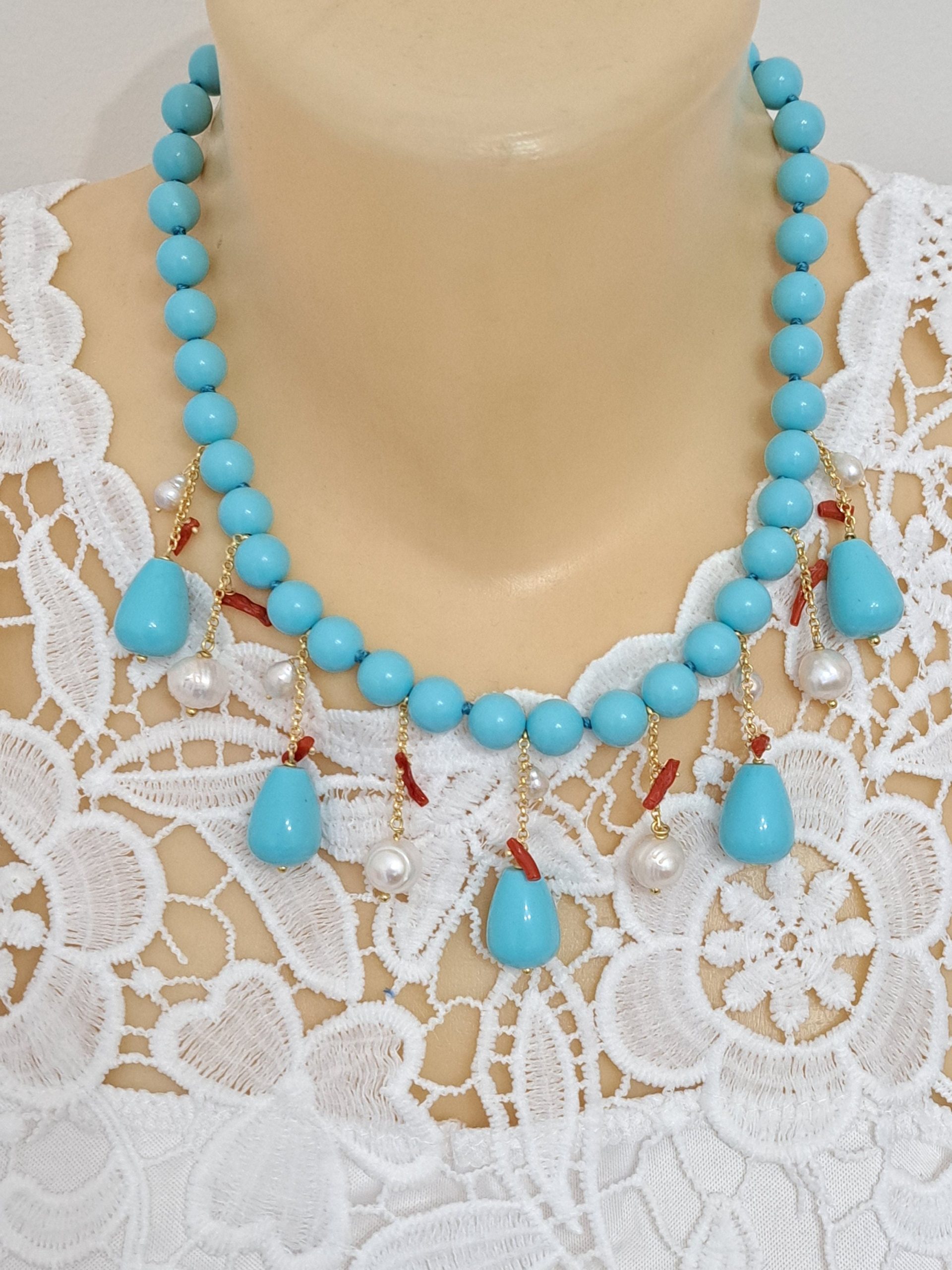 Collana realizzata con perle pasta di turchese imitazione 10 mm annodate a mano con pendenti gocce pasta di turchese, perle bianche naturali e rametti corallo rosso mediterraneo naturale.