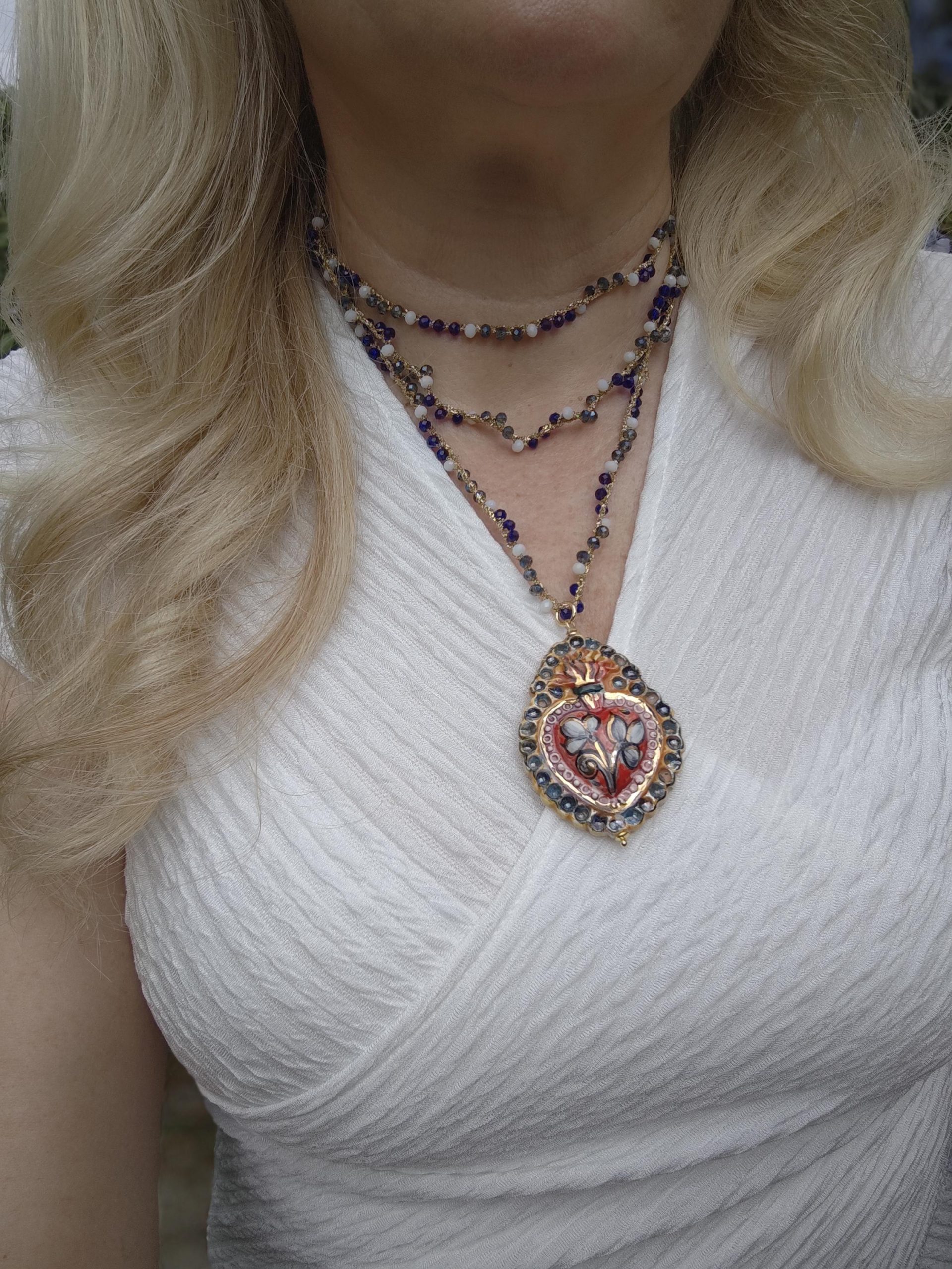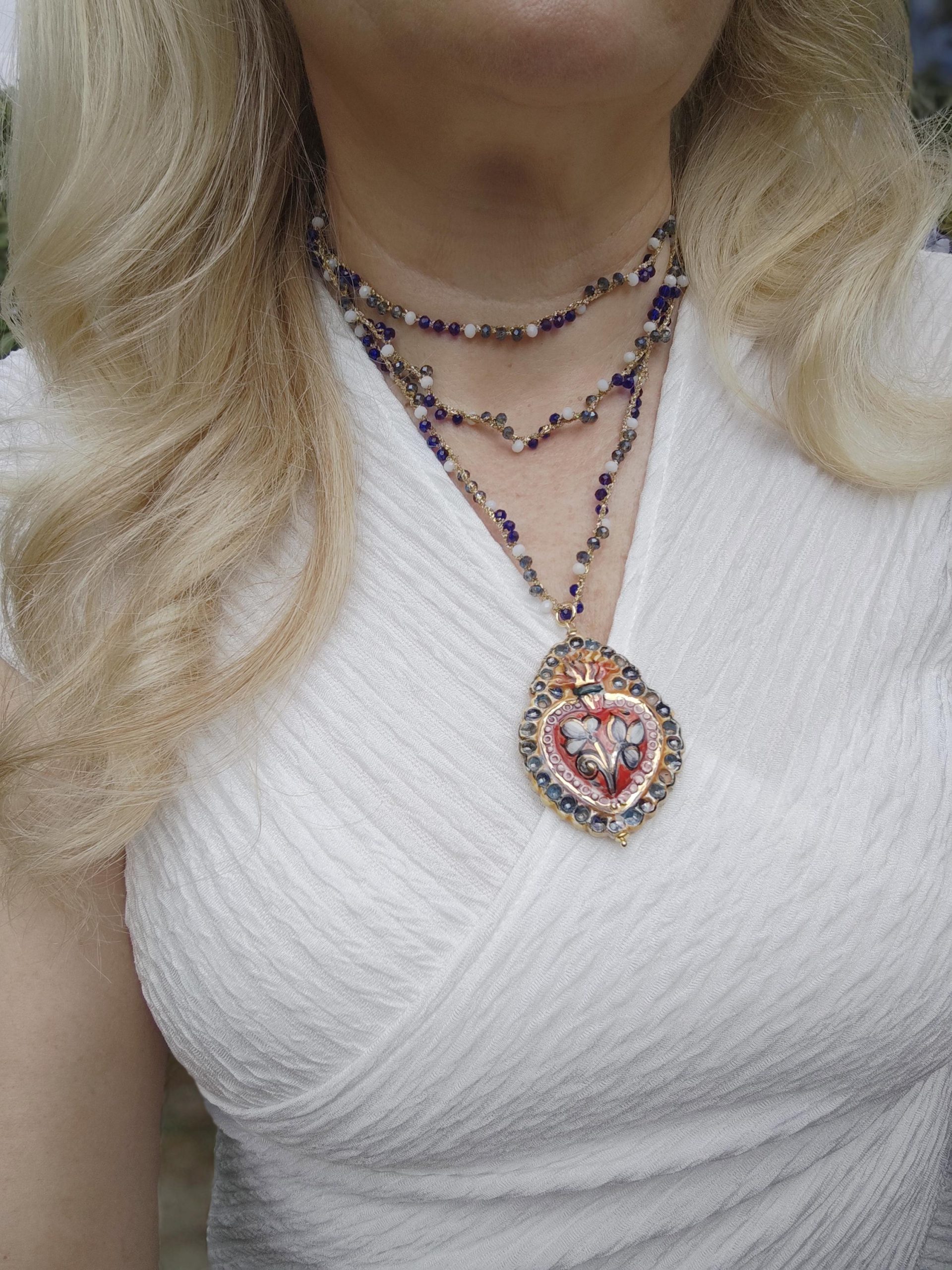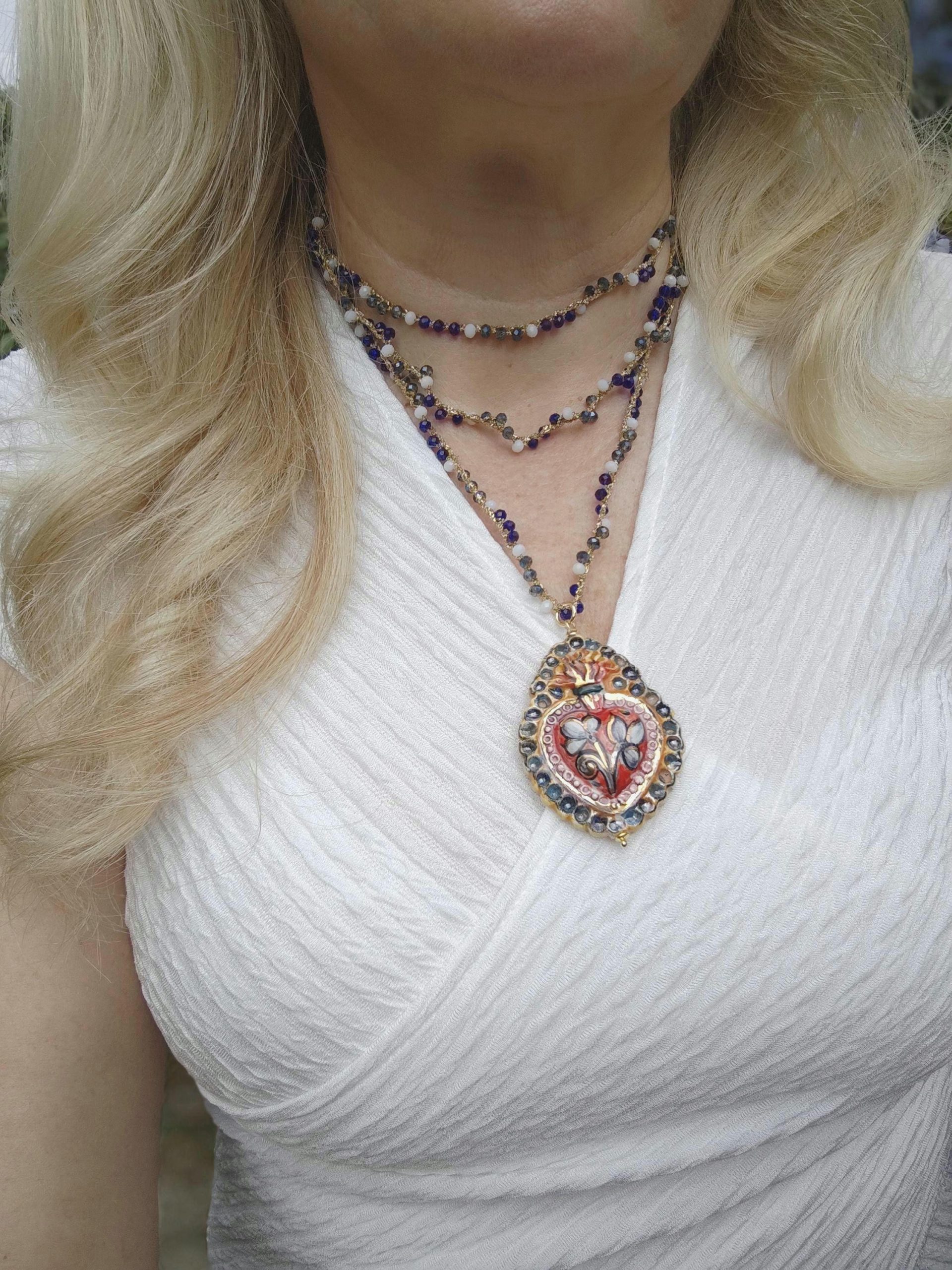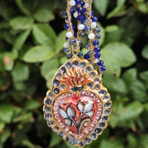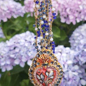 Collana realizzata interamente a mano con filo lurex dorato e cristalli multicolori e con pendente Cuore Sacro in ceramica di Caltagirone realizzata e dipinta a mano, con applicazioni foglia oro 22 kt, 5×4 cm dimensioni .