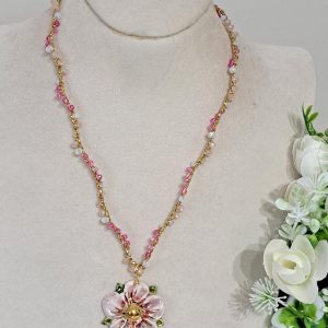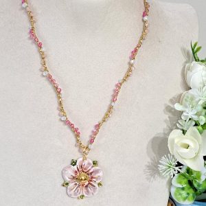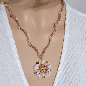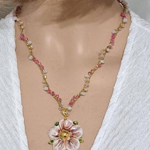 Al centro della collana spicca un pendente in ceramica di Caltagirone, modellato a forma di fiore. Il fiore è decorato a mano con smalti dai colori delicati: risa,bianco e accenti dorati che ne esaltano i dettagli e l’artigianalità. Diametro fiore 3 cm.