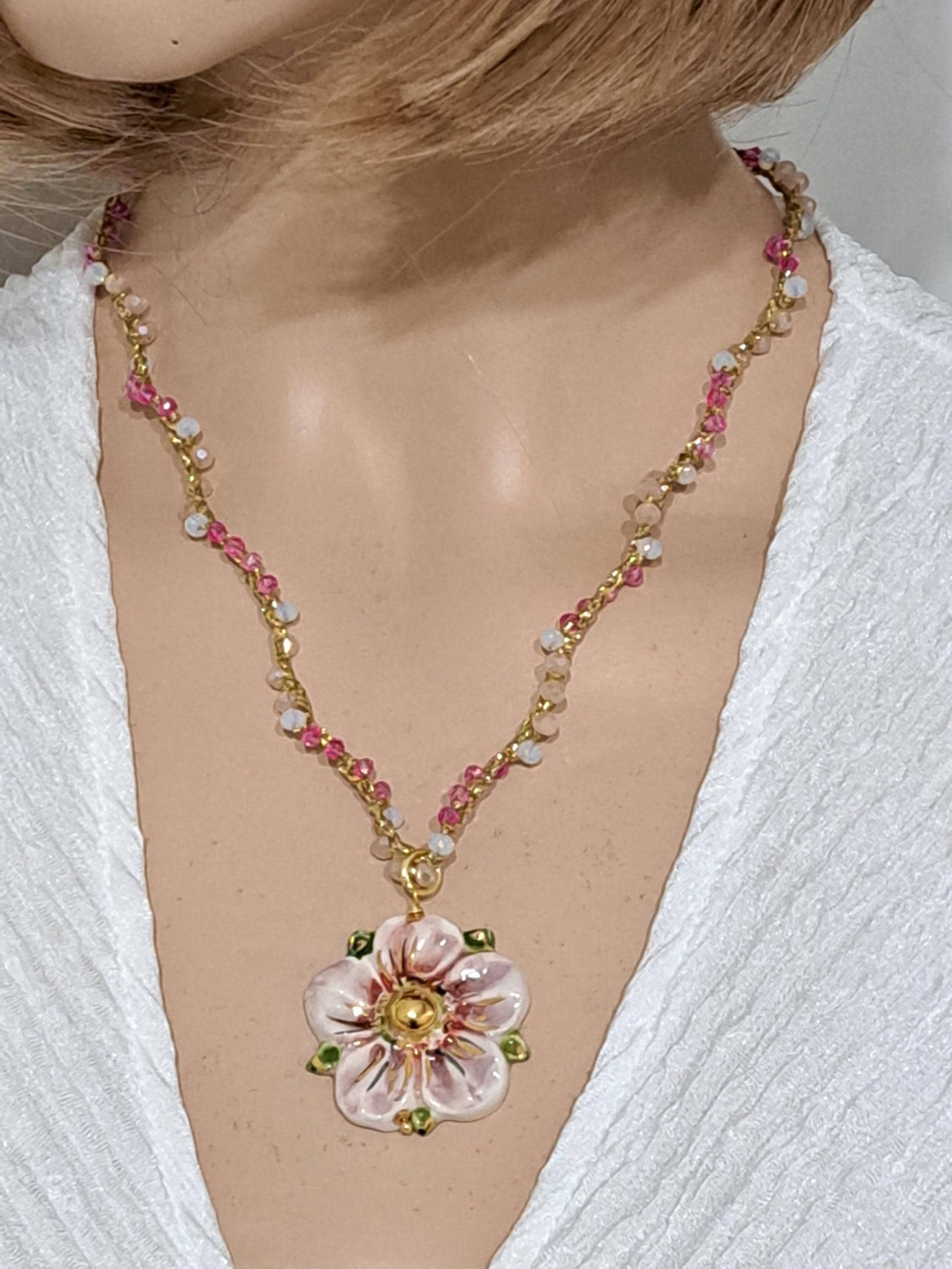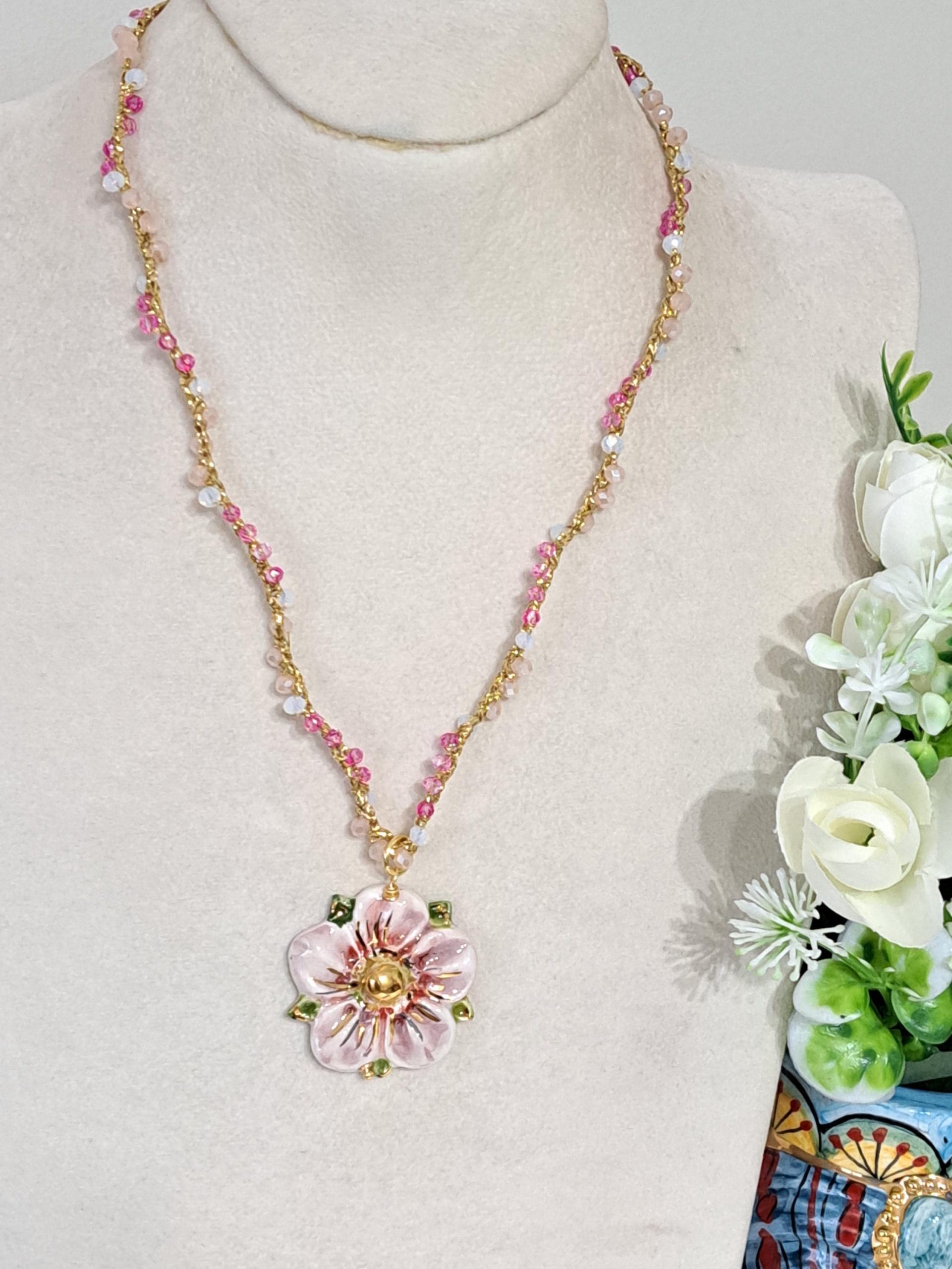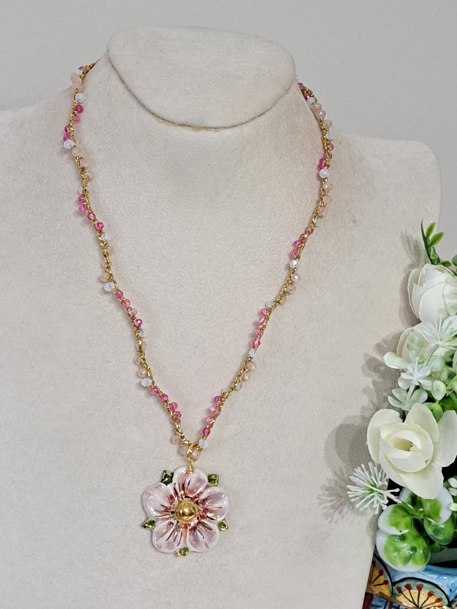 Collana SAKURA con fiore in ceramica di Caltagirone e cristalli , collana siciliana