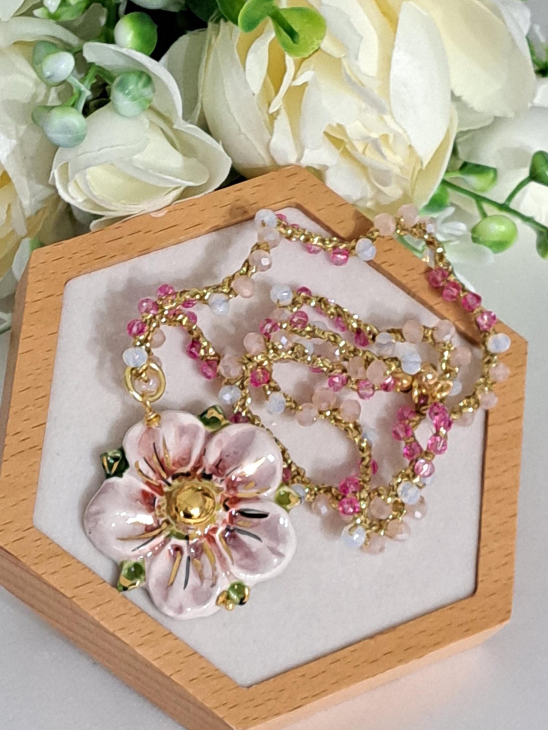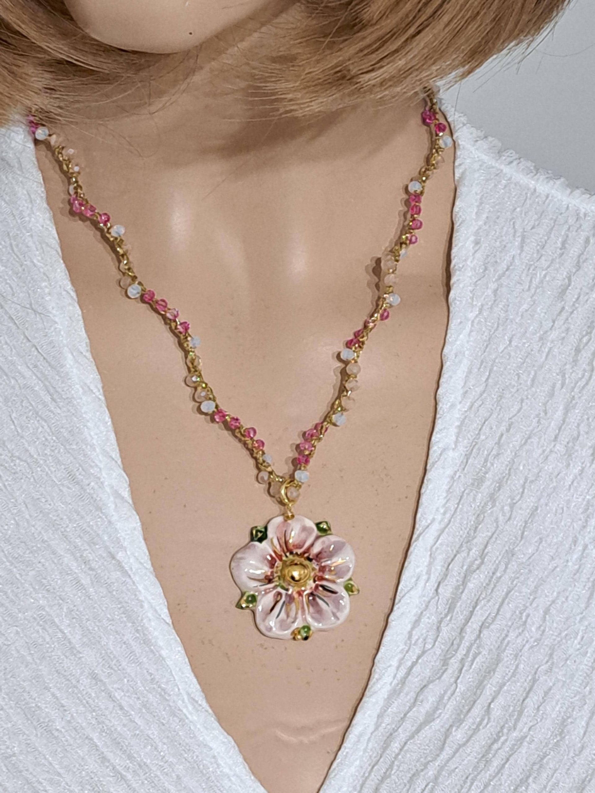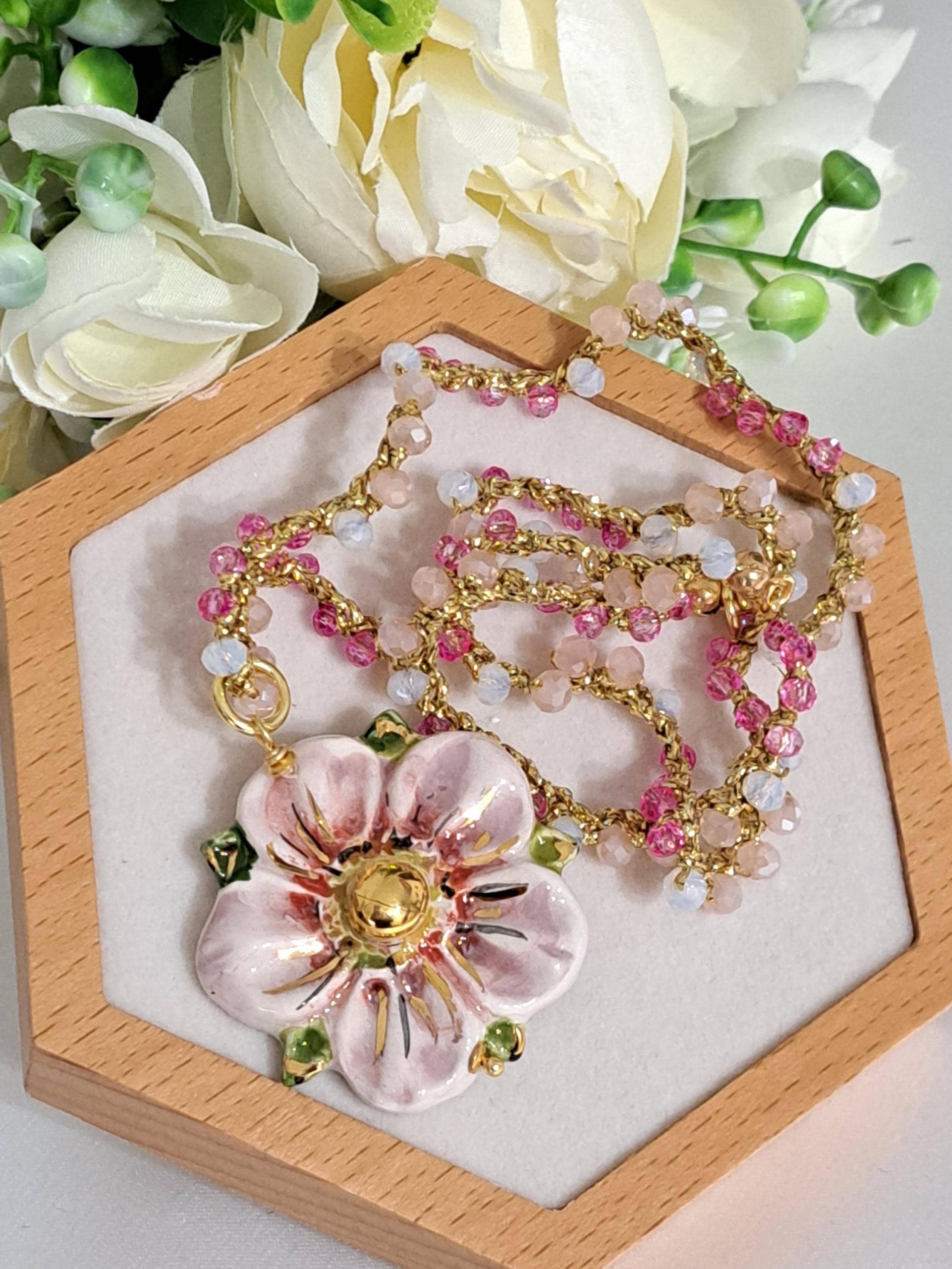 Collana SAKURA con fiore in ceramica di Caltagirone e cristalli , collana siciliana