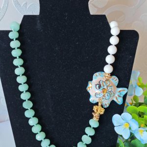 Collana pesce ceramica di Caltagirone con pietre dure amazzonite e corallo bianco, collana siciliana