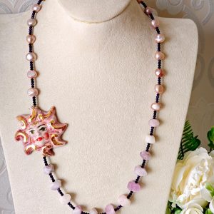 Collana Sole ceramica di Caltagirone con pietre dure kunzite e perle malva, collana siciliana