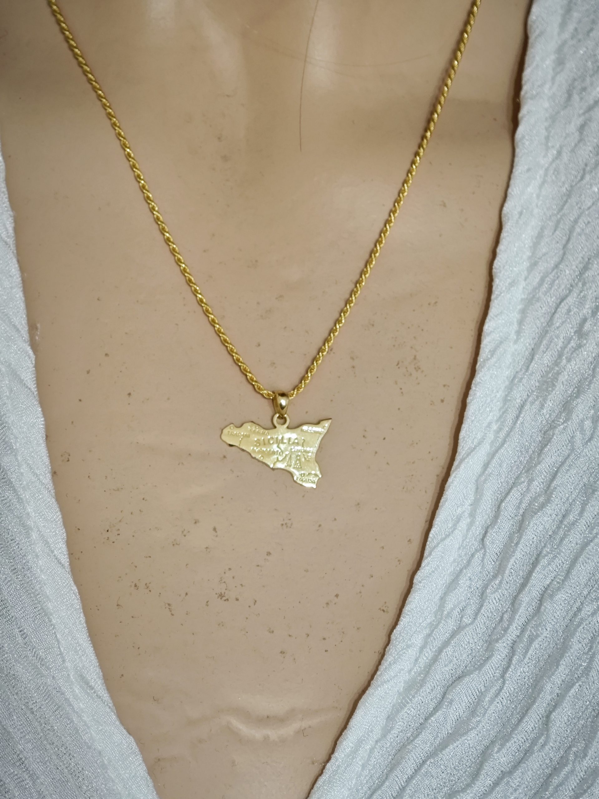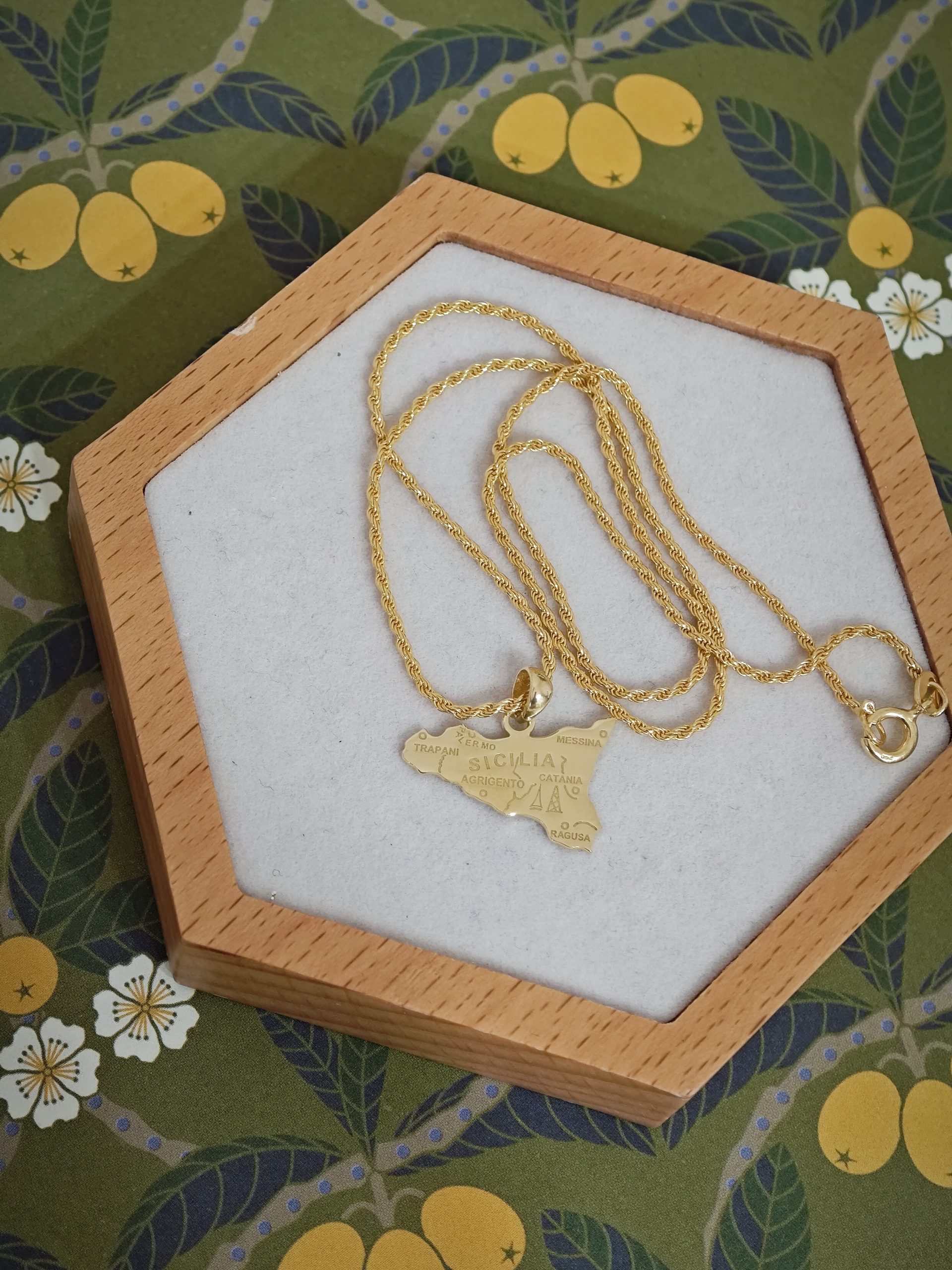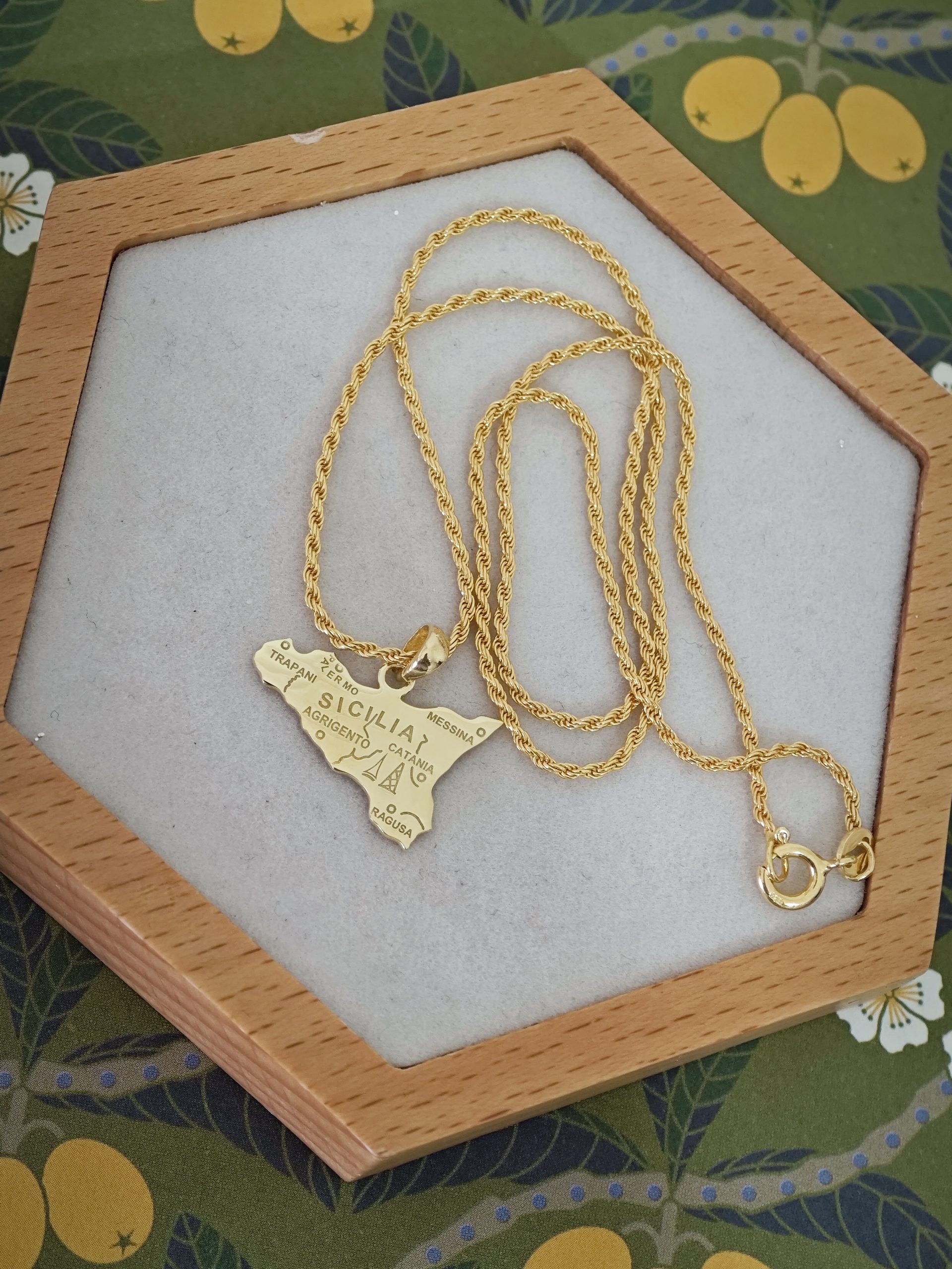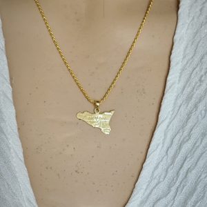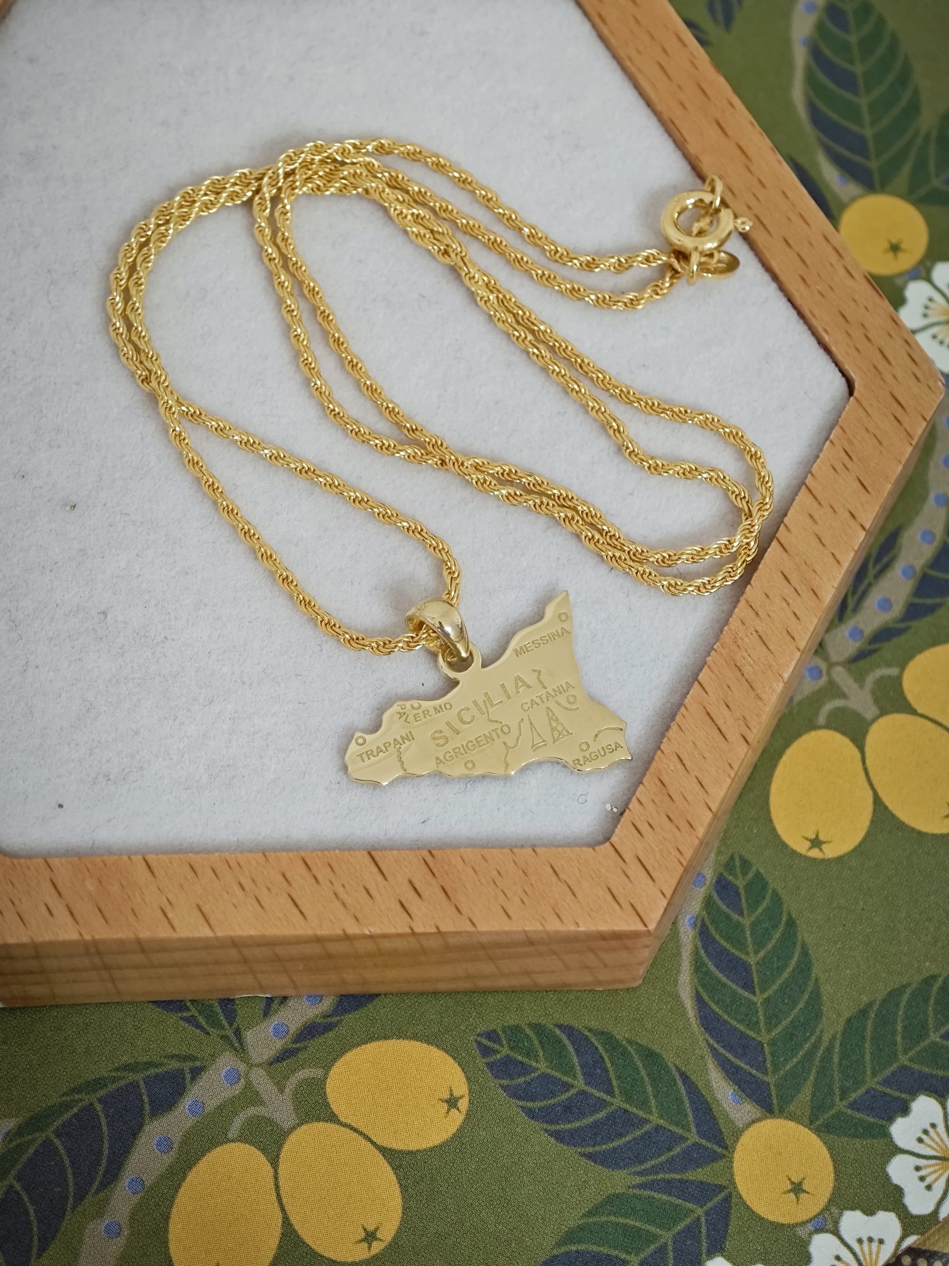 Collana girocollo a corda in argento 925 placcato oro con pendente raffigurante Sicilia con nomi incisi delle città siciliane.