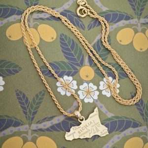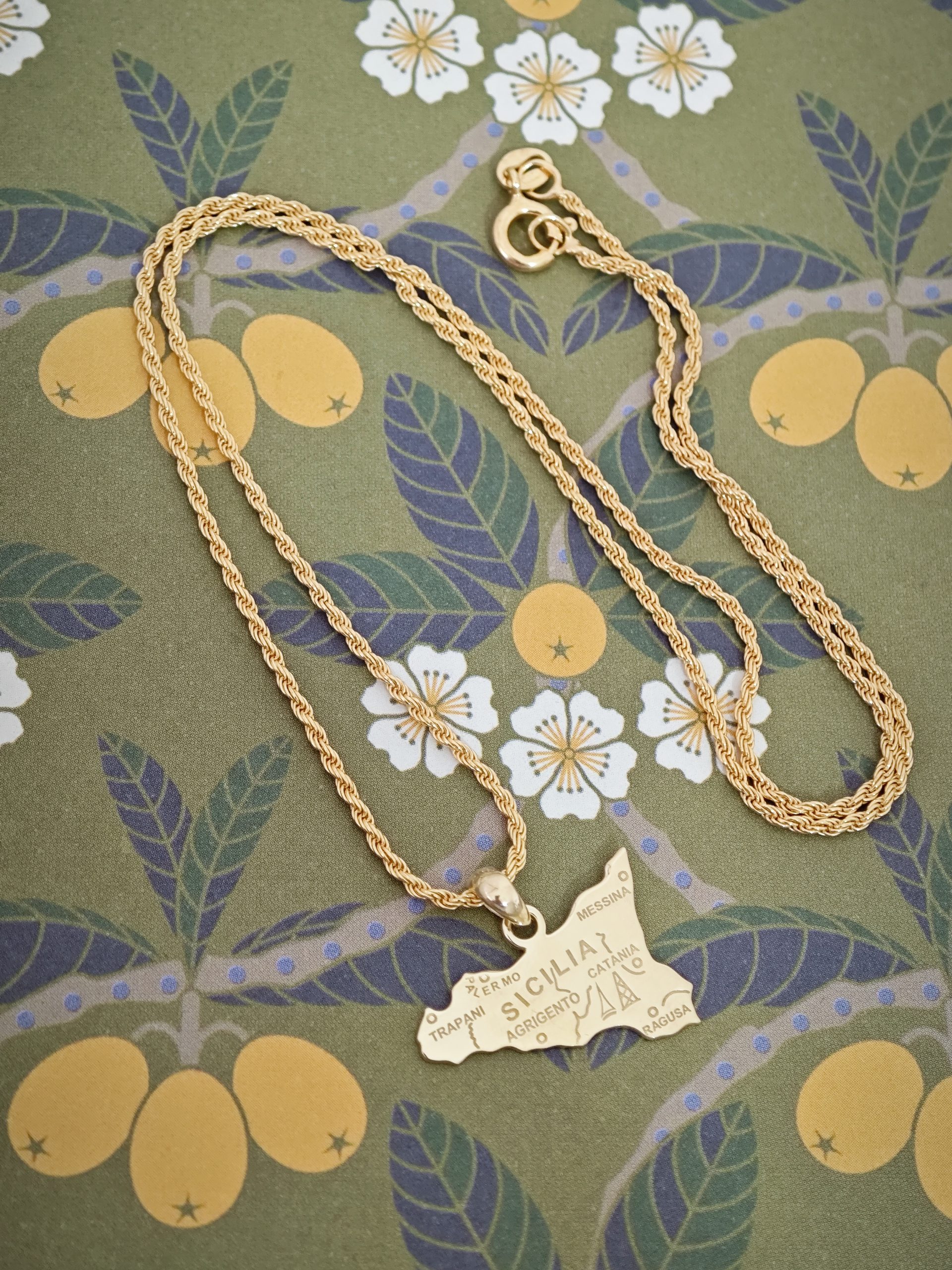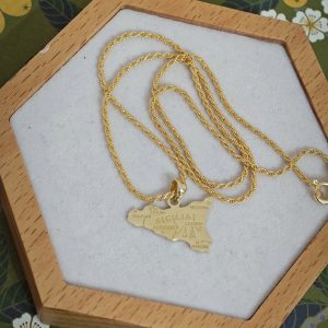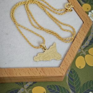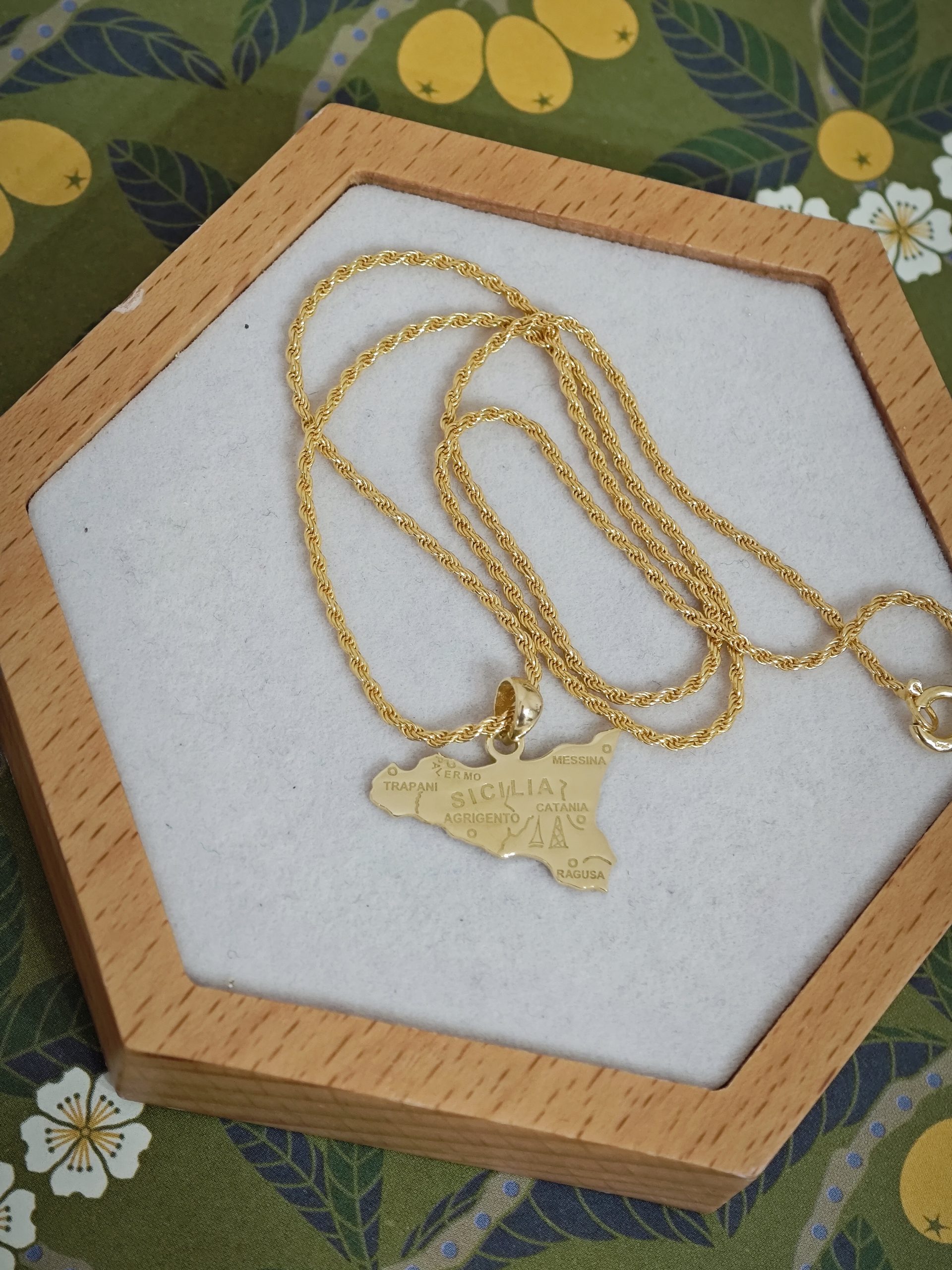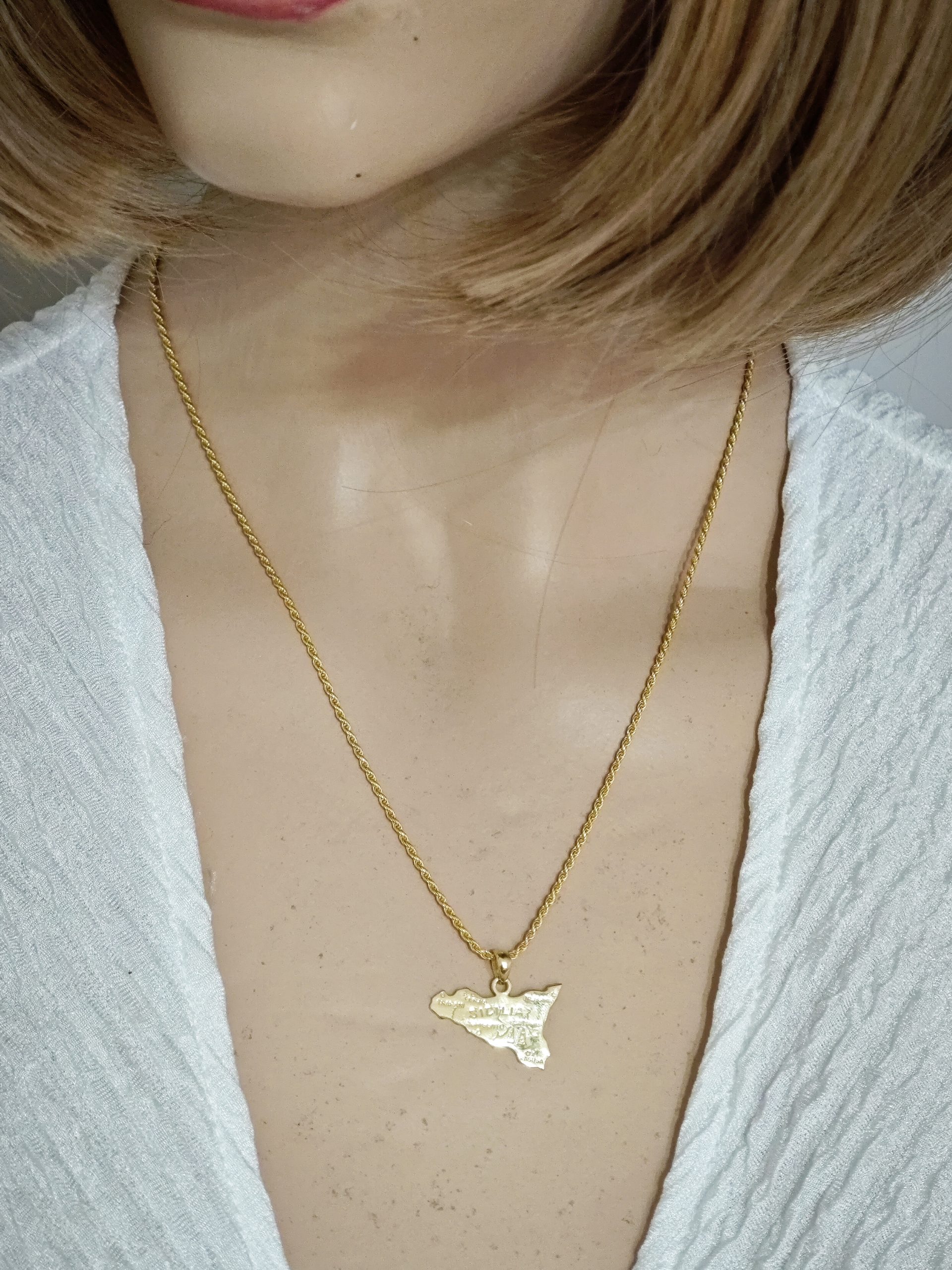 Collana girocollo a corda in argento 925 placcato oro con pendente raffigurante Sicilia con nomi incisi delle città siciliane.