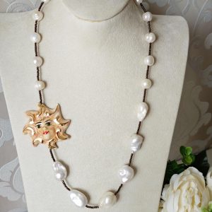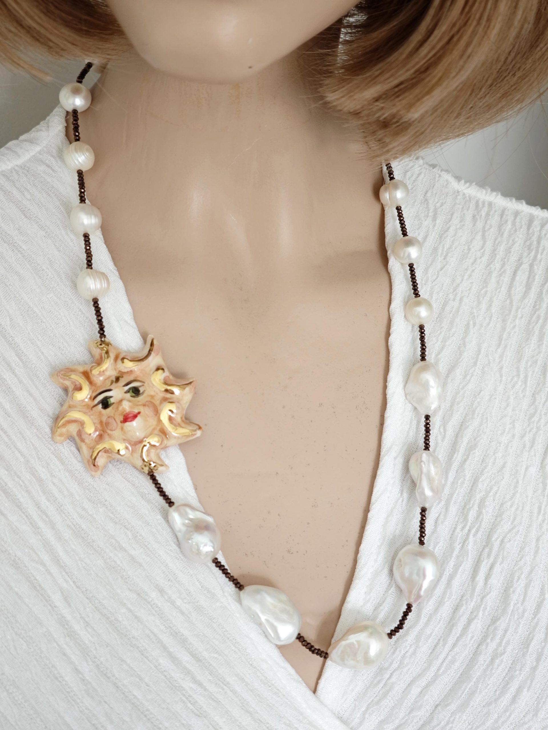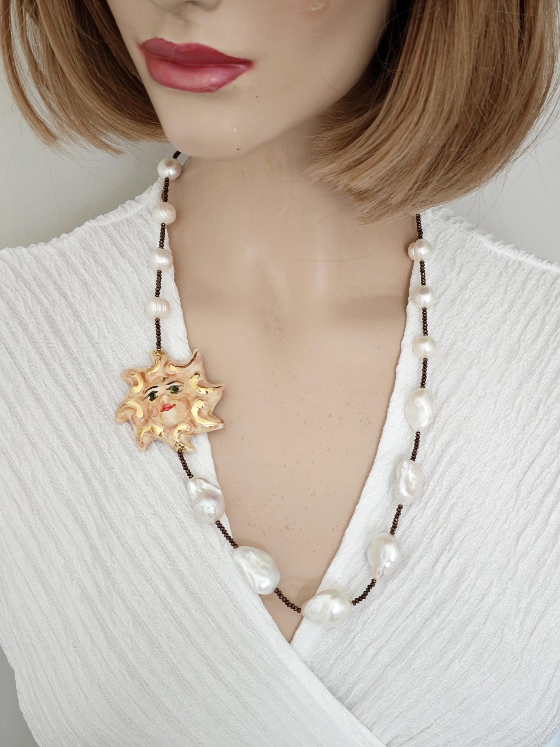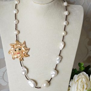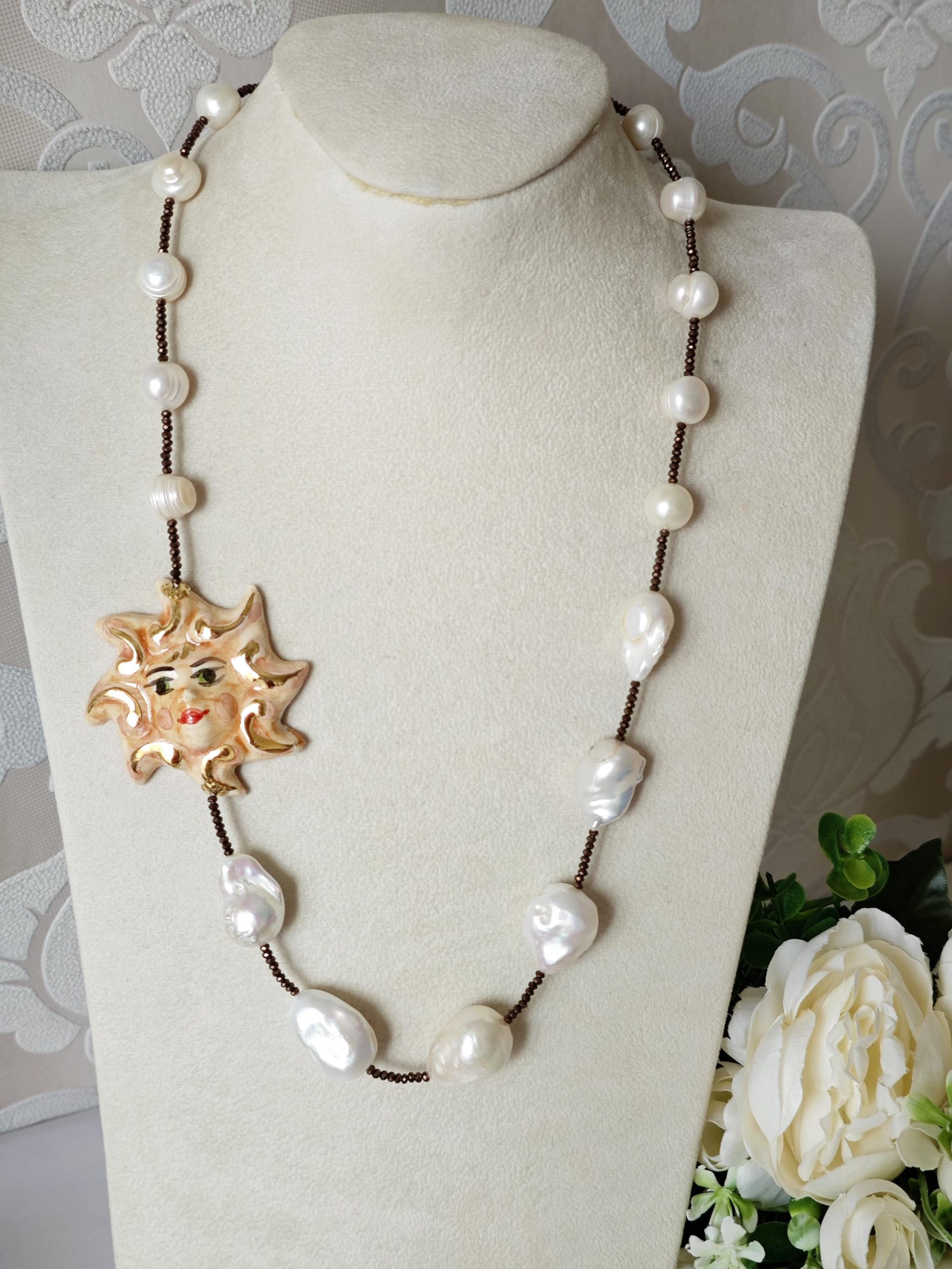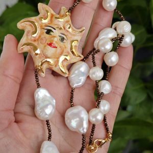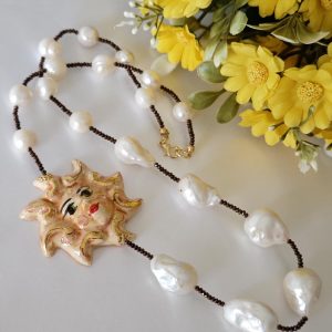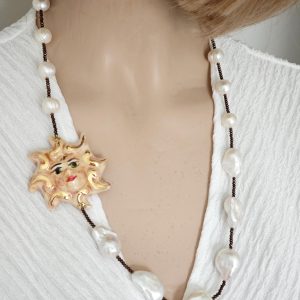 Collana realizzata con perle naturali di acqua dolce be perle bianche barocche ,cristalli marroni e con Sole in ceramica di Caltagirone realizzata e dipinta a mano con applicazioni foglia oro 22 kt, 5 cm diametro .