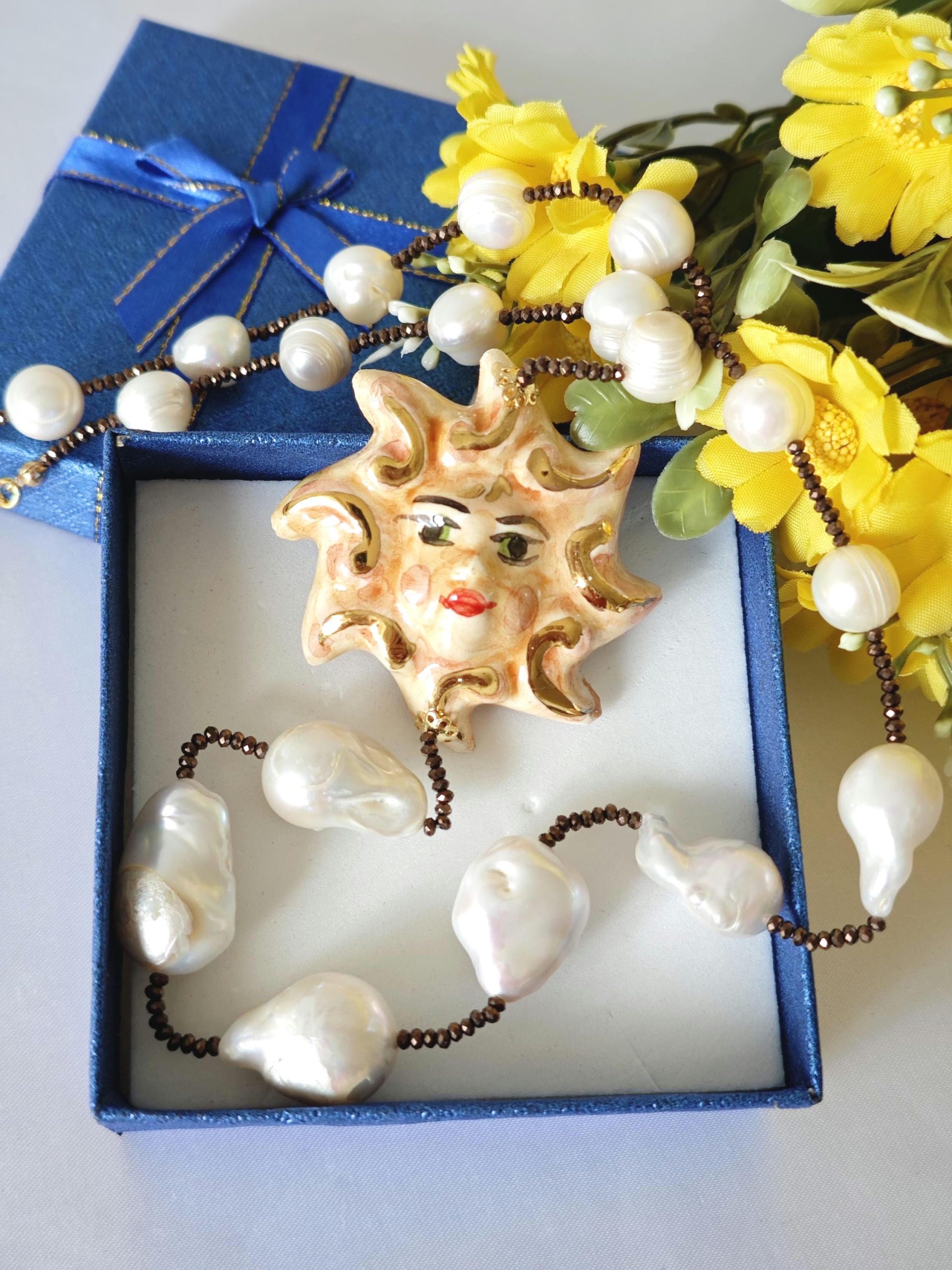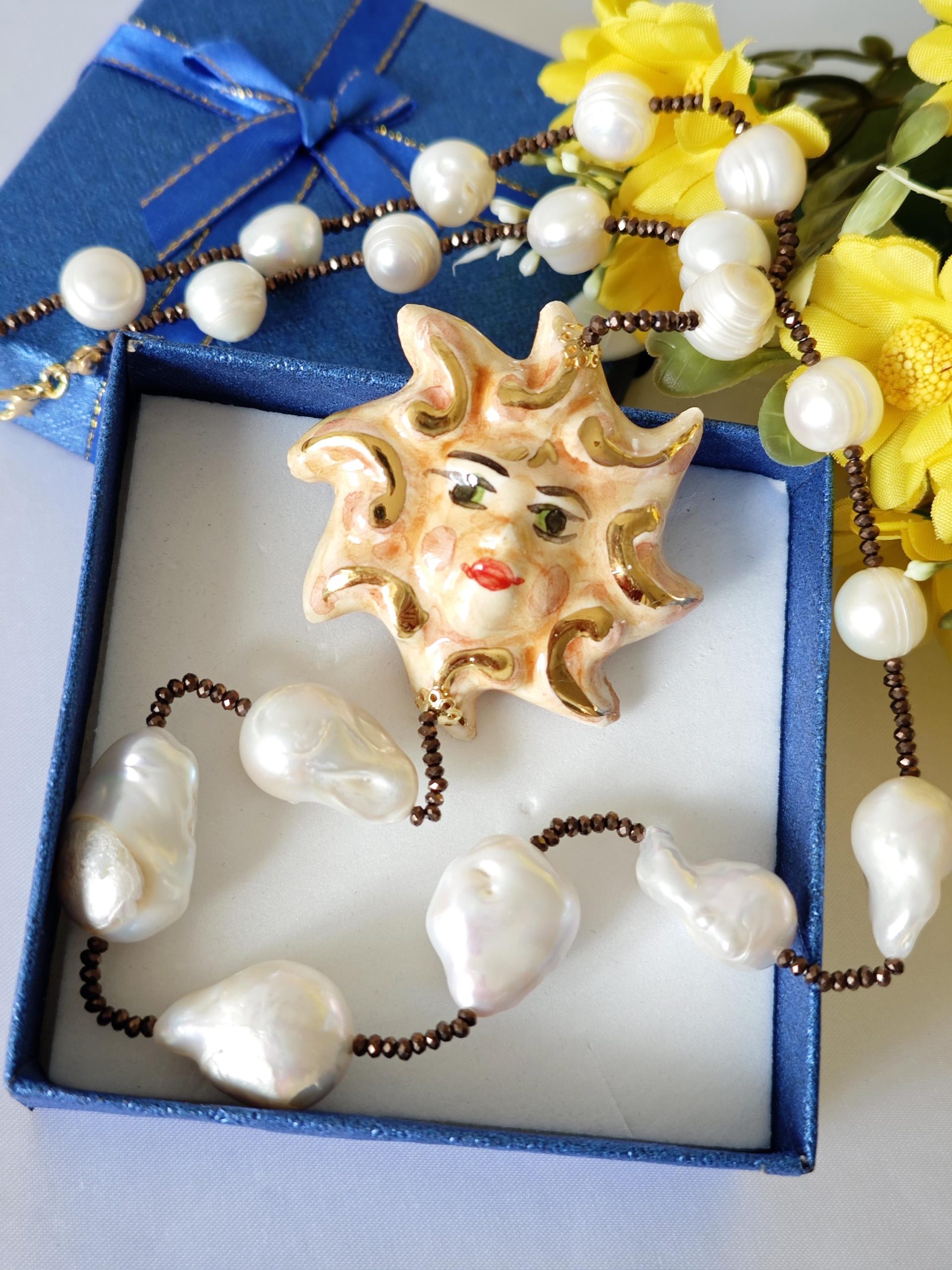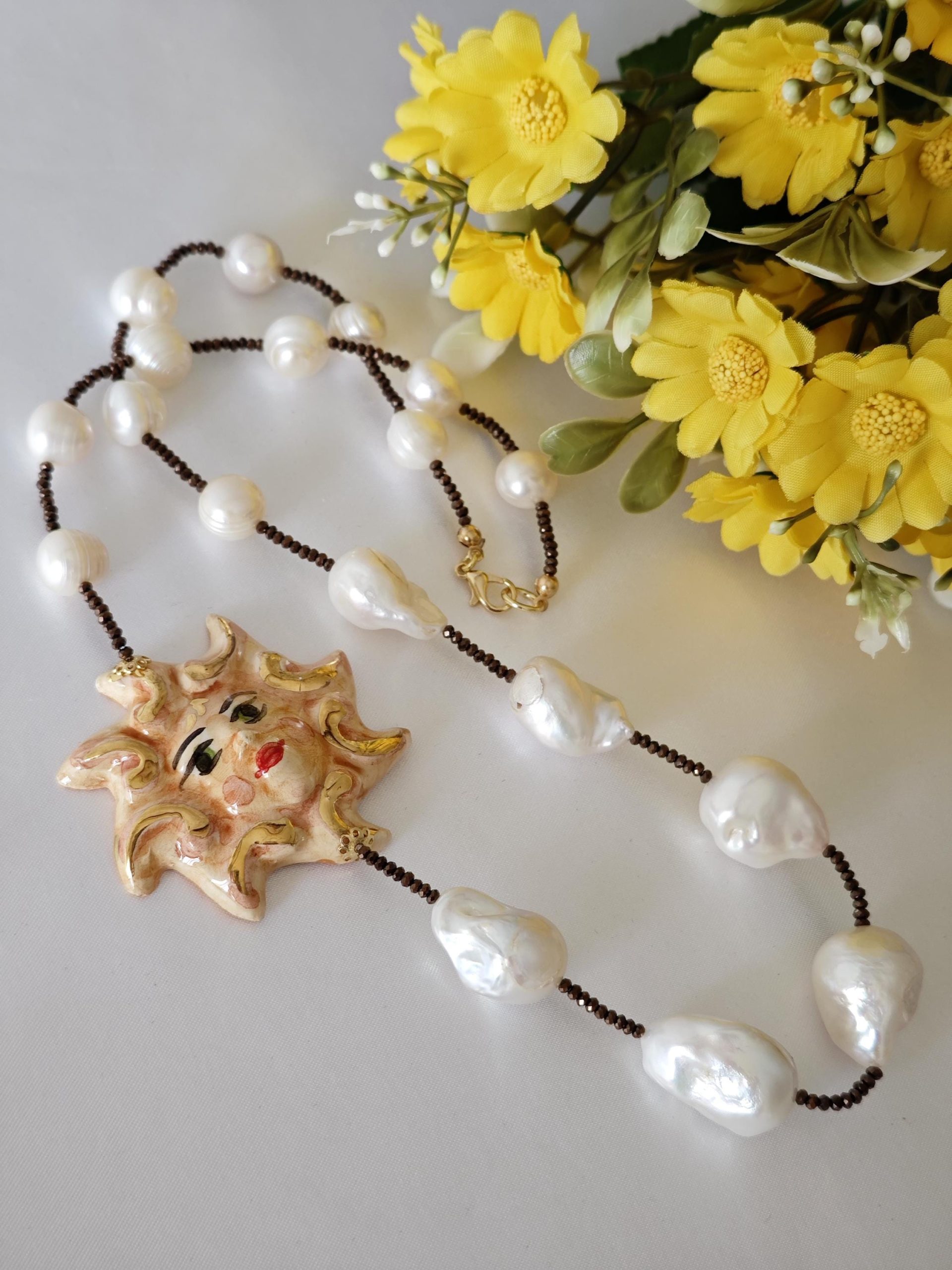 Collana Sole ceramica di Caltagirone con perle bianche barocche , collana siciliana