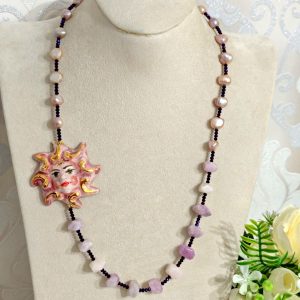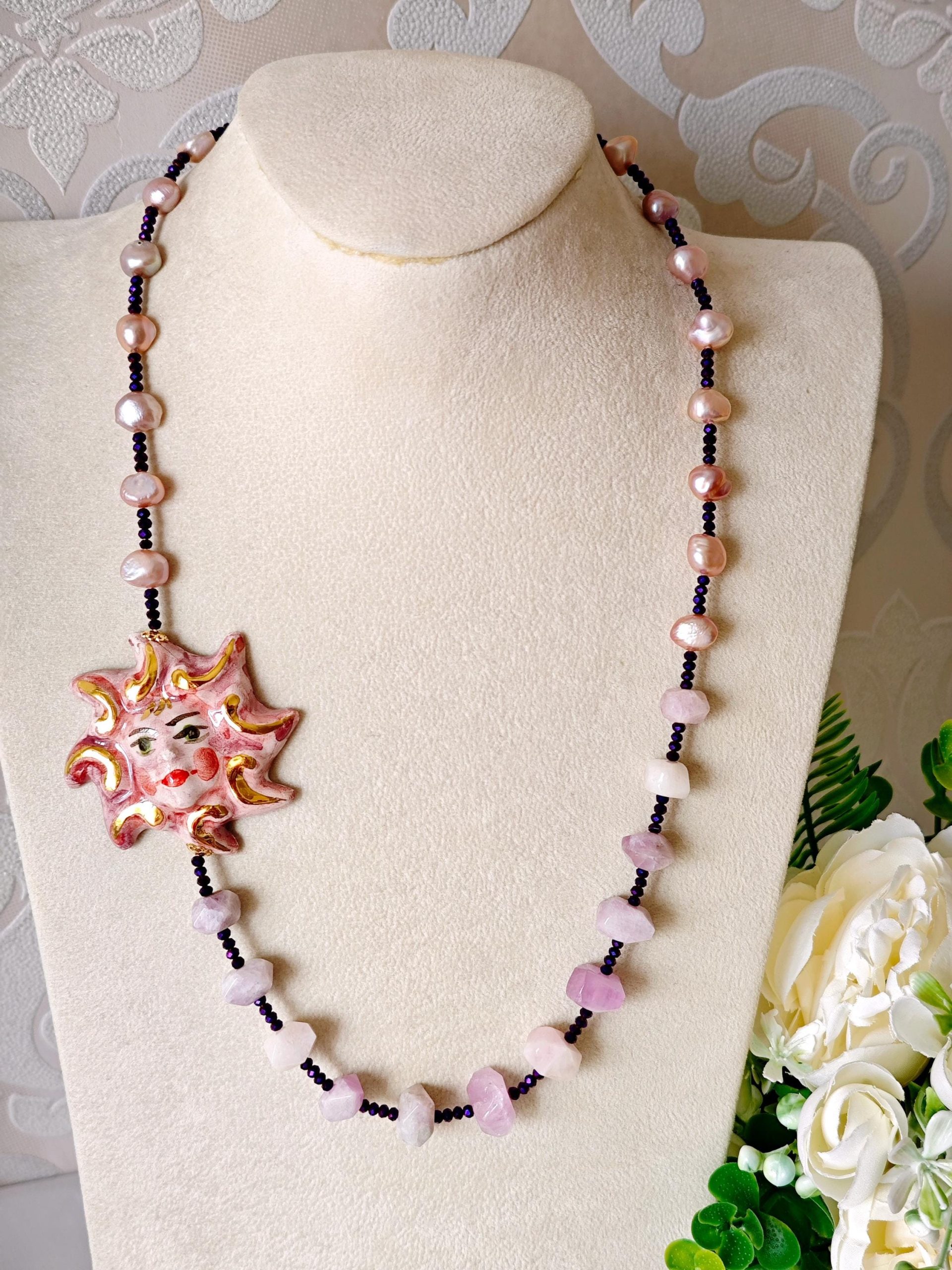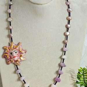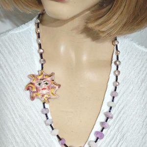 Collana Sole ceramica di Caltagirone con pietre dure kunzite e perle malva, collana siciliana