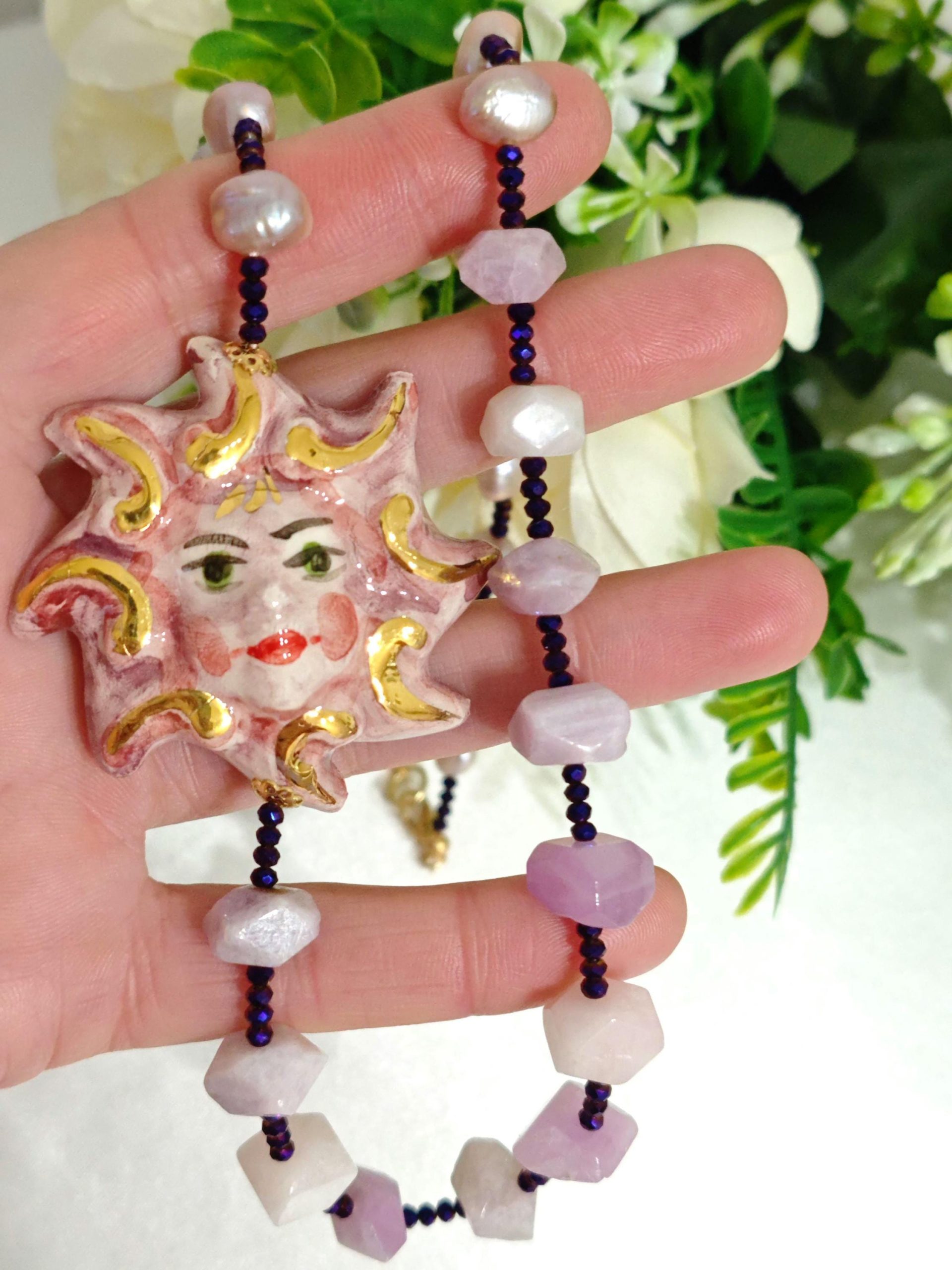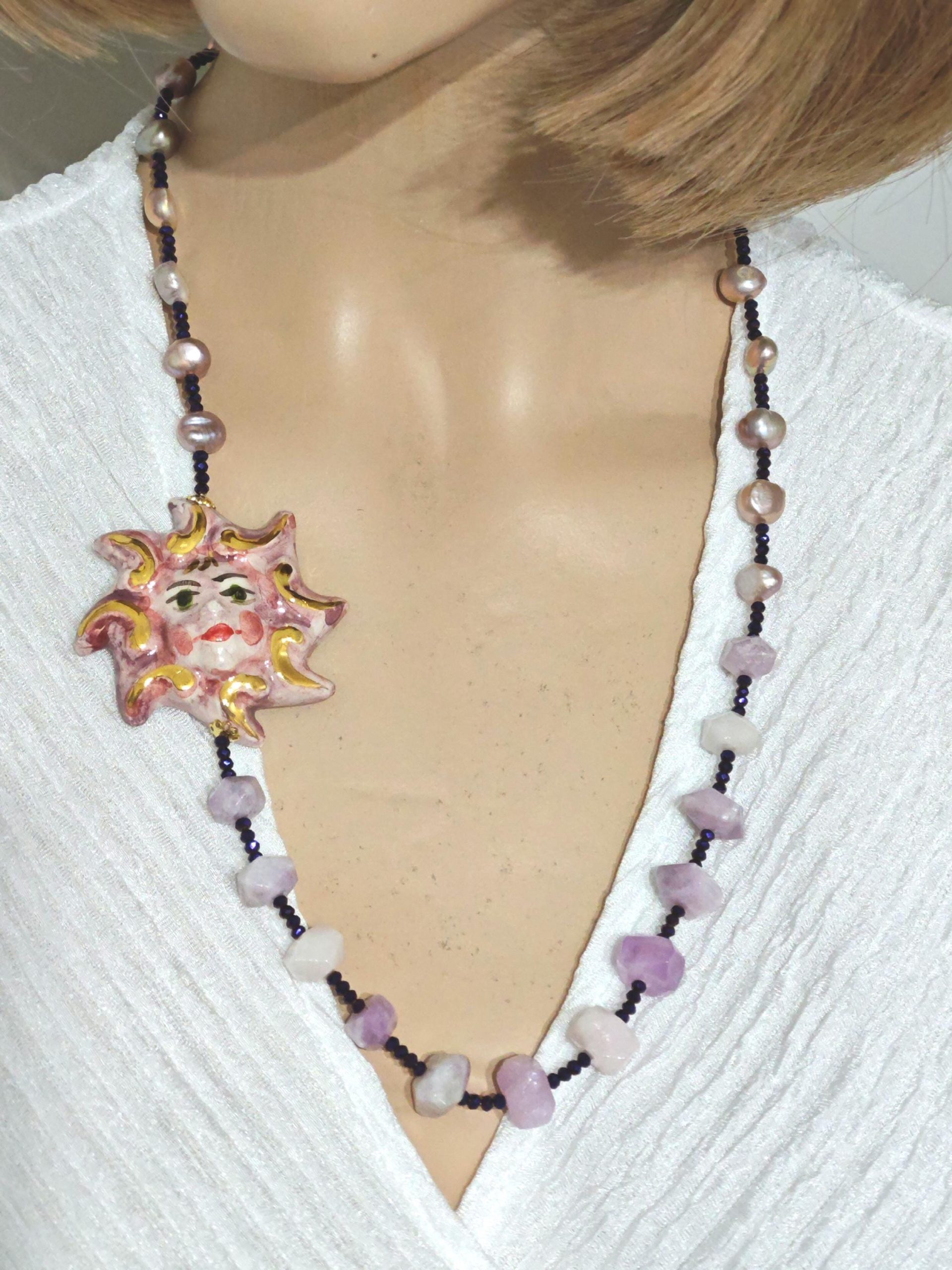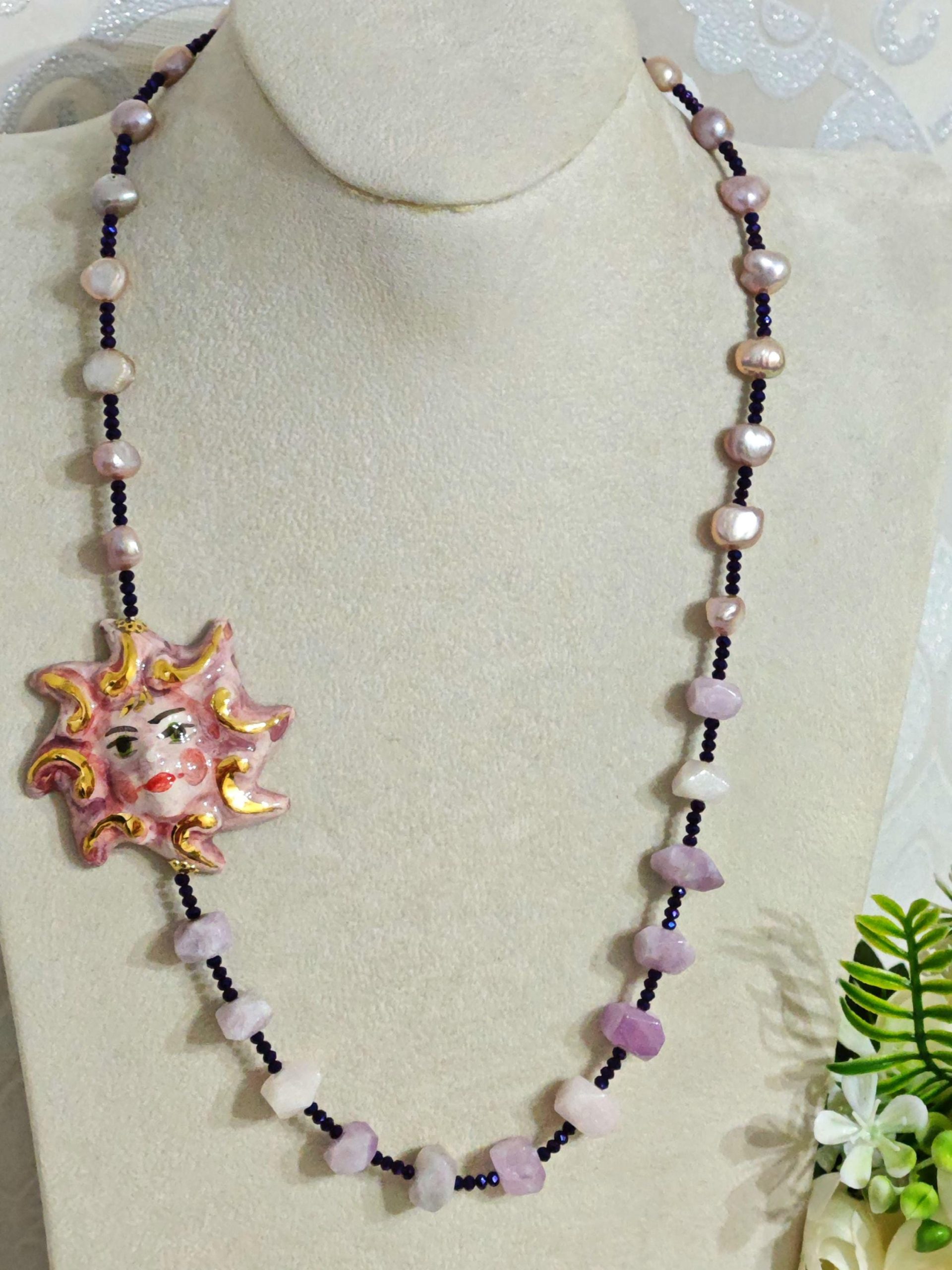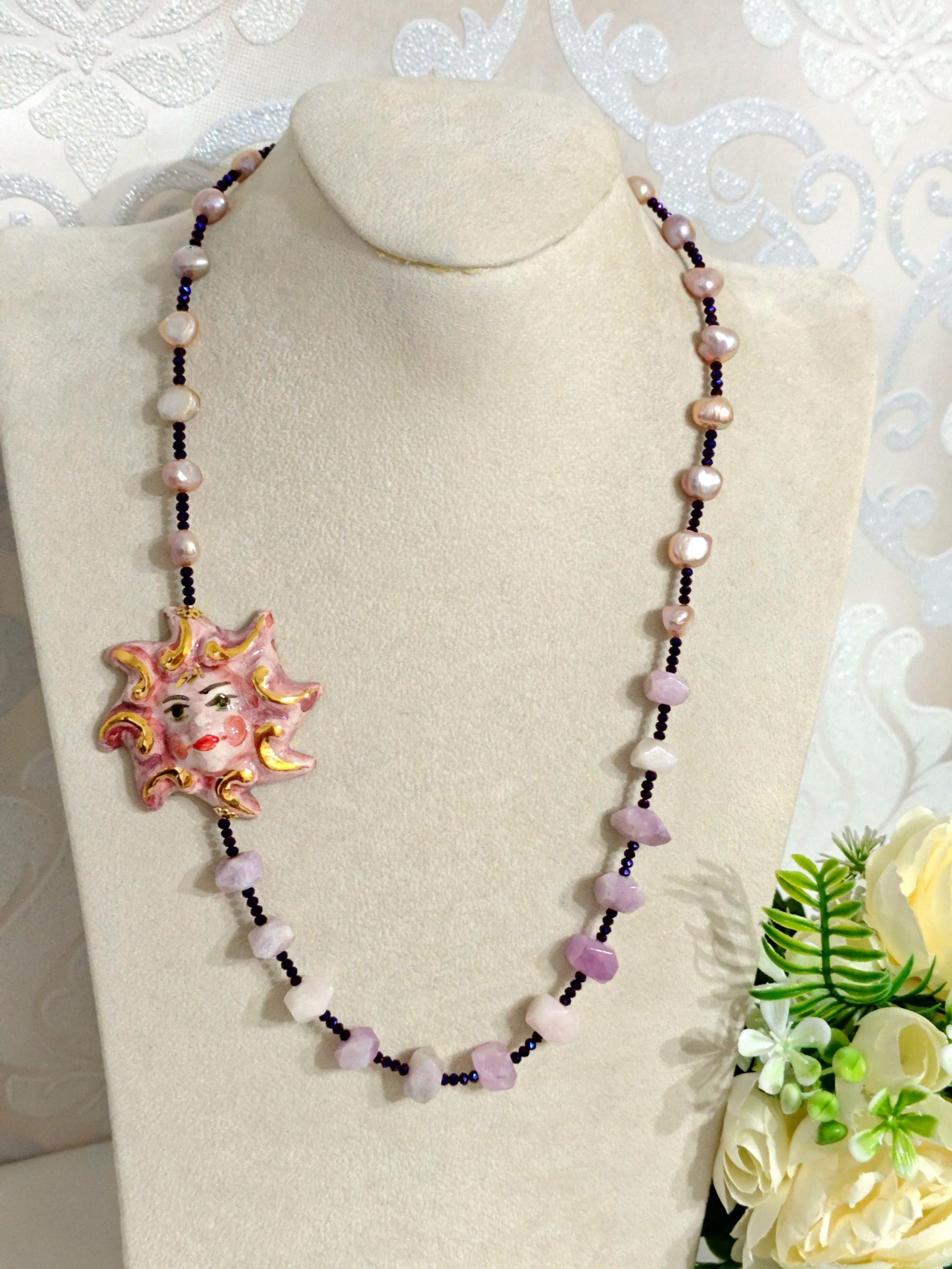 Collana realizzata con pietre dure naturali kunzite, perle naturali colore malva ,cristalli viola e con Sole in ceramica di Caltagirone realizzata e dipinta a mano con applicazioni foglia oro 22 kt, 5 cm diametro .