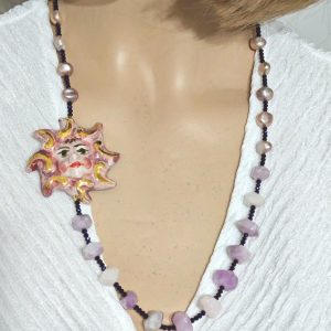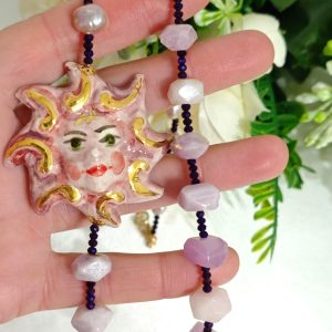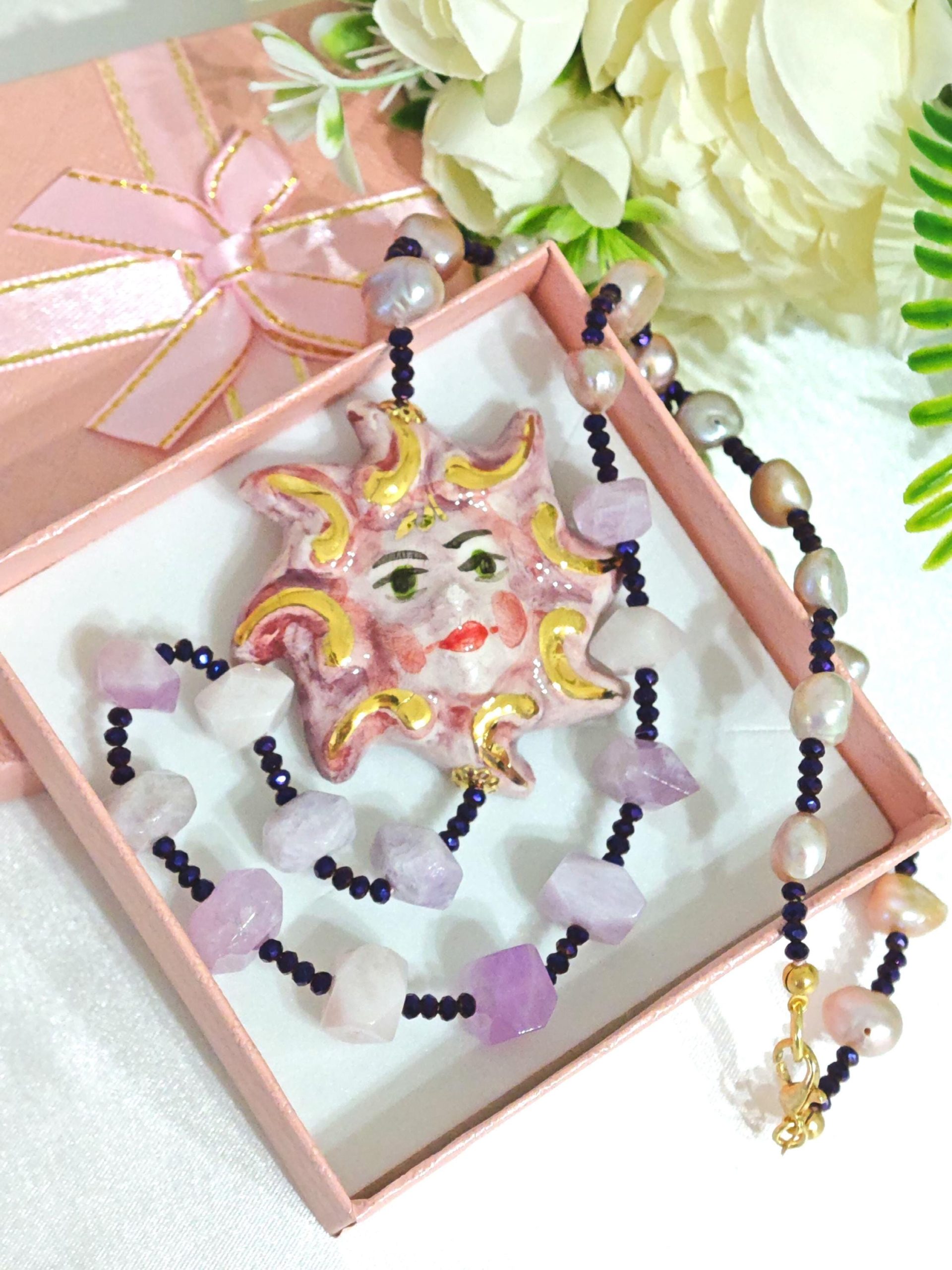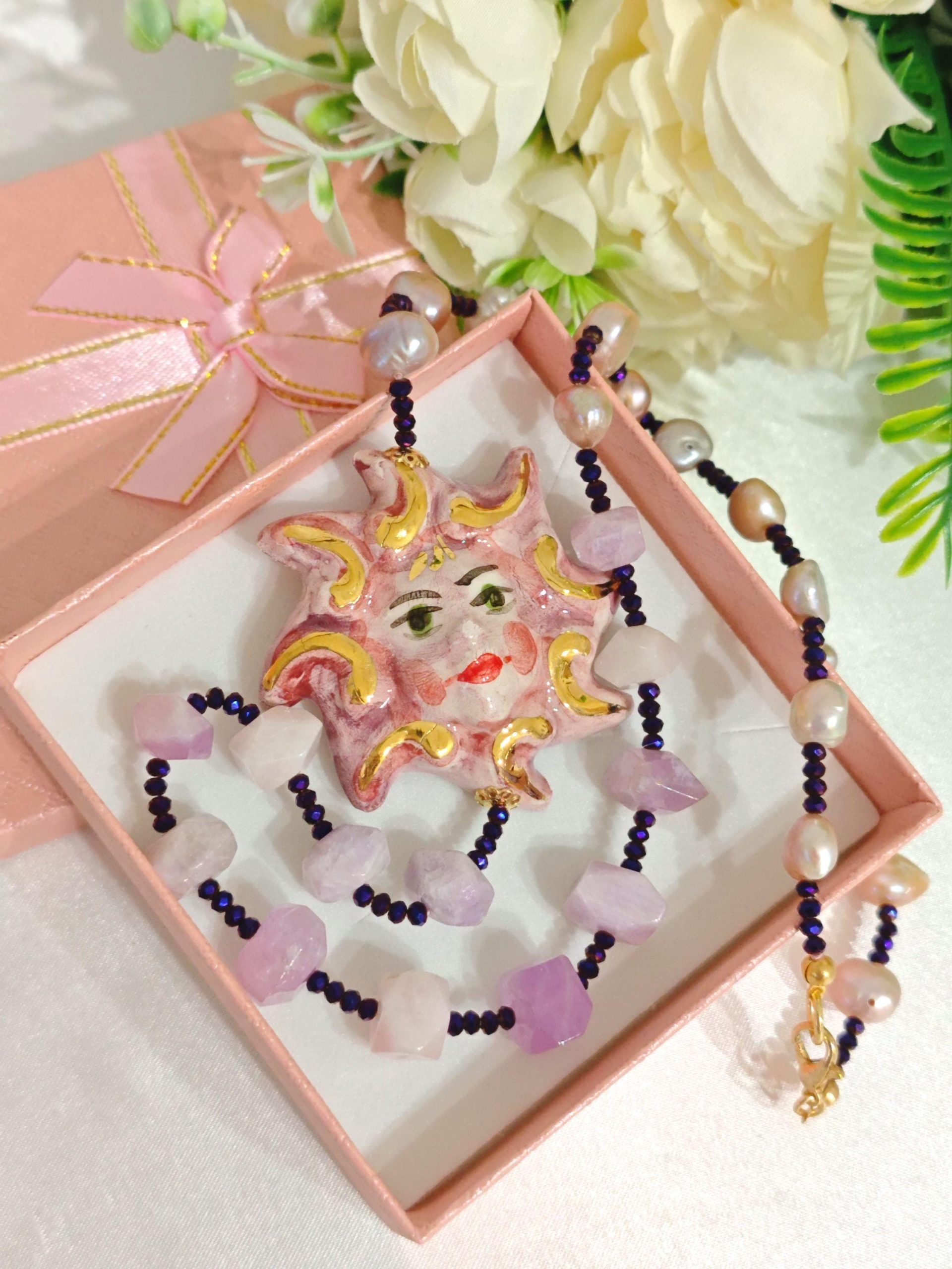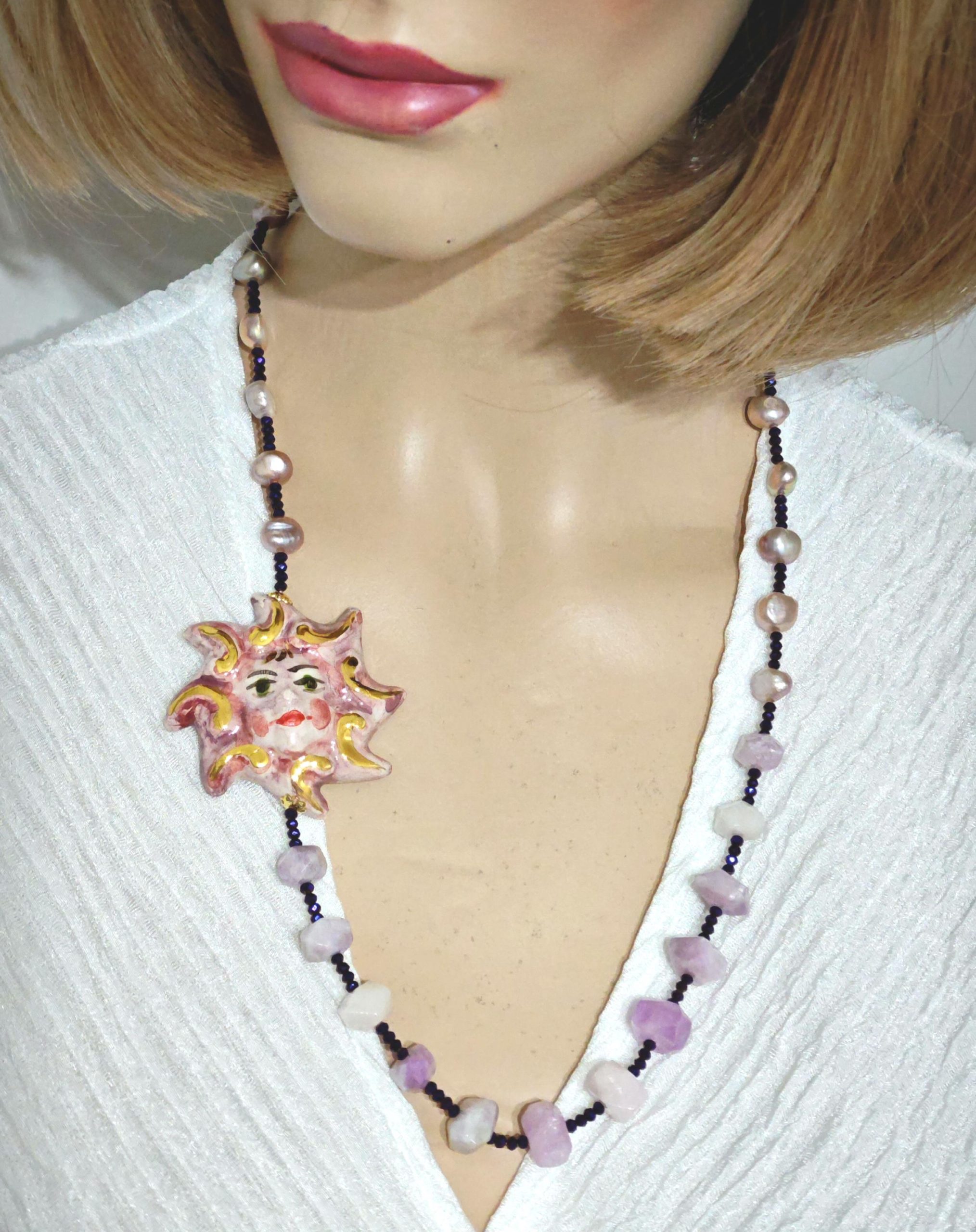 Collana realizzata con pietre dure naturali kunzite, perle naturali colore malva ,cristalli viola e con Sole in ceramica di Caltagirone realizzata e dipinta a mano con applicazioni foglia oro 22 kt, 5 cm diametro .