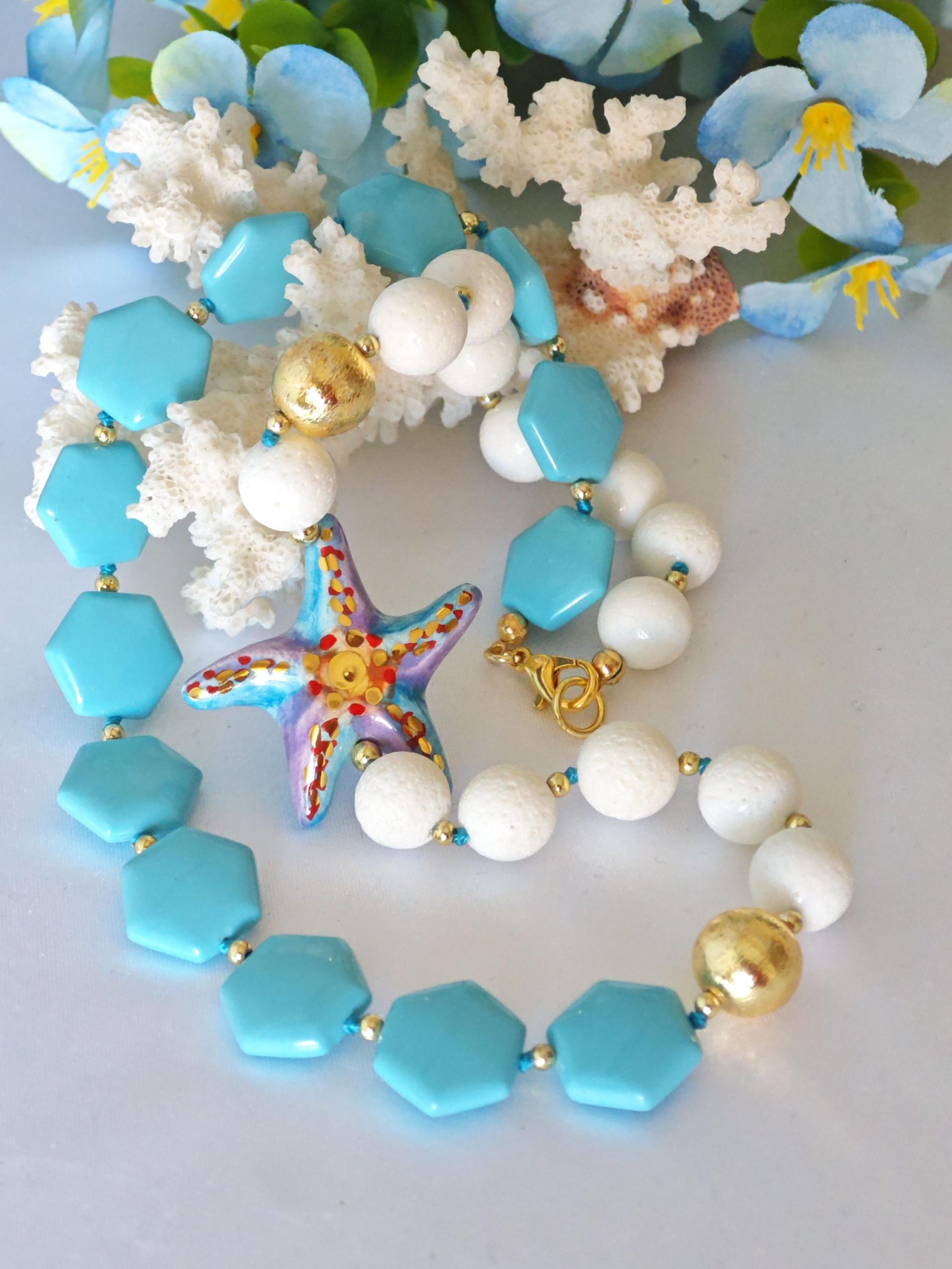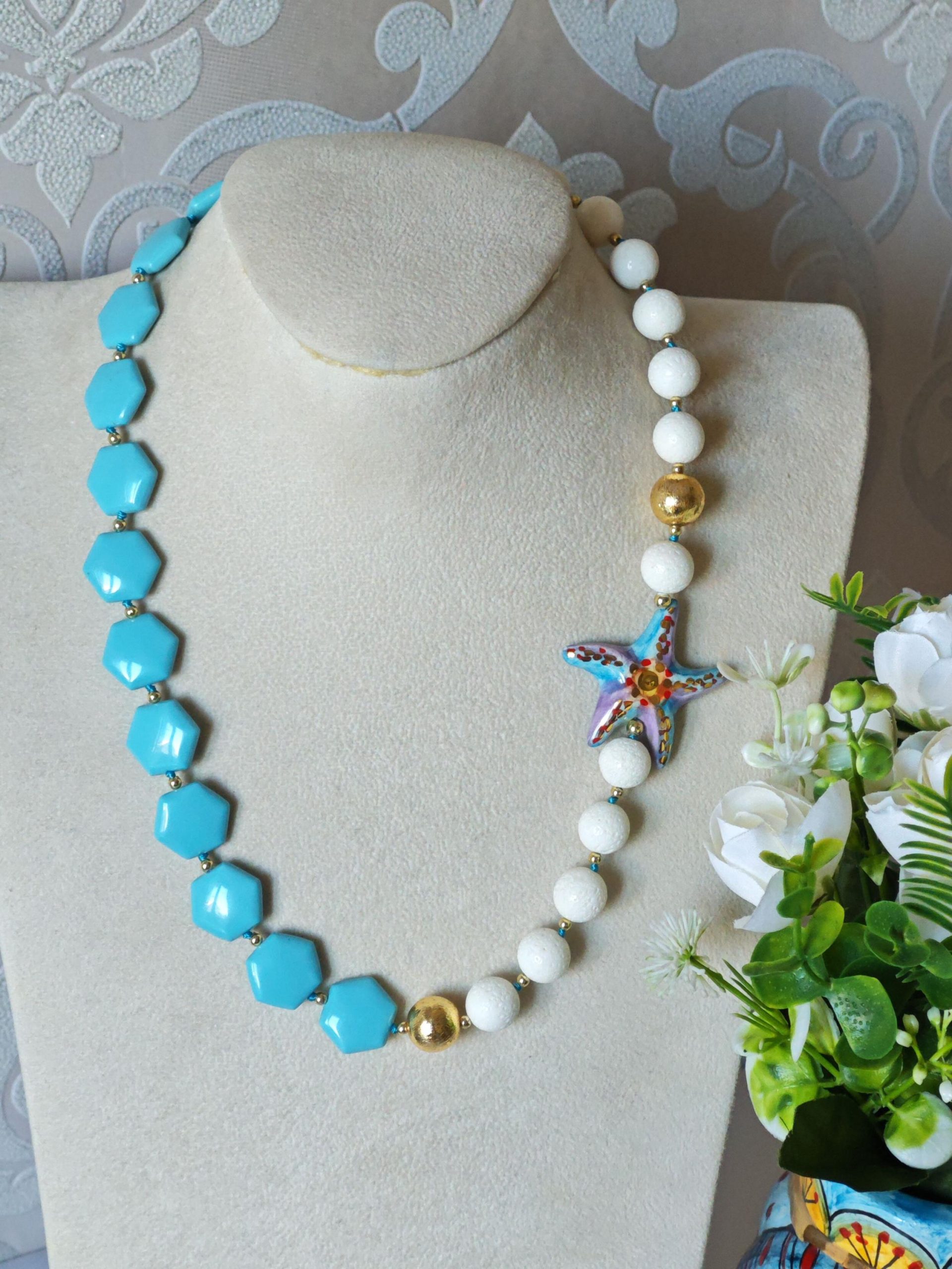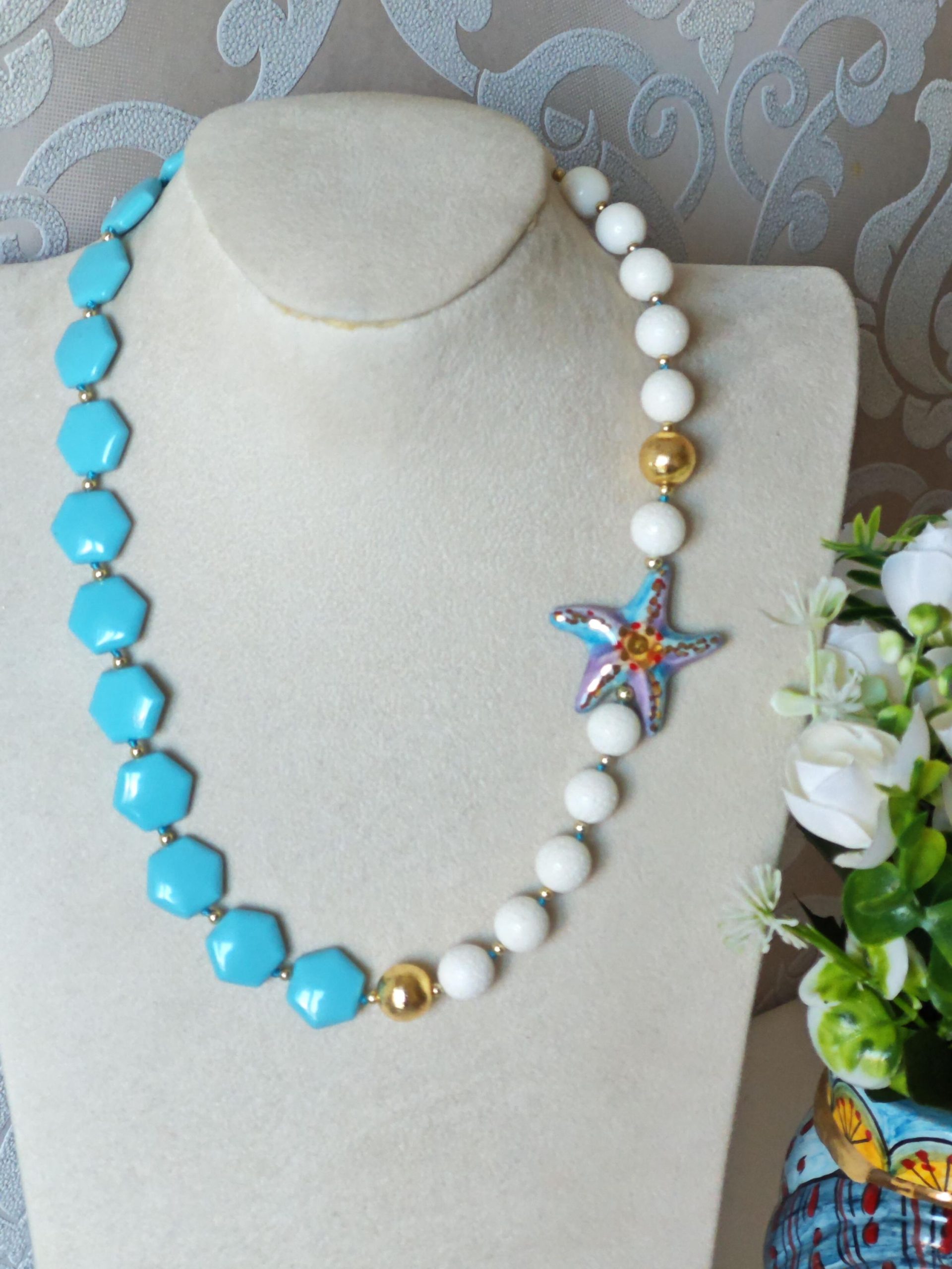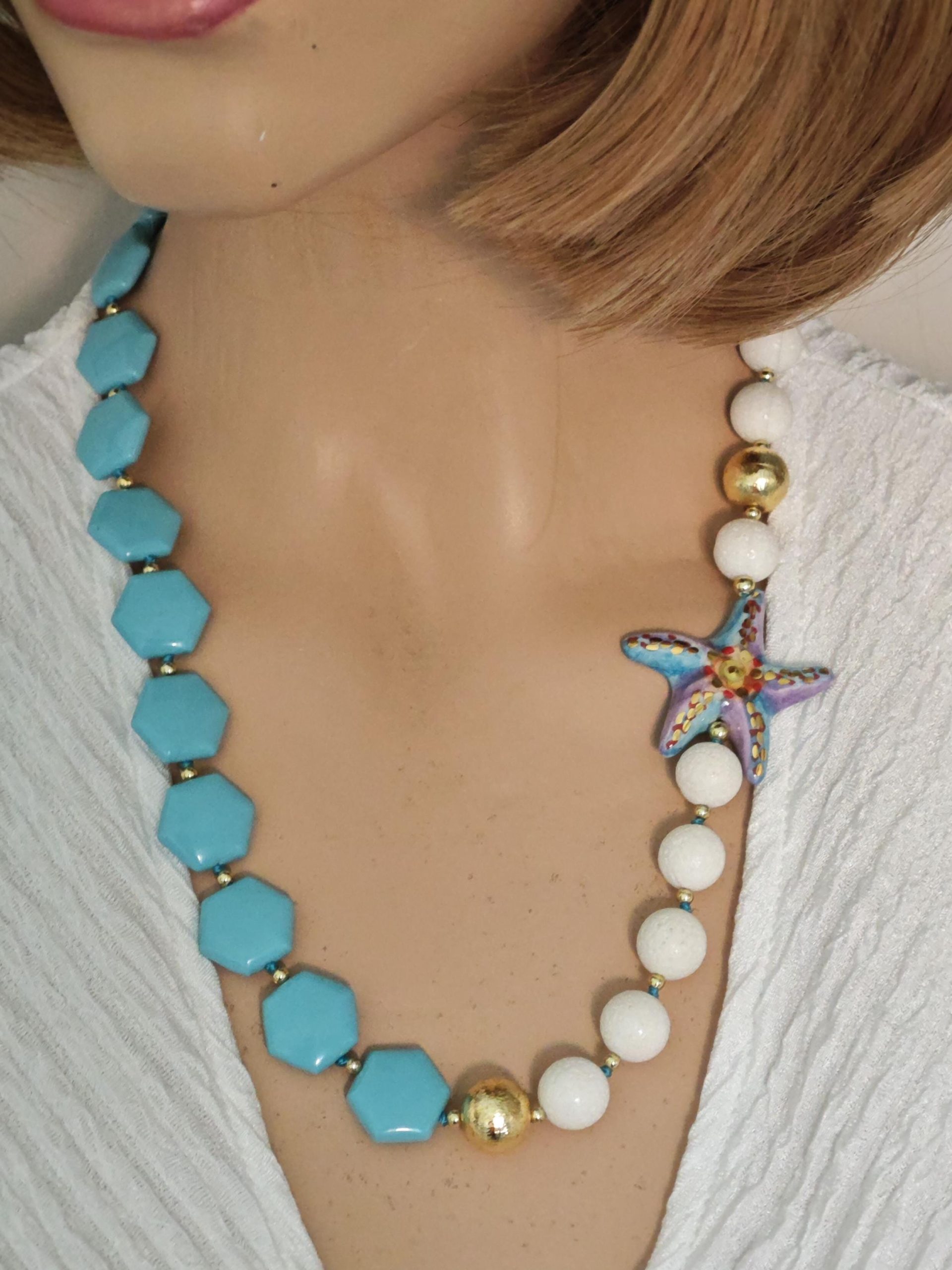 Collana stella marina ceramica Caltagirone, collana perle turchese e corallo bianco, collana siciliana