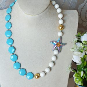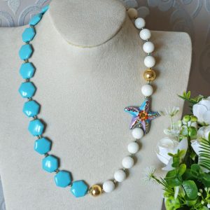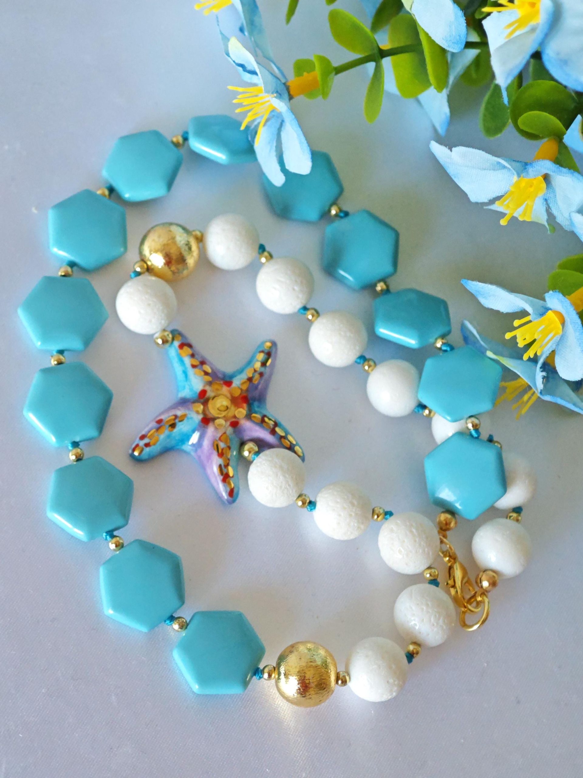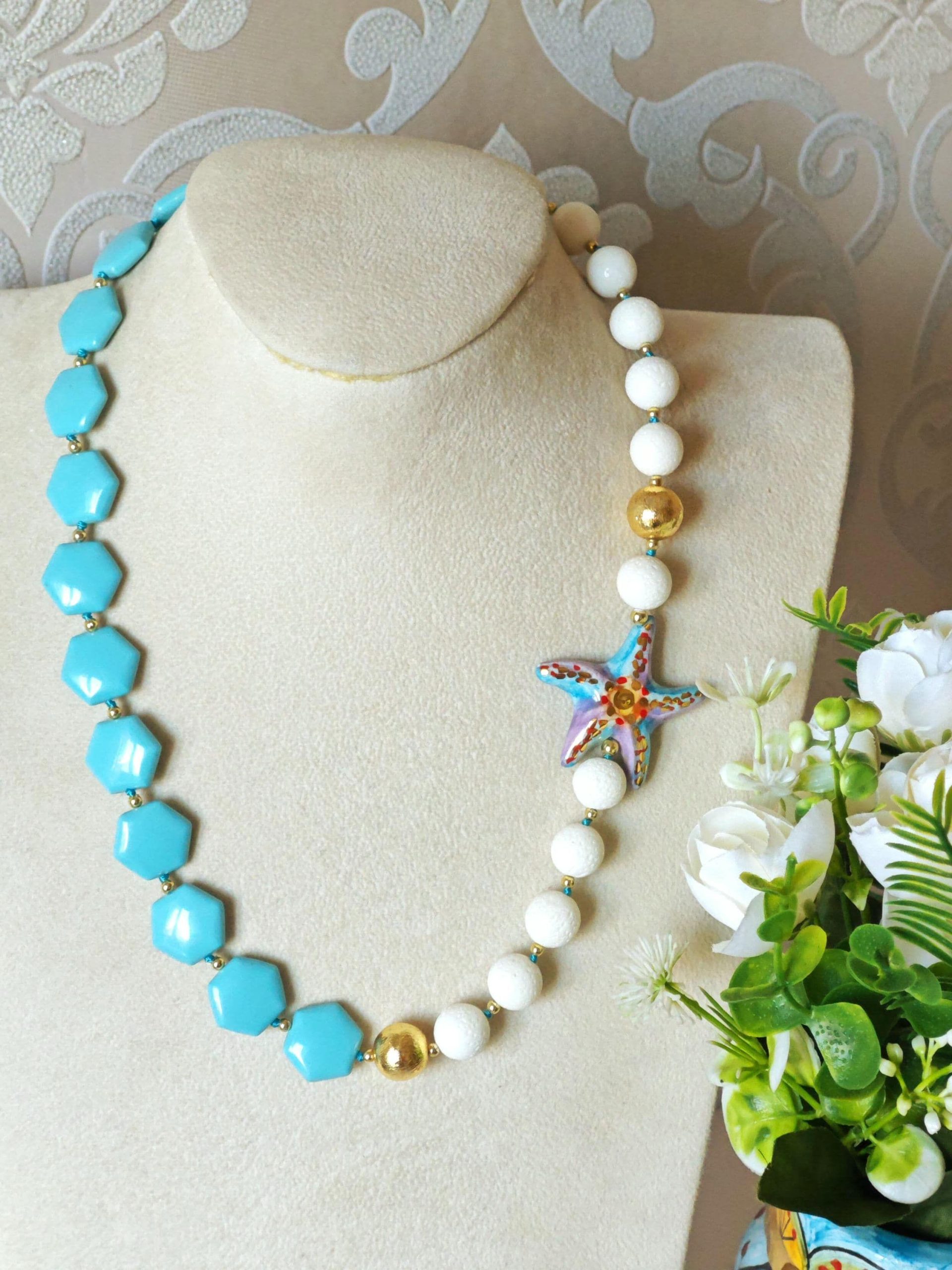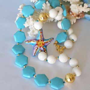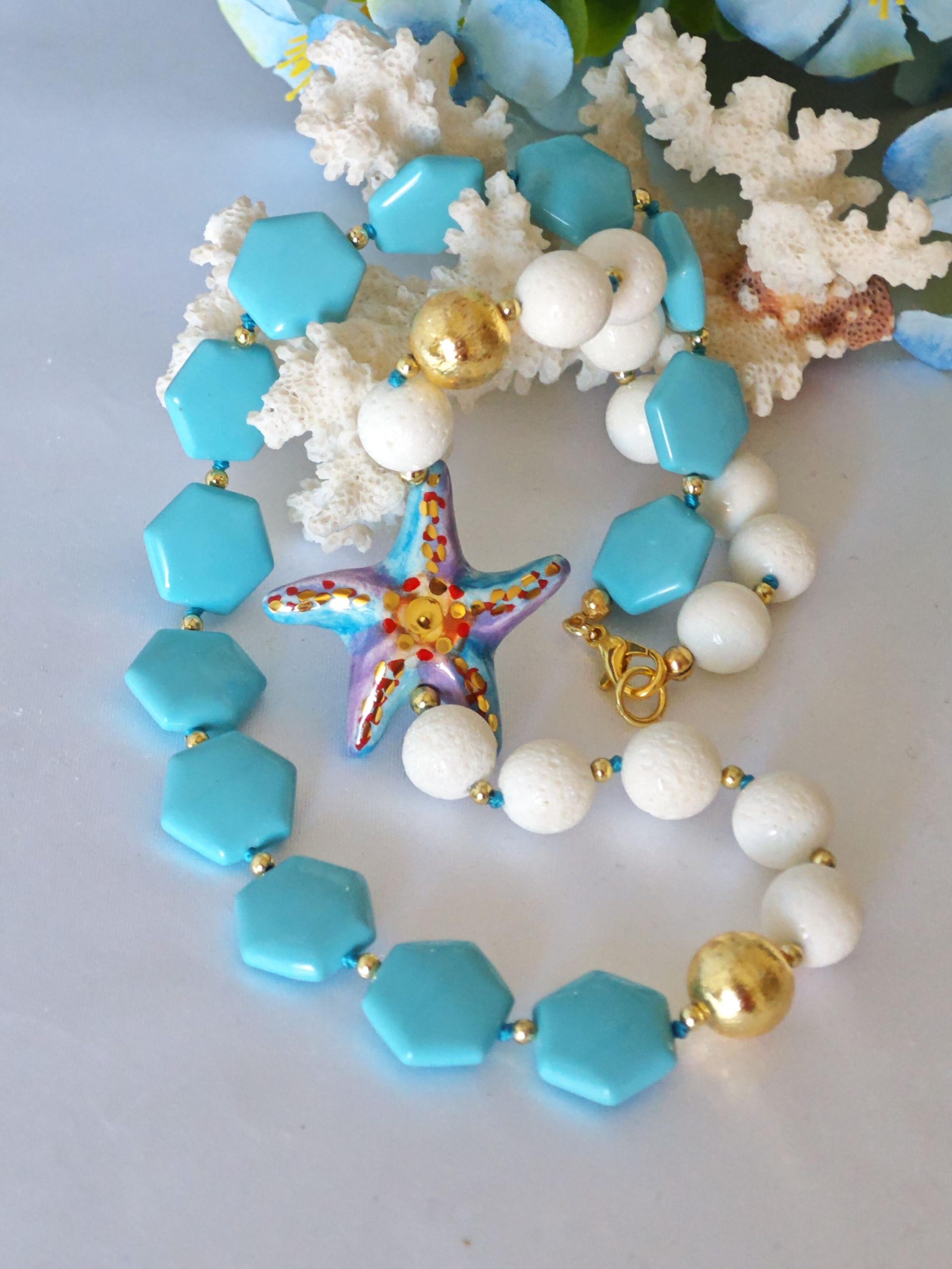 Collana stella marina ceramica Caltagirone, collana perle turchese e corallo bianco, collana siciliana