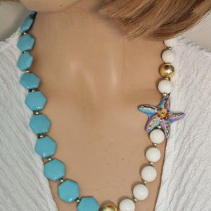 Collana annodata a mano con perle esagonali in pasta di turchese imitazione 14 mm, perle dorate e perle corallo bianco spugna 12mm e con stella marino in ceramica di Caltagirone realizzata e dipinta a mano con applicazioni foglia oro 22 kt, 3 cm diametro.