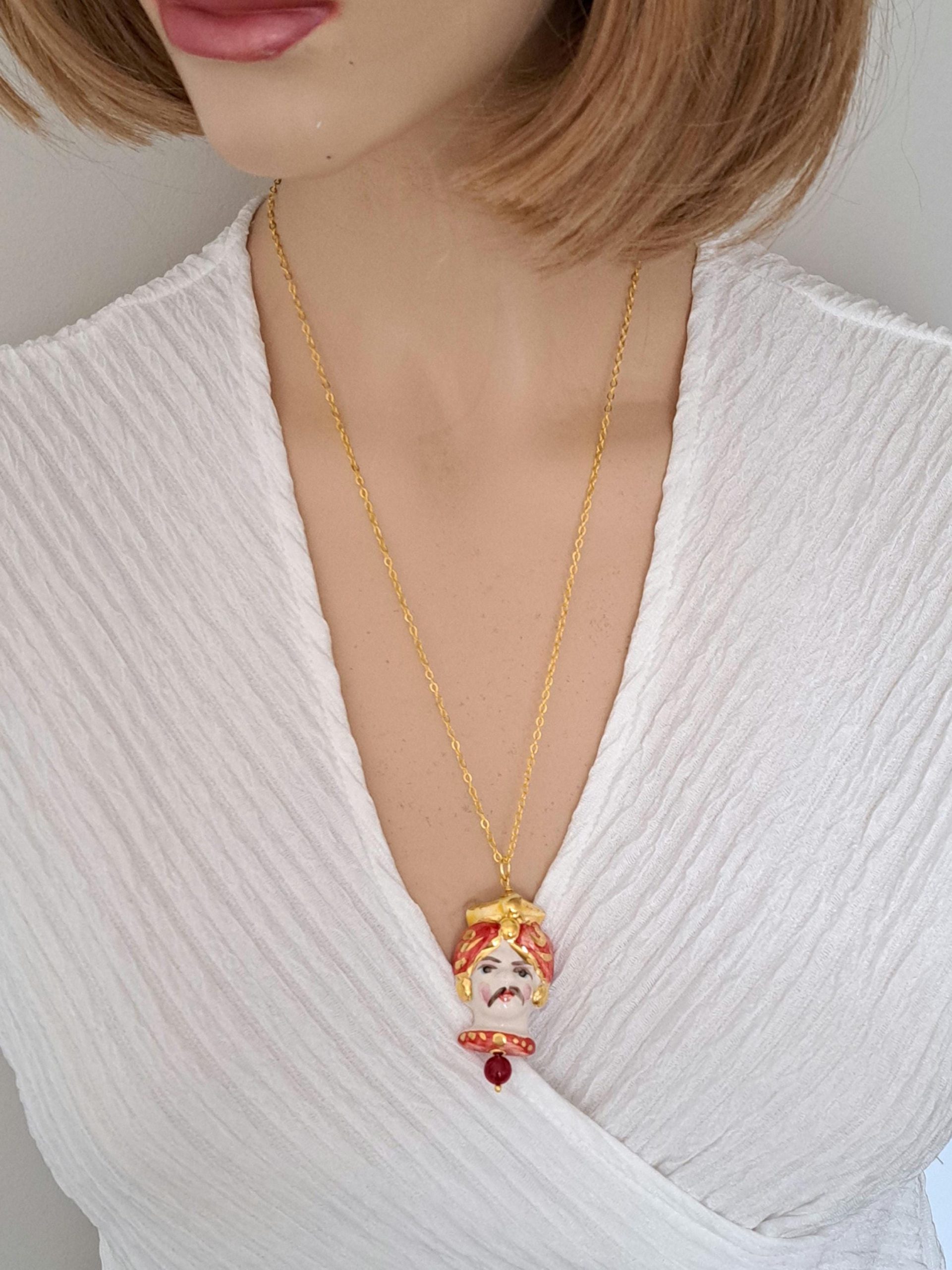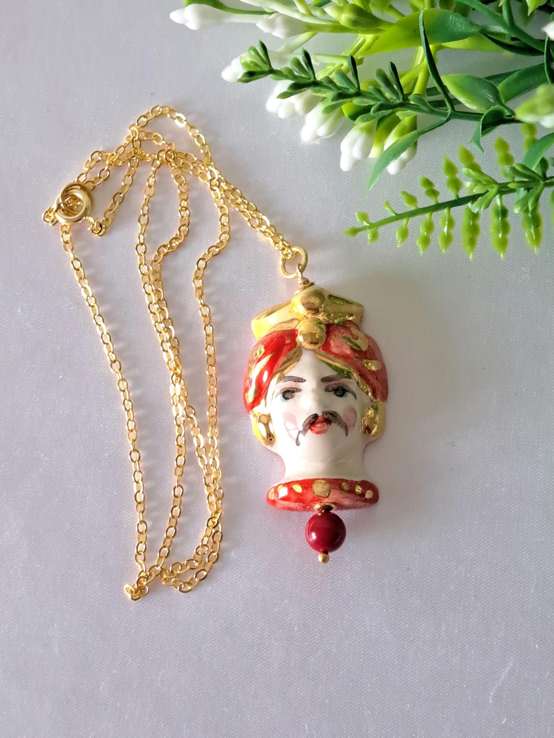 Collana catena metallo dorato con pendente testa di moro in ceramica di Caltagirone realizzata e dipinta a mano, con applicazioni foglia oro 22 kt , 4 cm dimensioni.