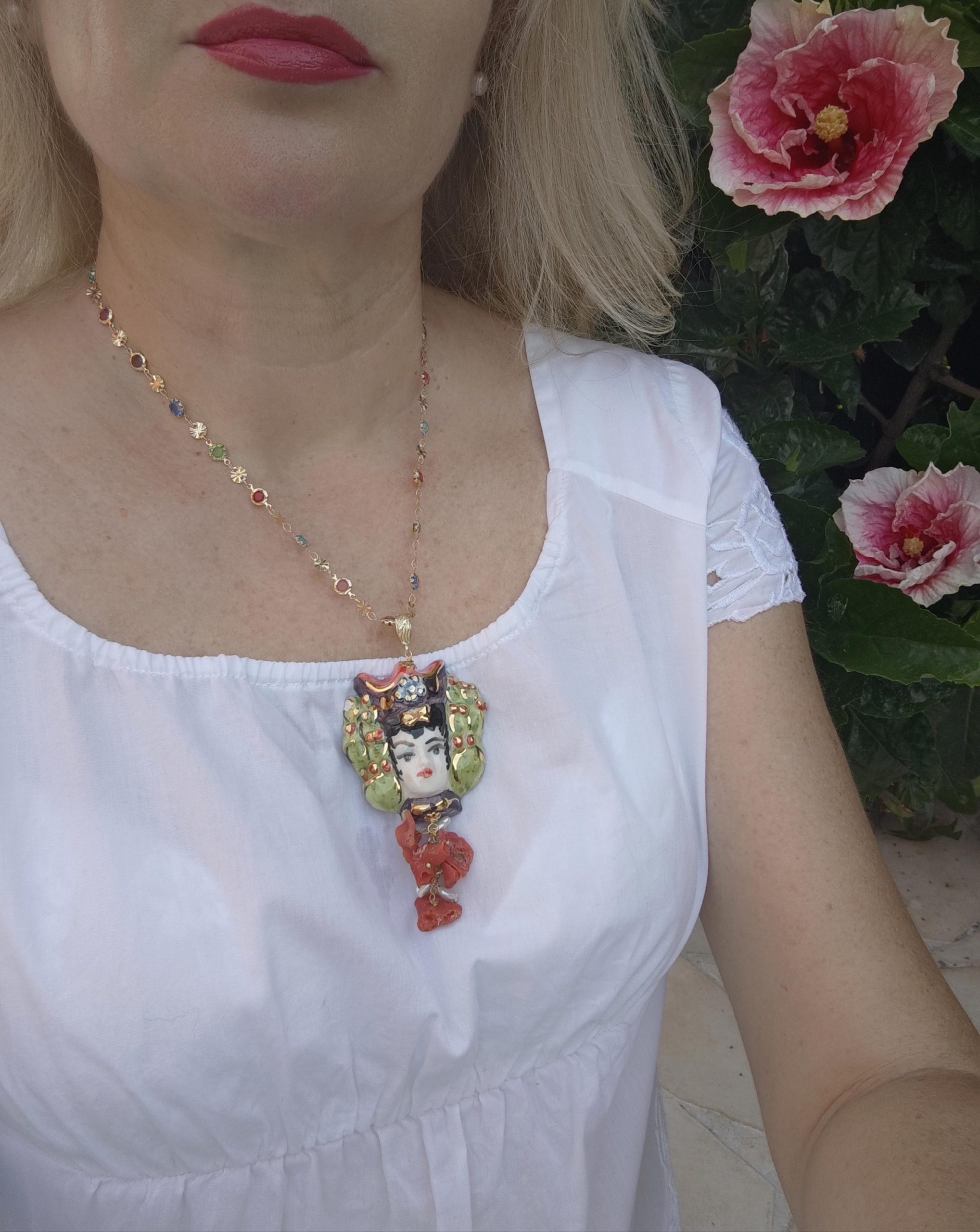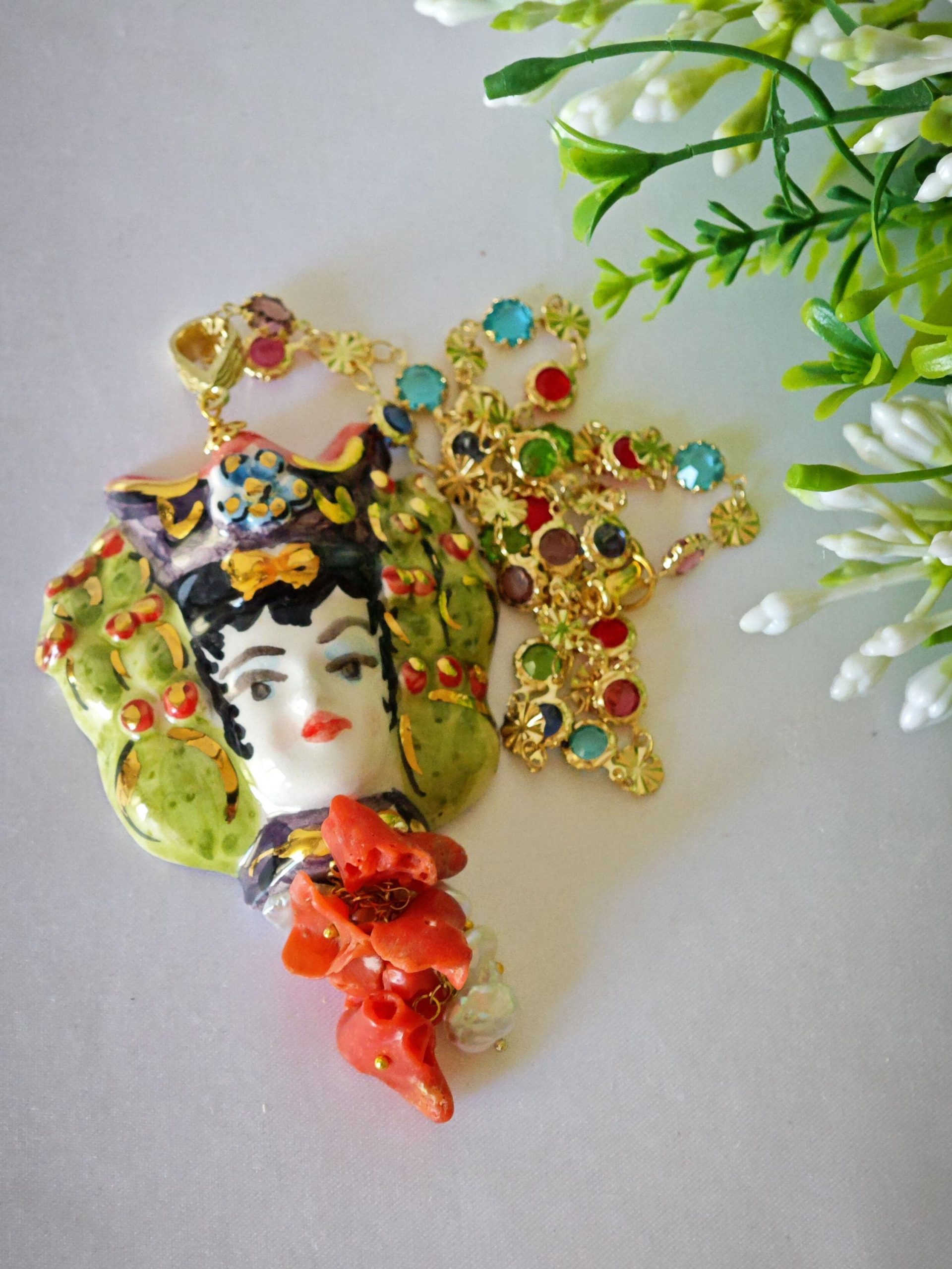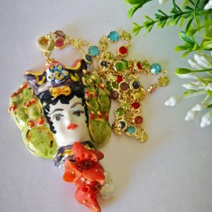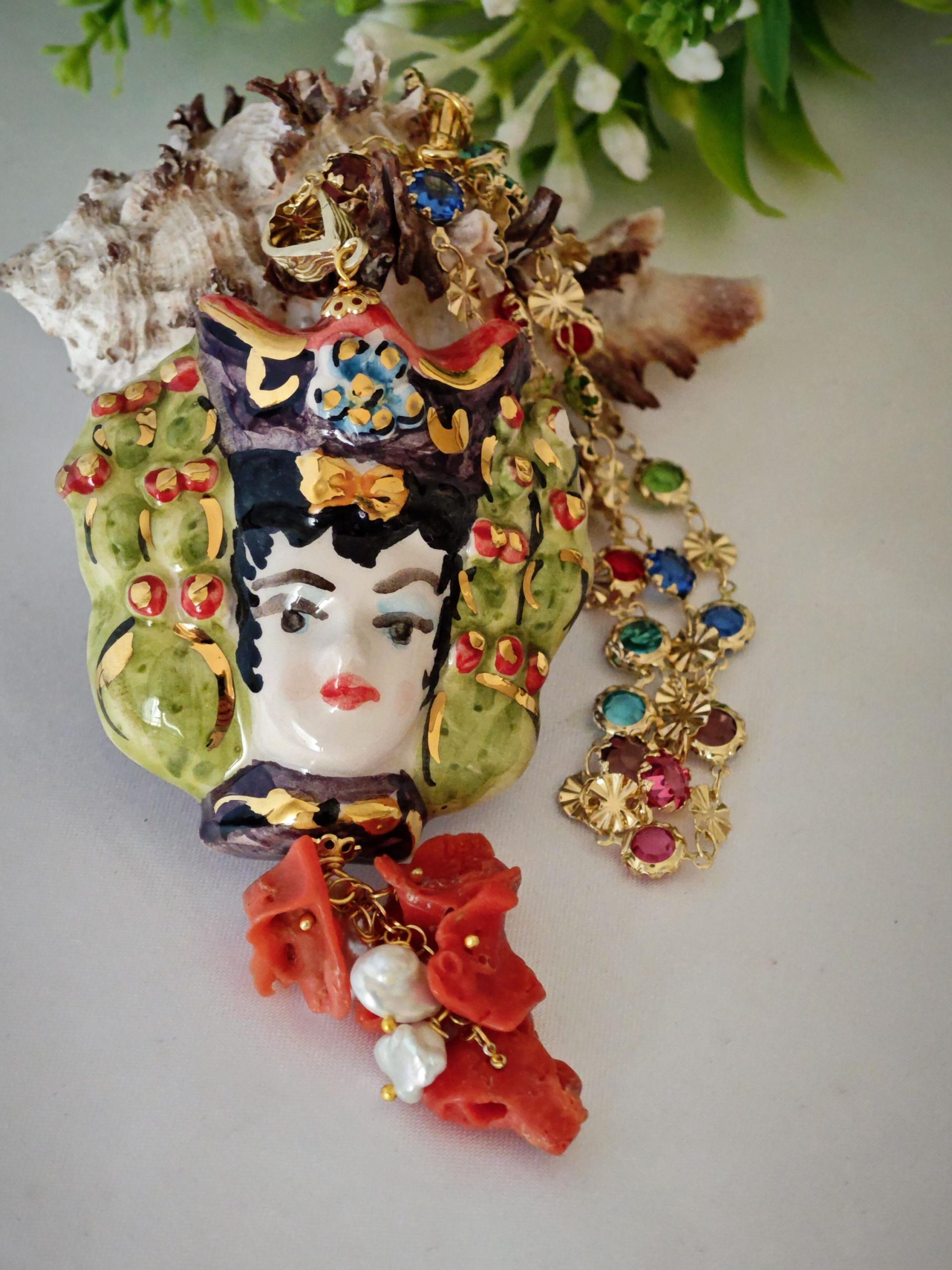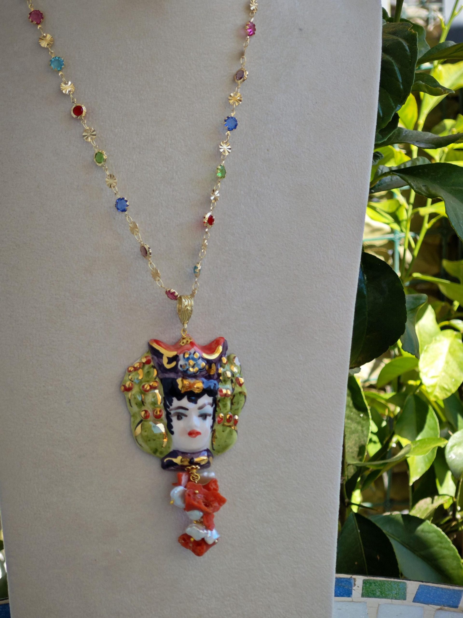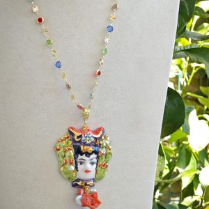 Collana catena a rosario con cristalli multicolori e con pendente testa di moro donna in ceramica di Caltagirone realizzata e dipinta a mano, 5 cm dimensioni decorata con perle bianche naturali e corallo rosso naturale mediterraneo.