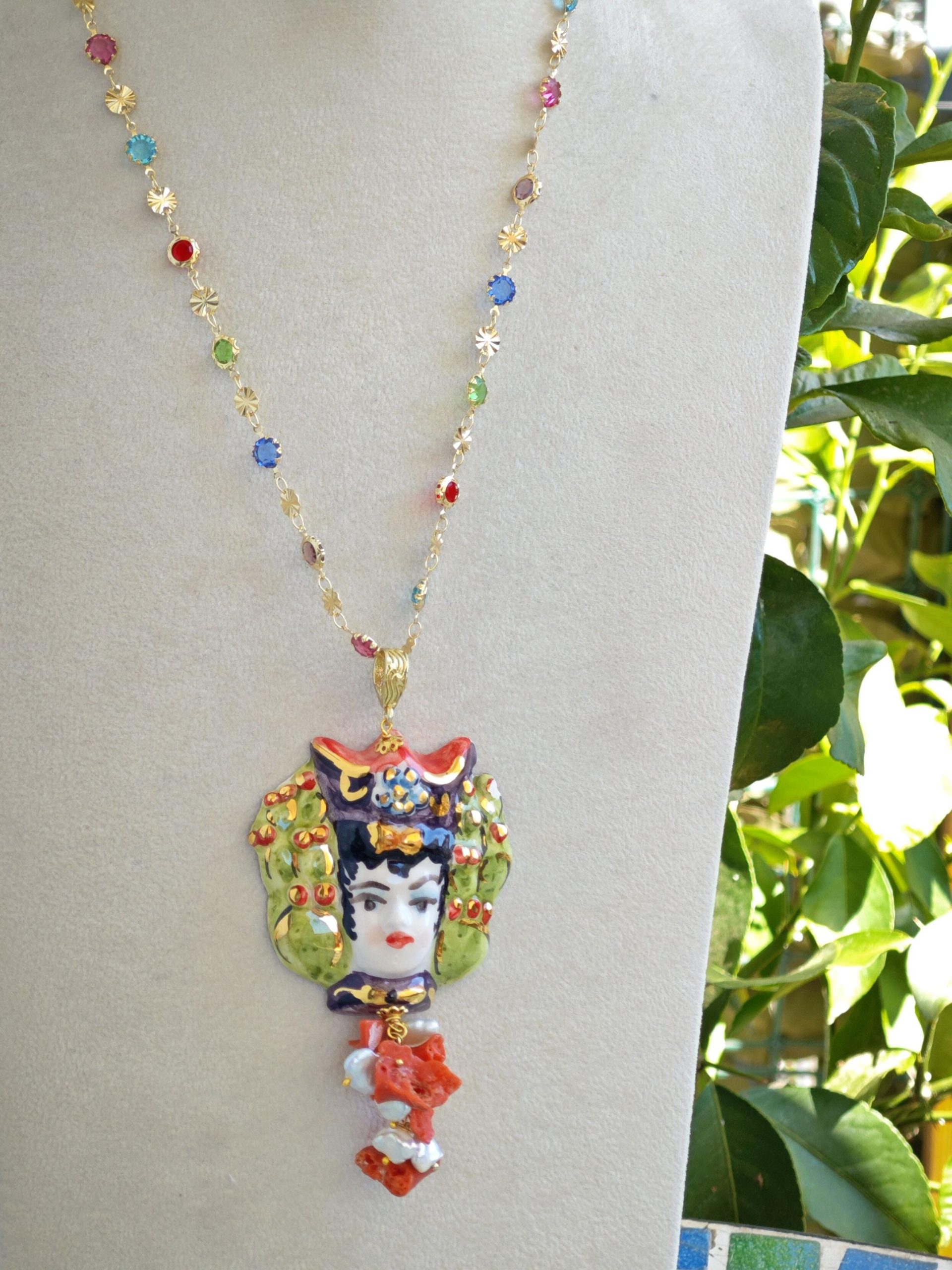 Collana testa di moro in ceramica di Caltagirone con pietre dure quarzo verde , collana siciliana