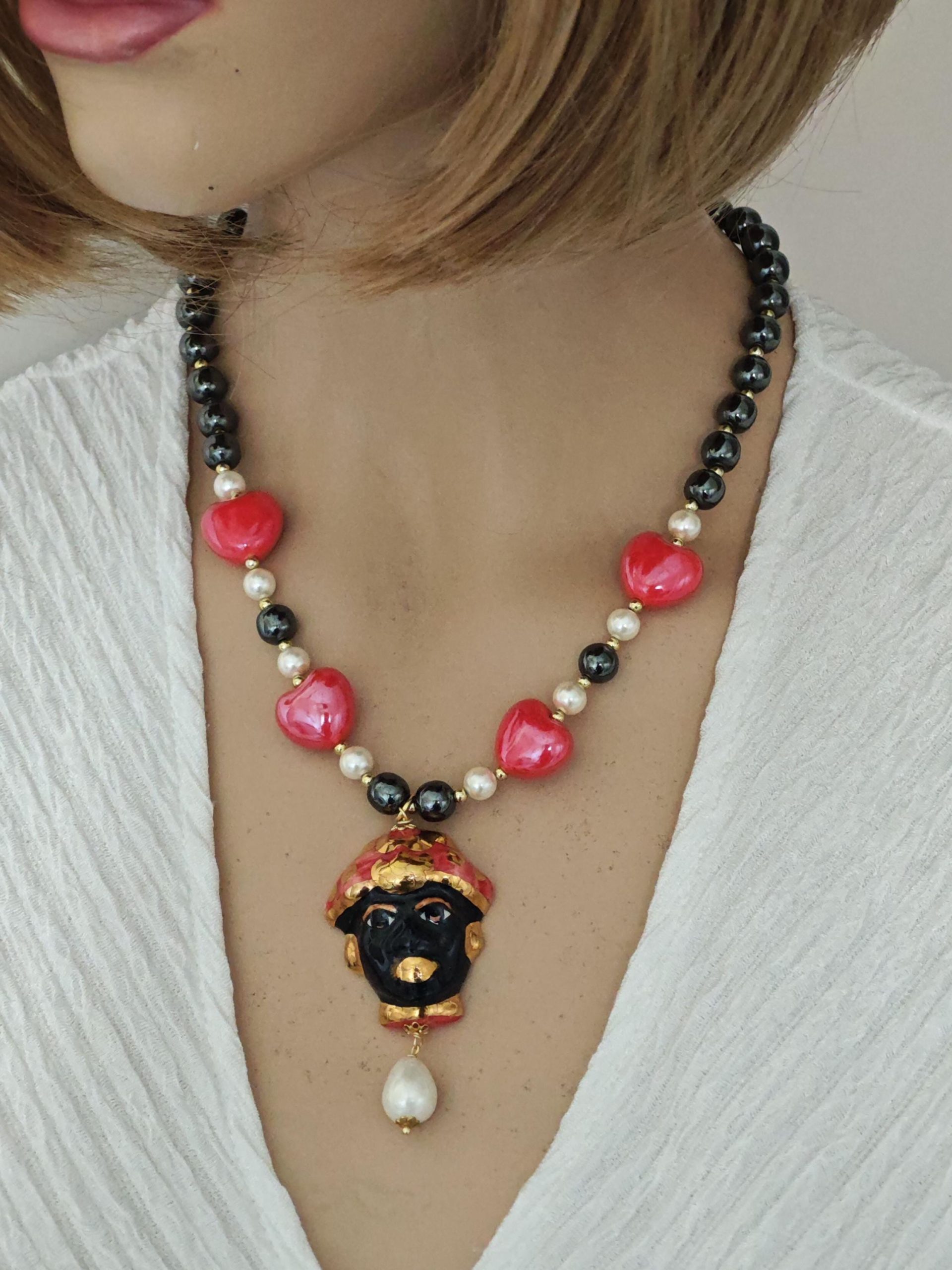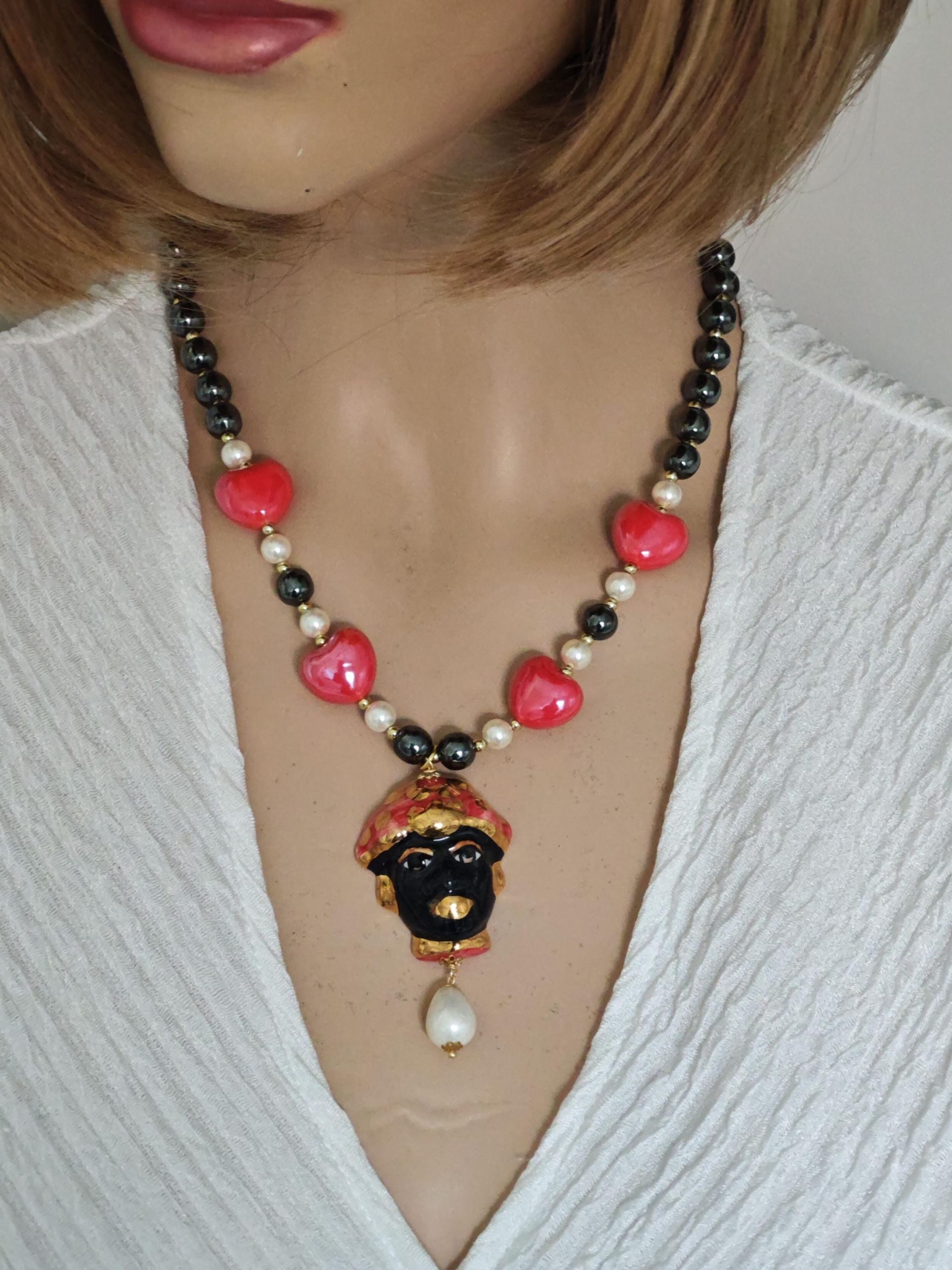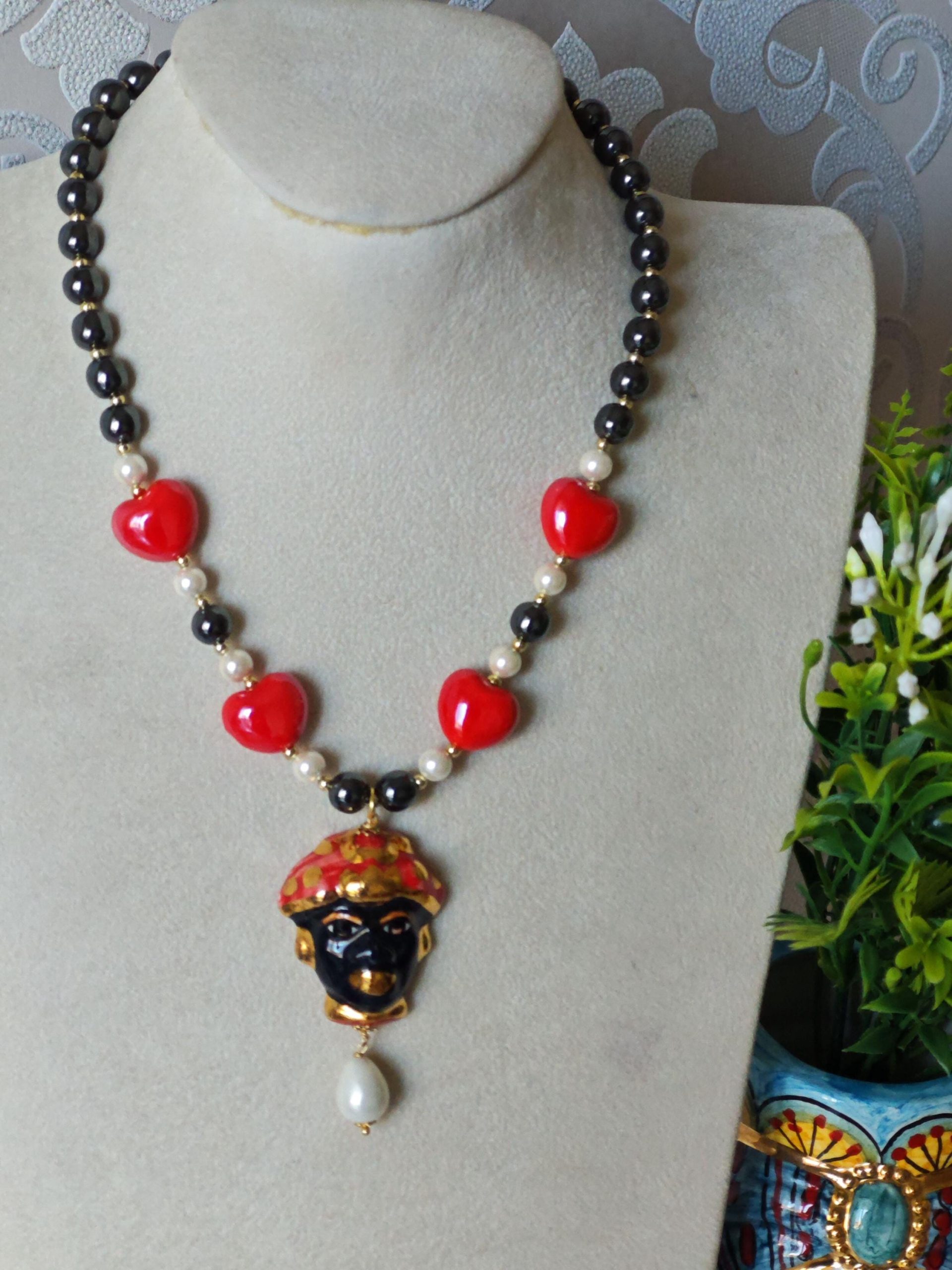 Collana testa di moro in ceramica di Caltagirone con perle ematite e cuori ceramica , collana siciliana