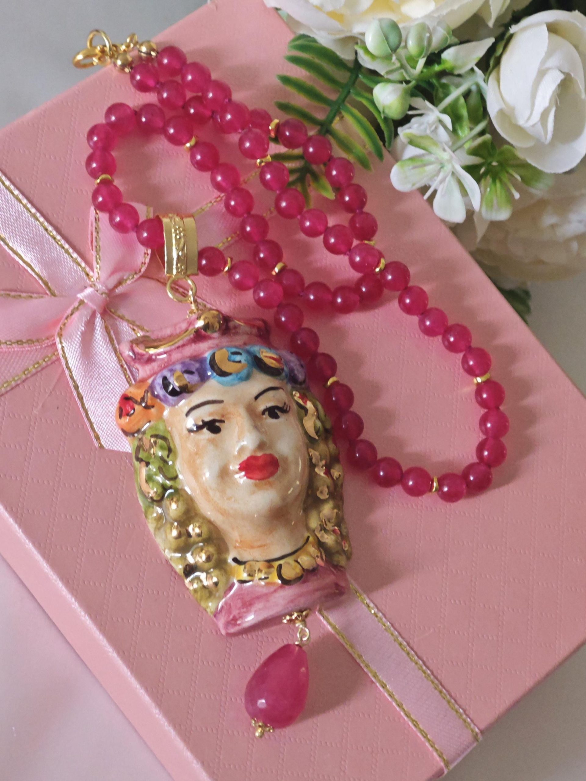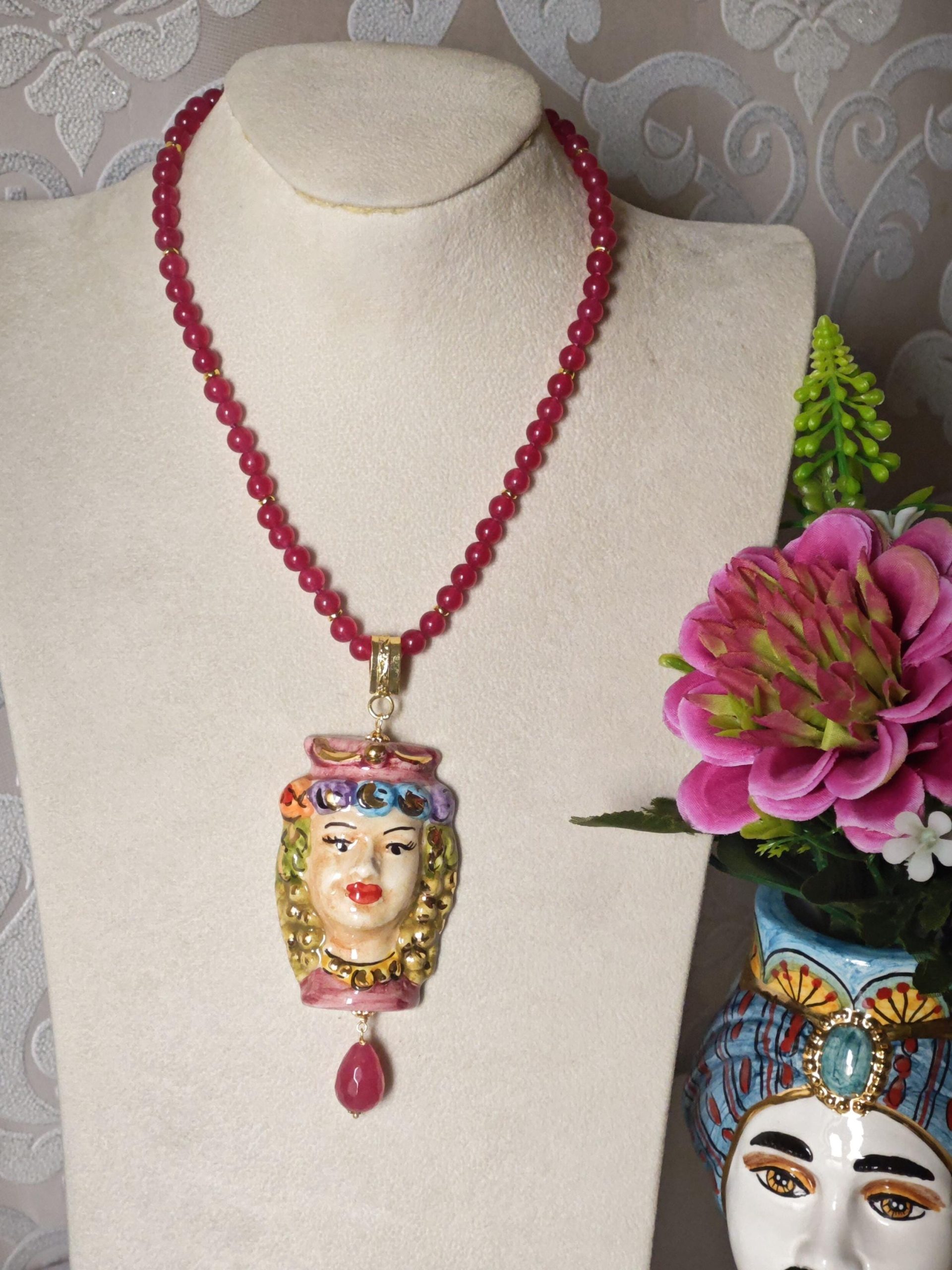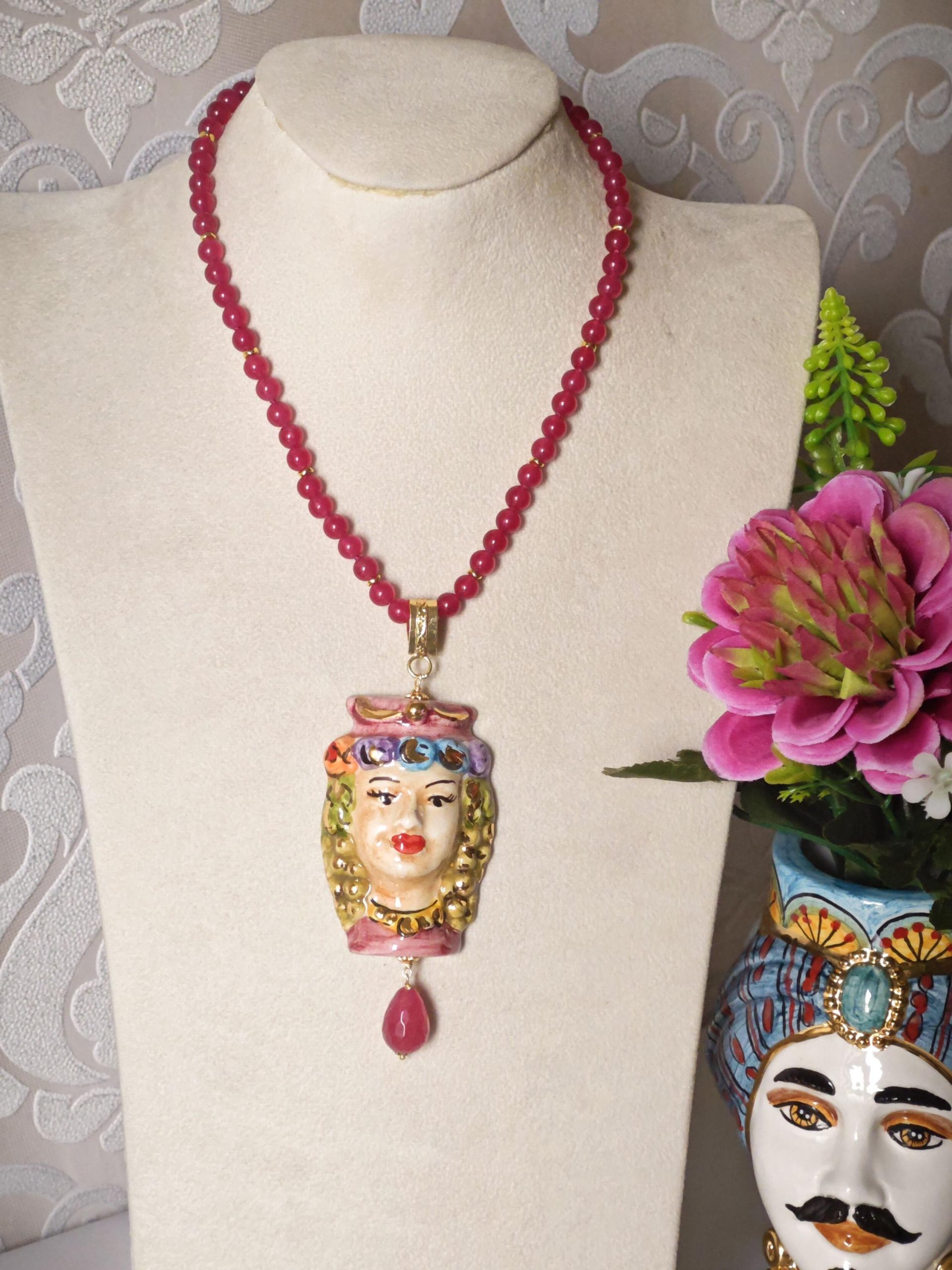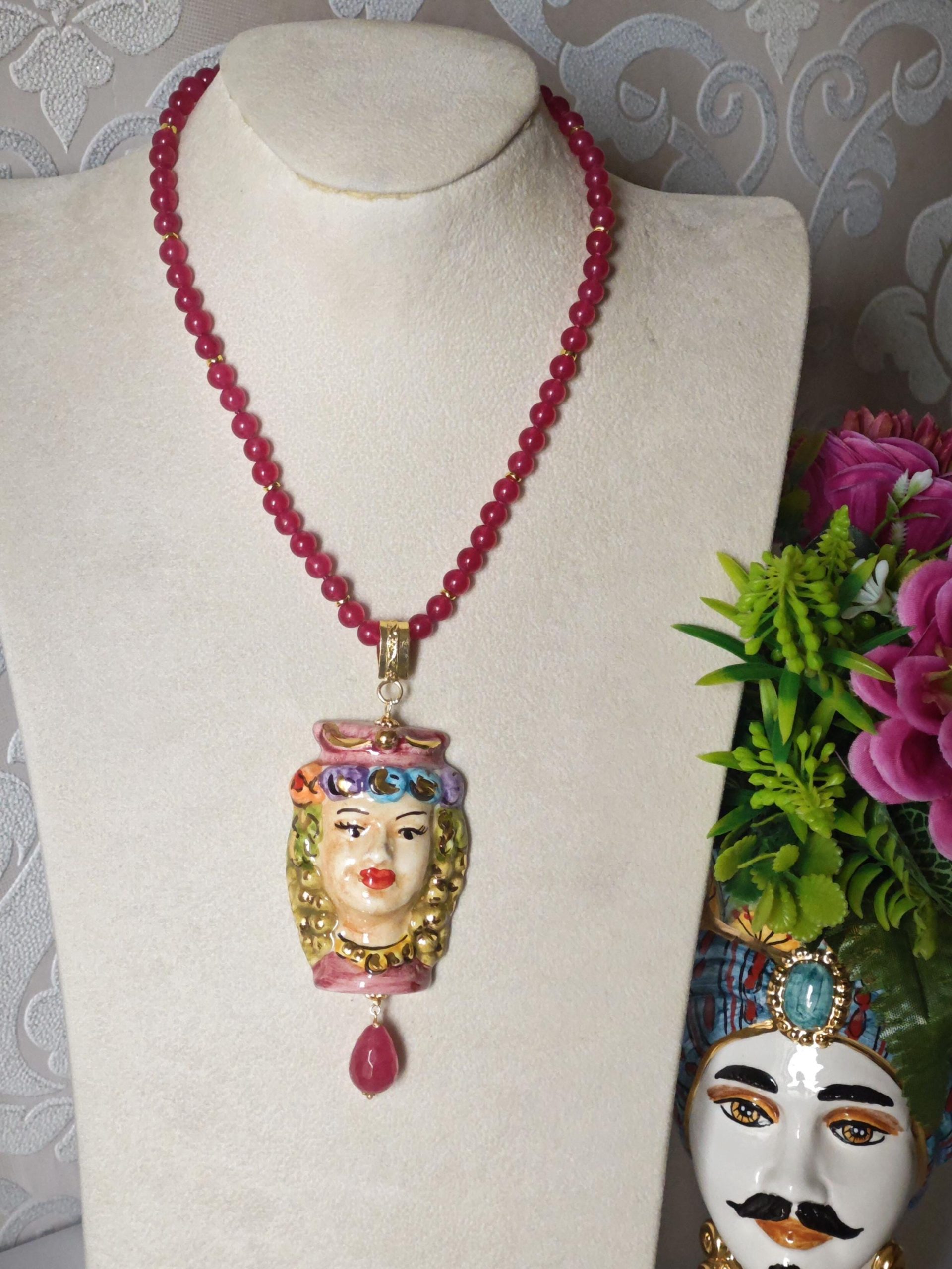 Collana testa di moro in ceramica di Caltagirone con pietre agata rosa, collana girocollo, collana siciliana