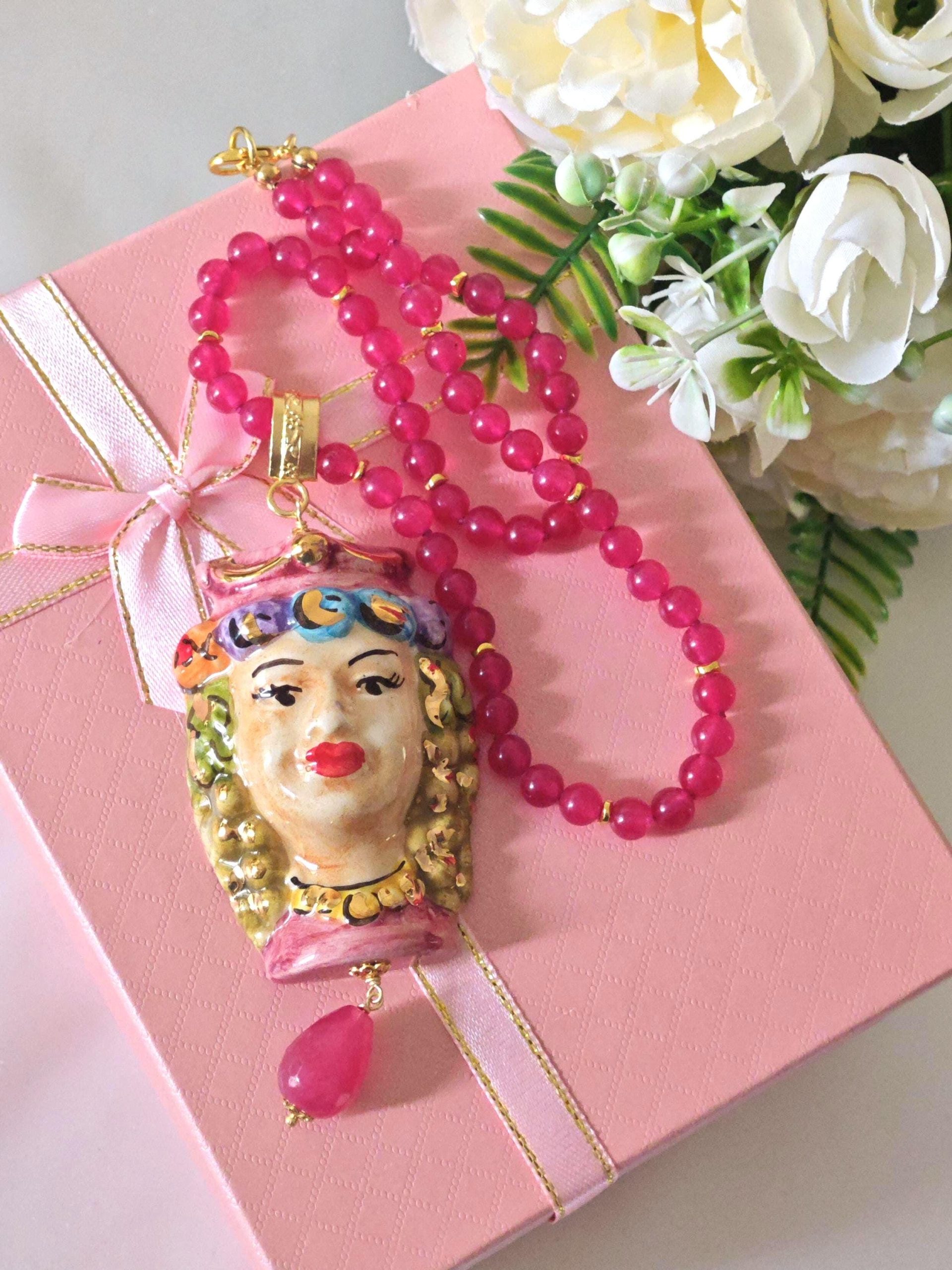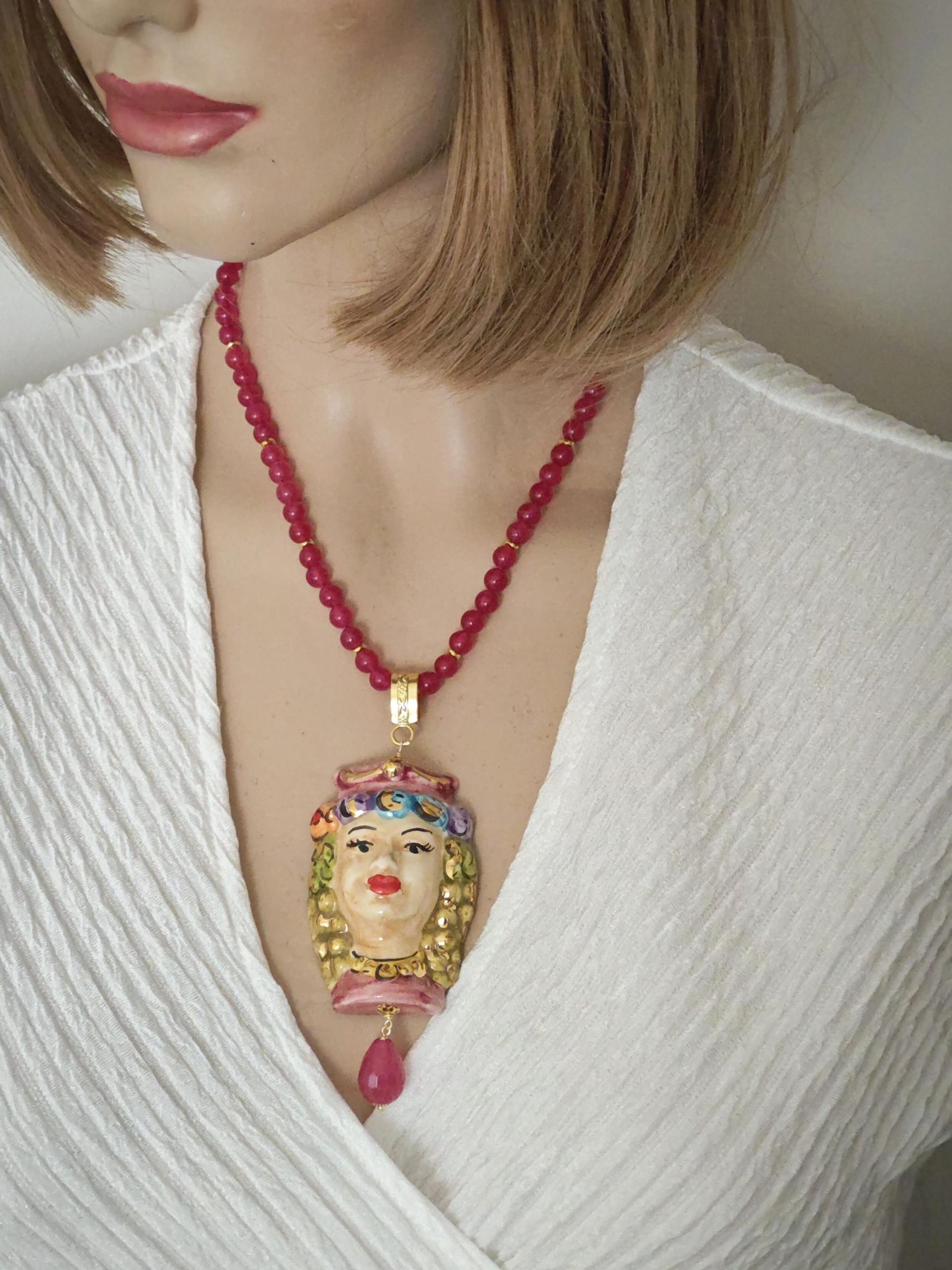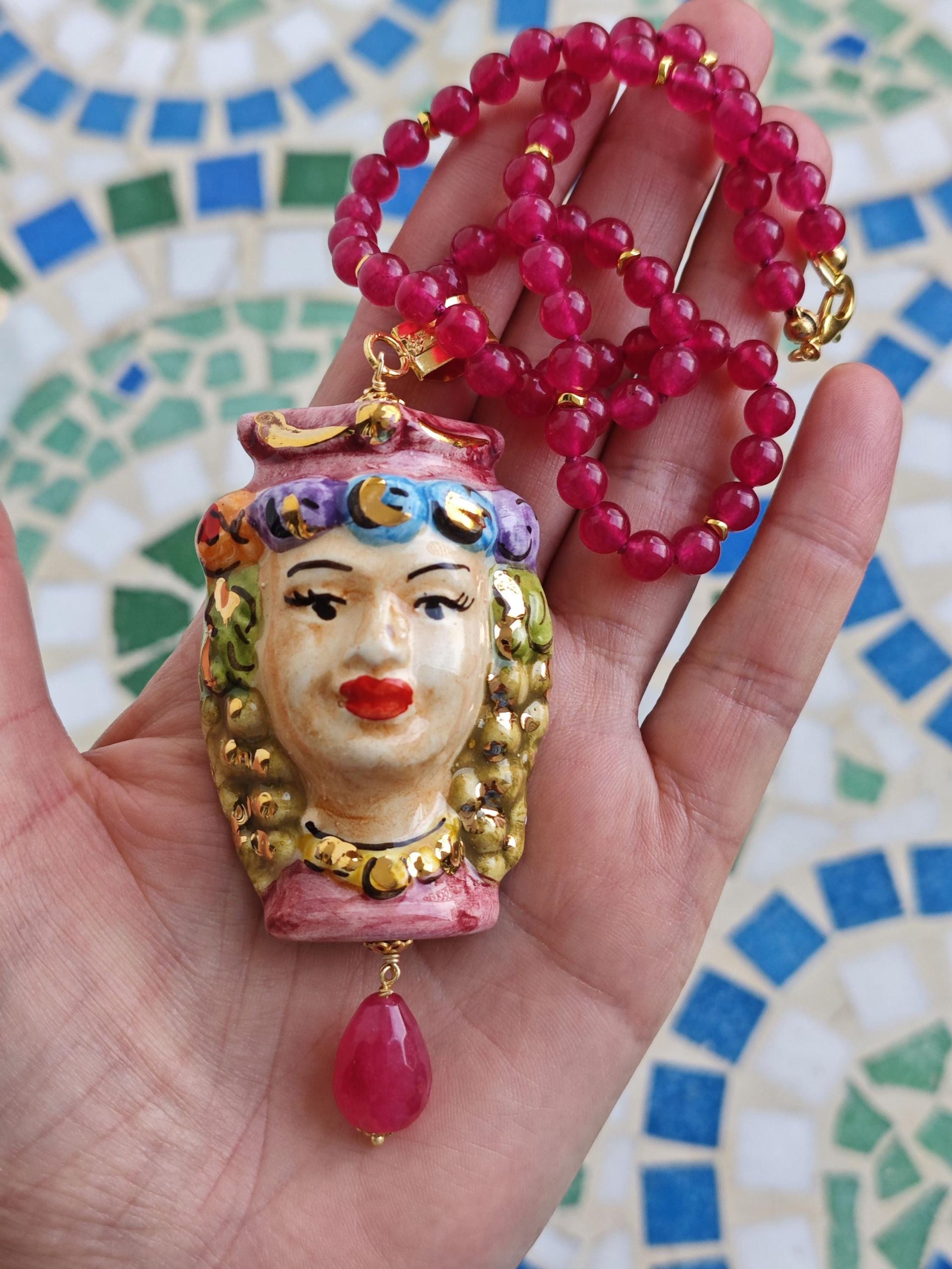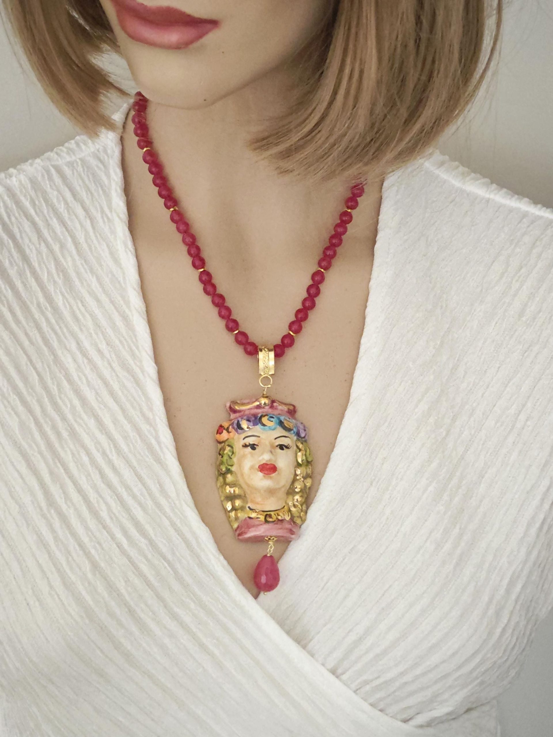 Collana testa di moro in ceramica di Caltagirone con pietre agata rosa, collana girocollo, collana siciliana