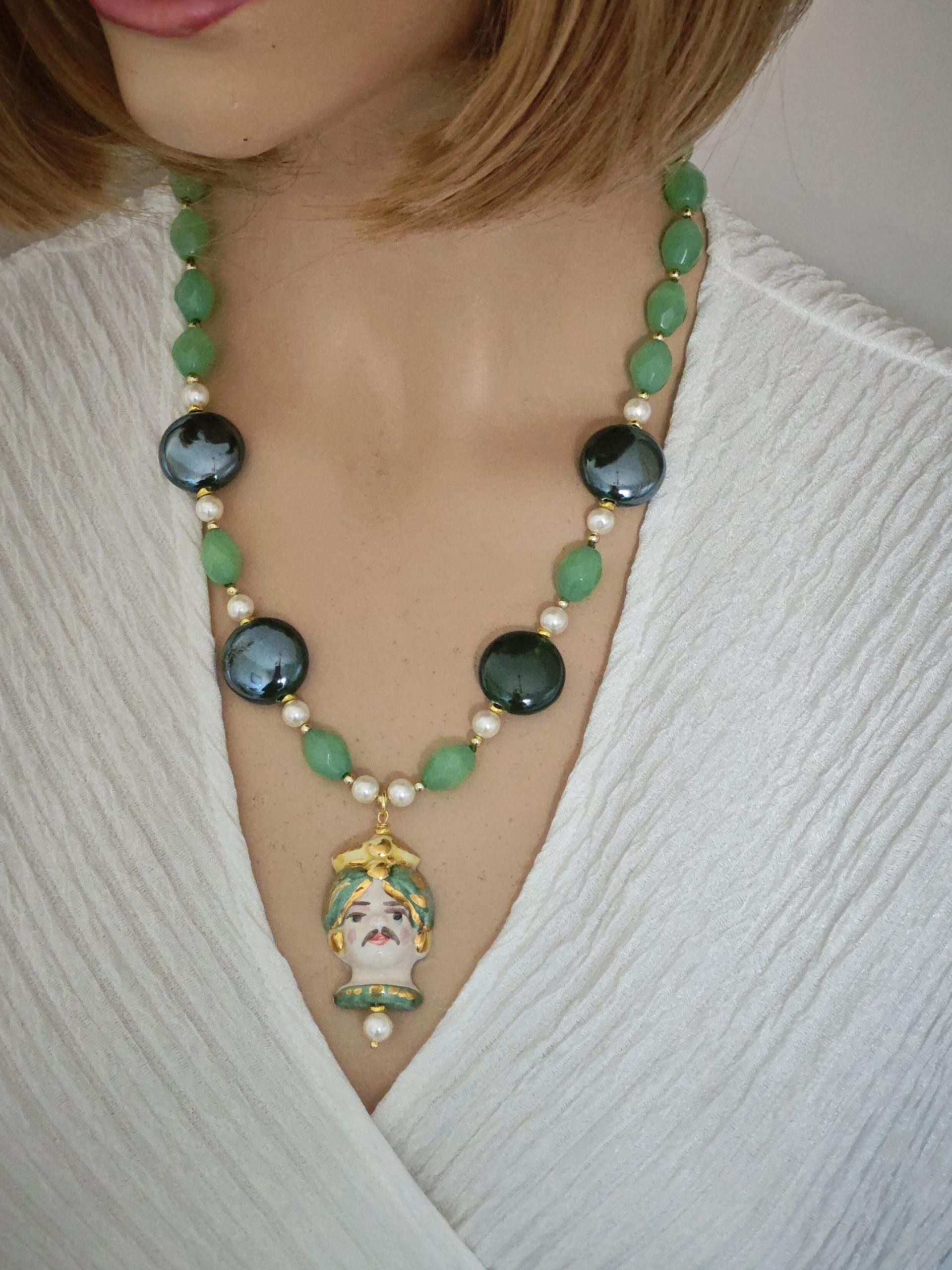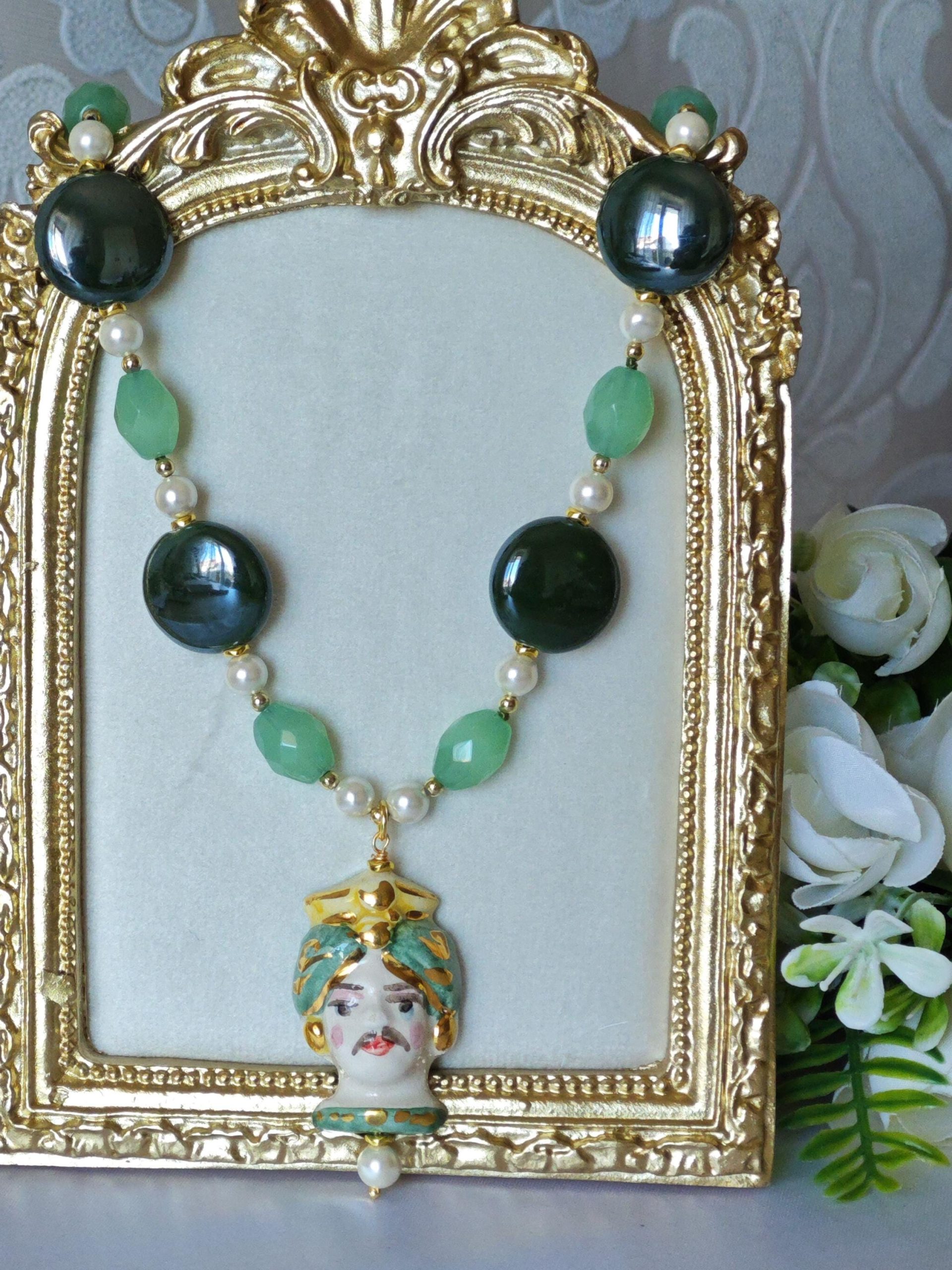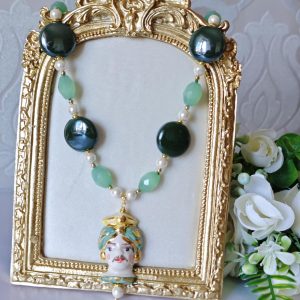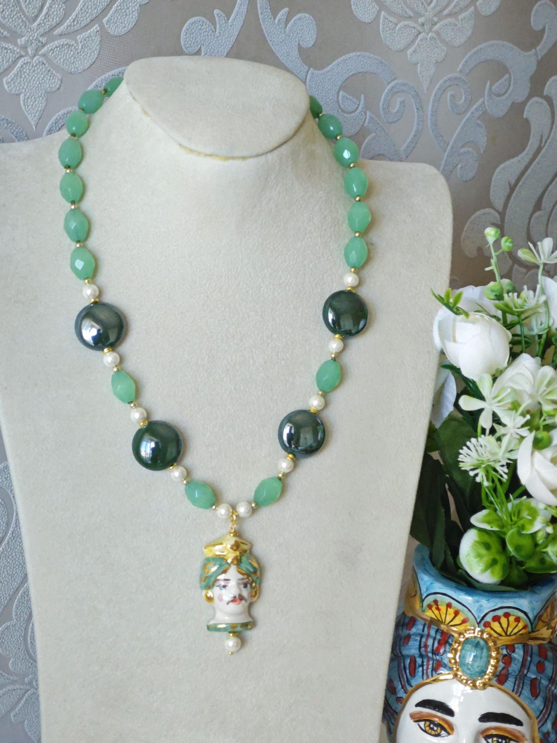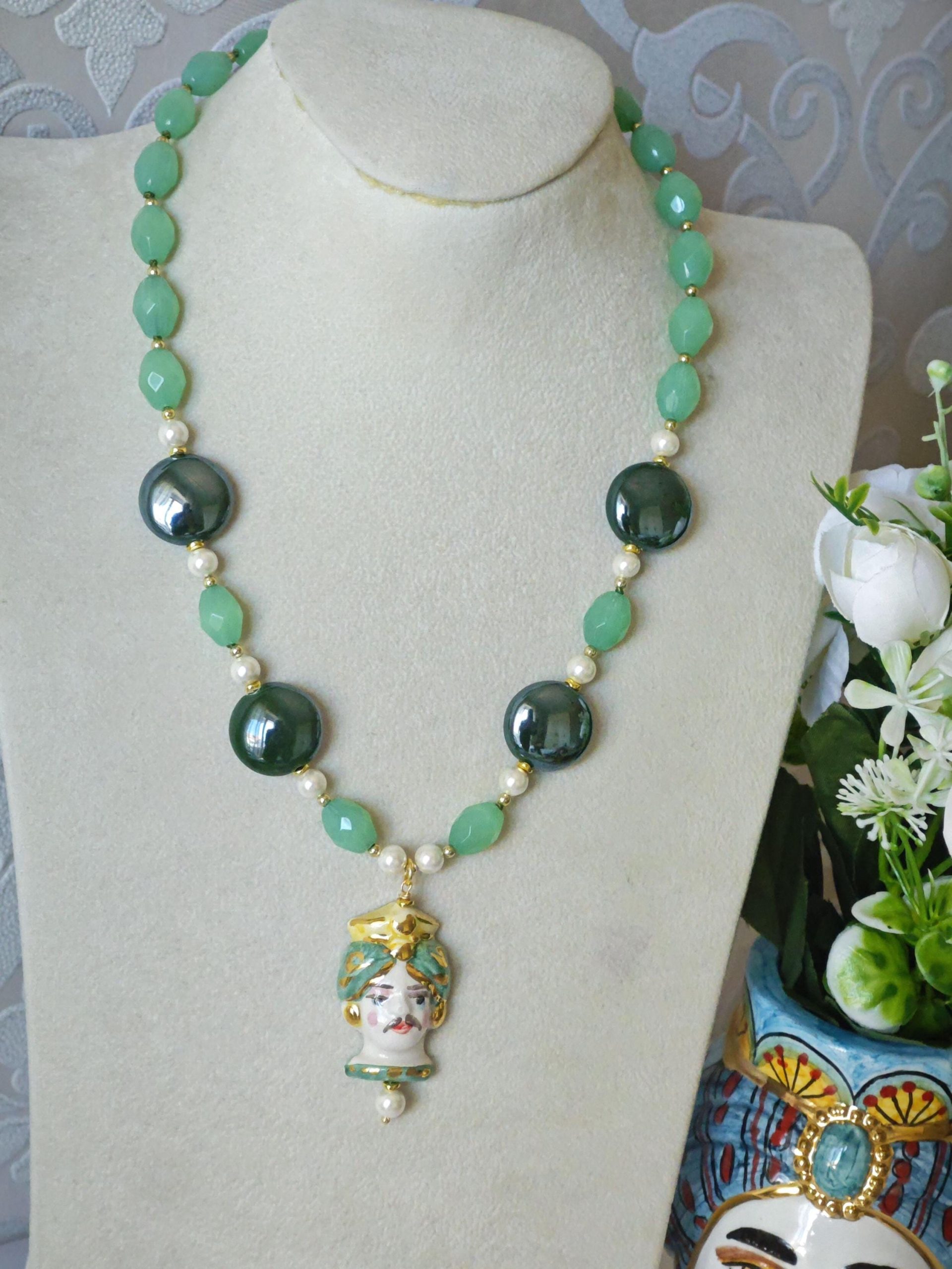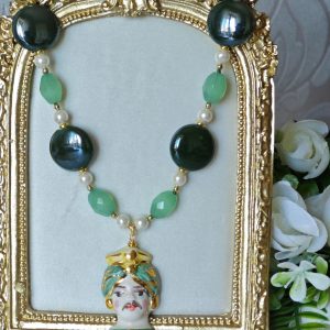 Collana testa di moro in ceramica di Caltagirone con pietre dure quarzo verde , collana siciliana