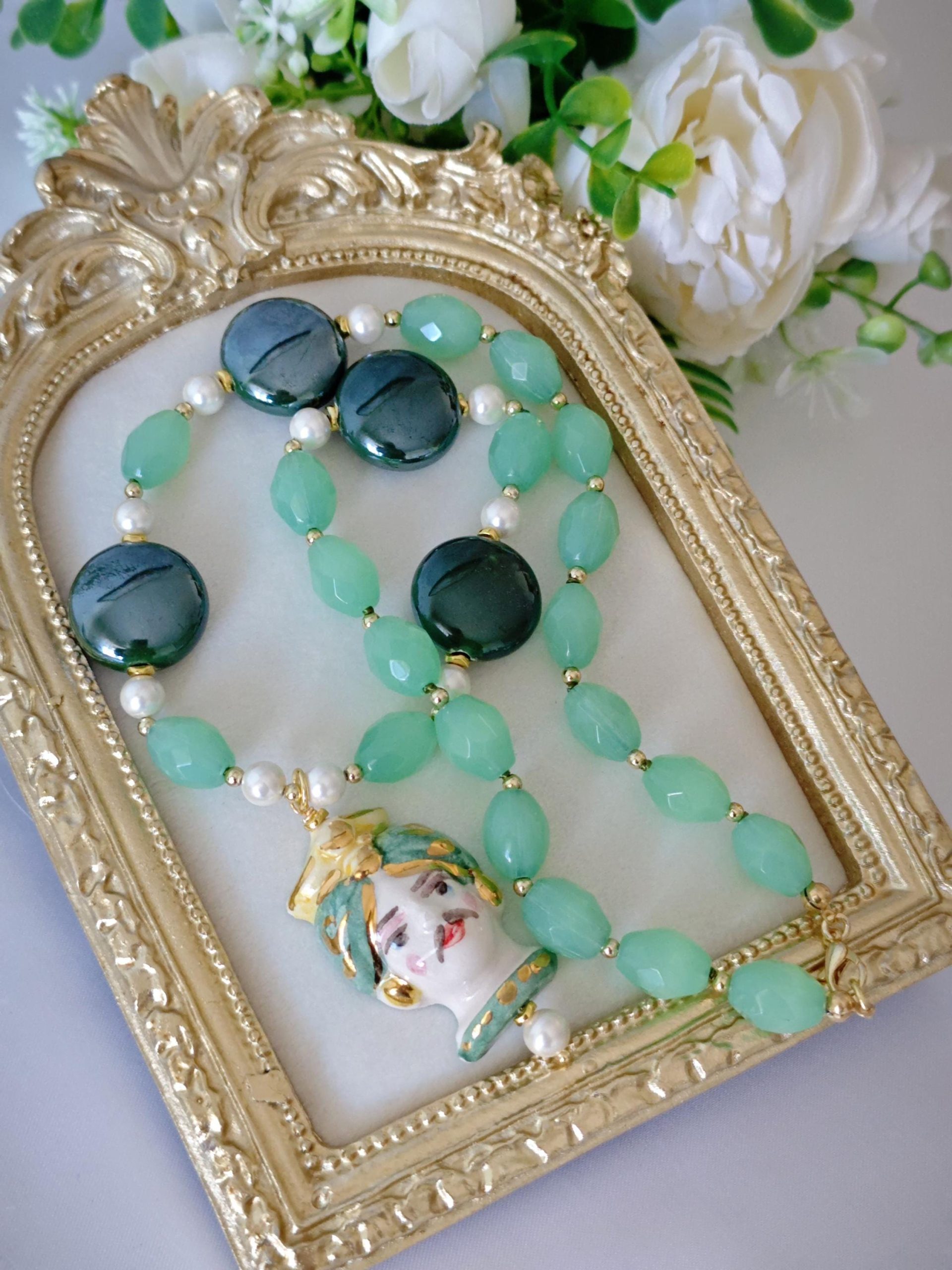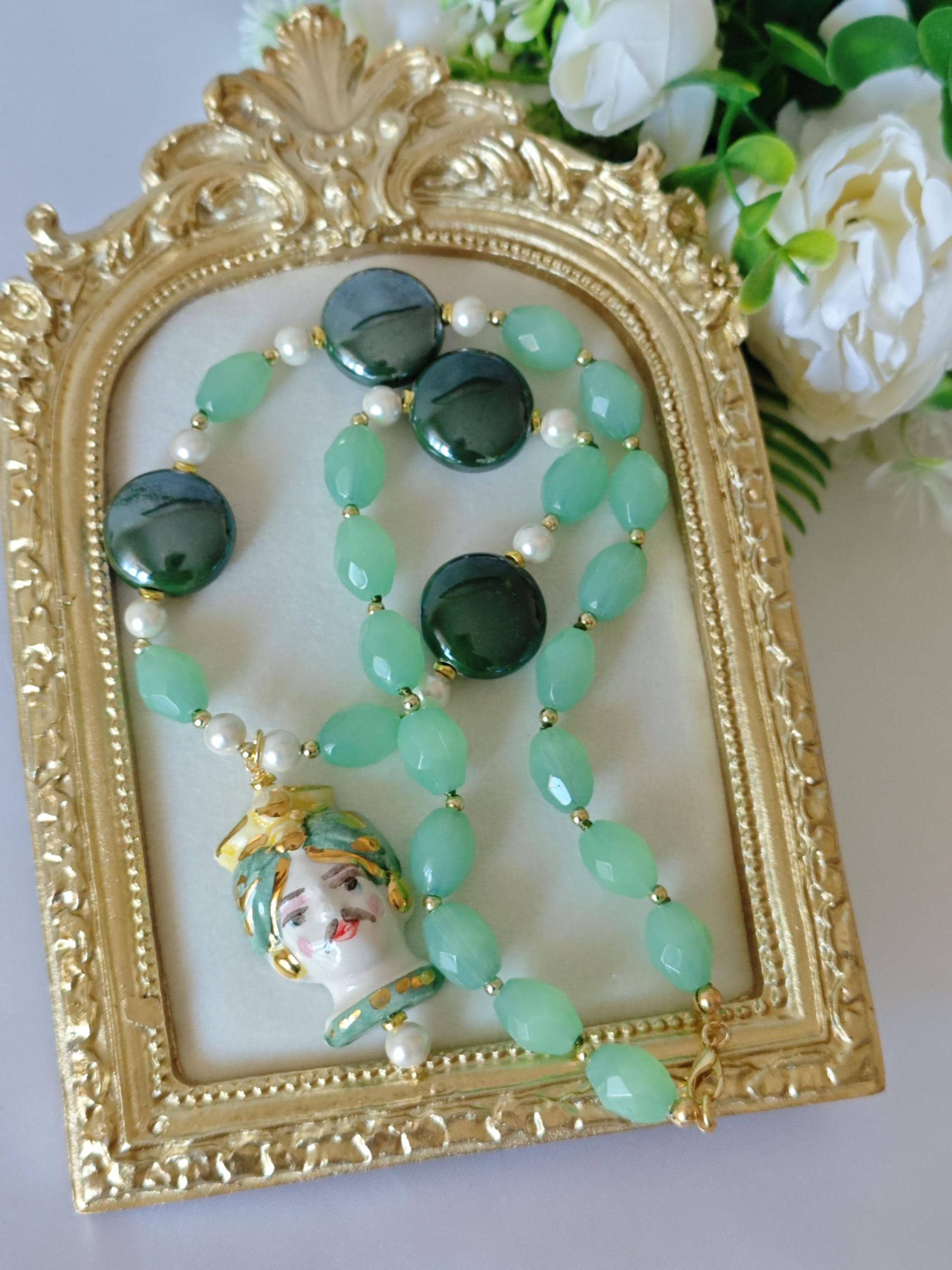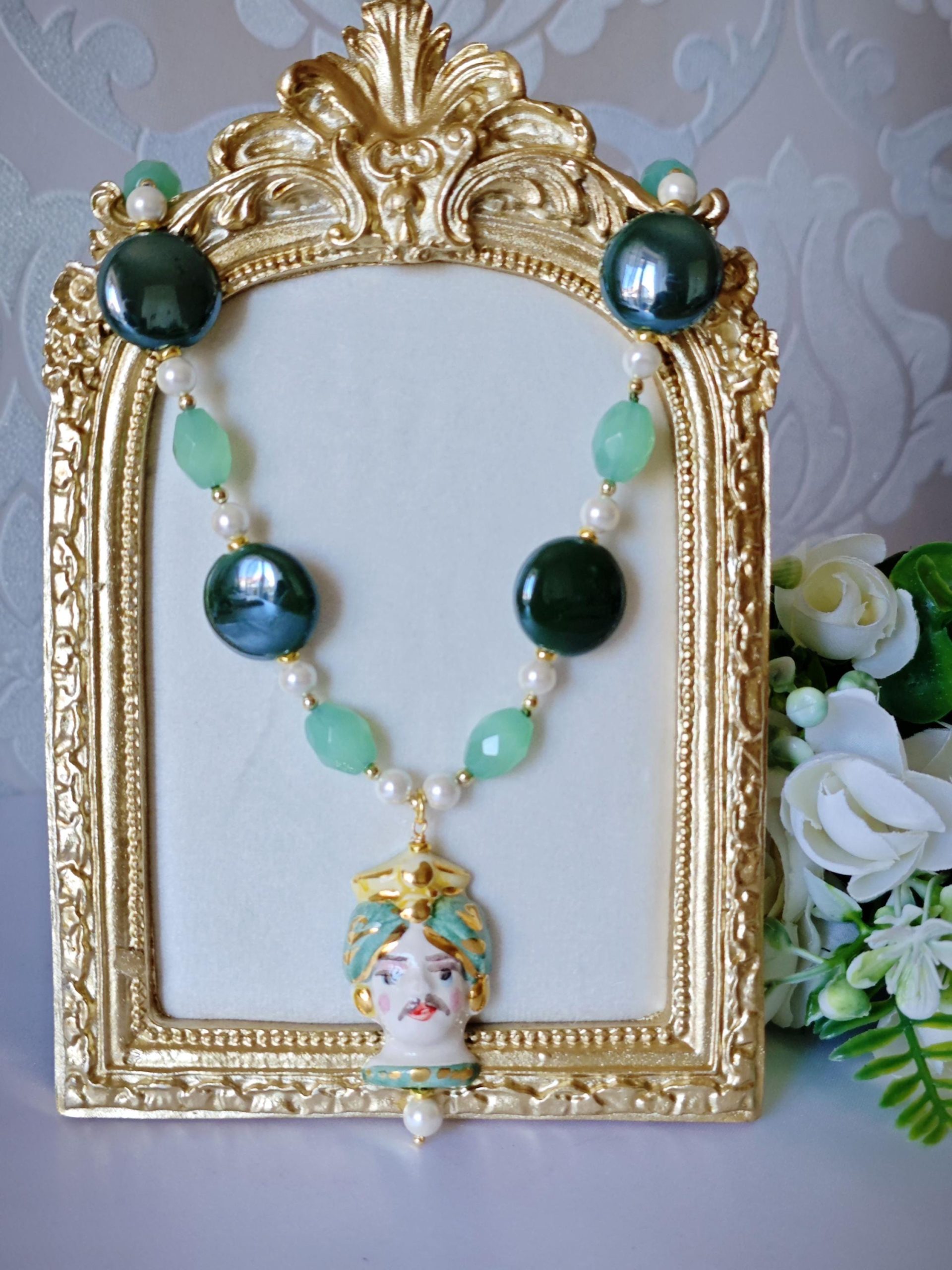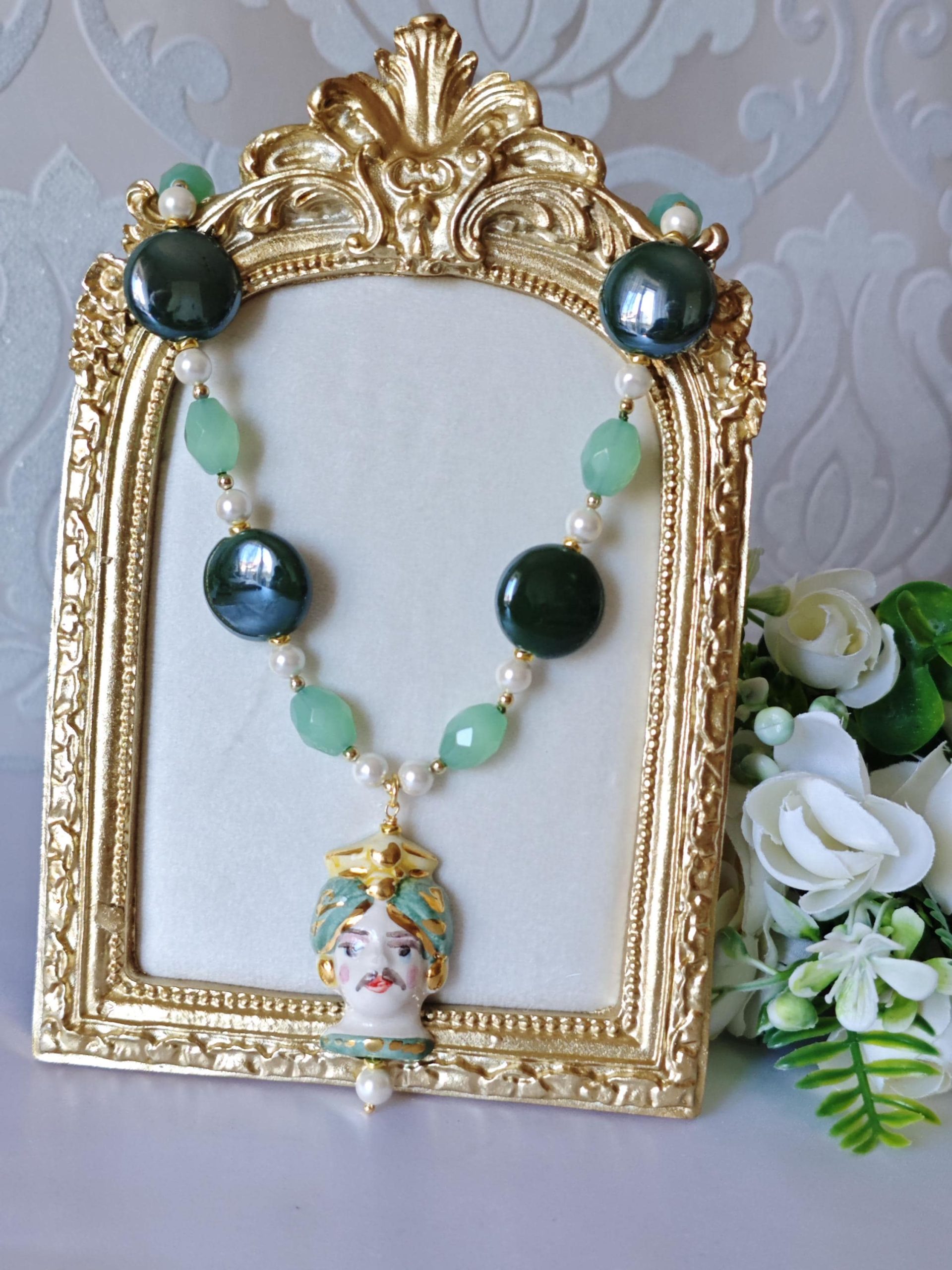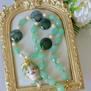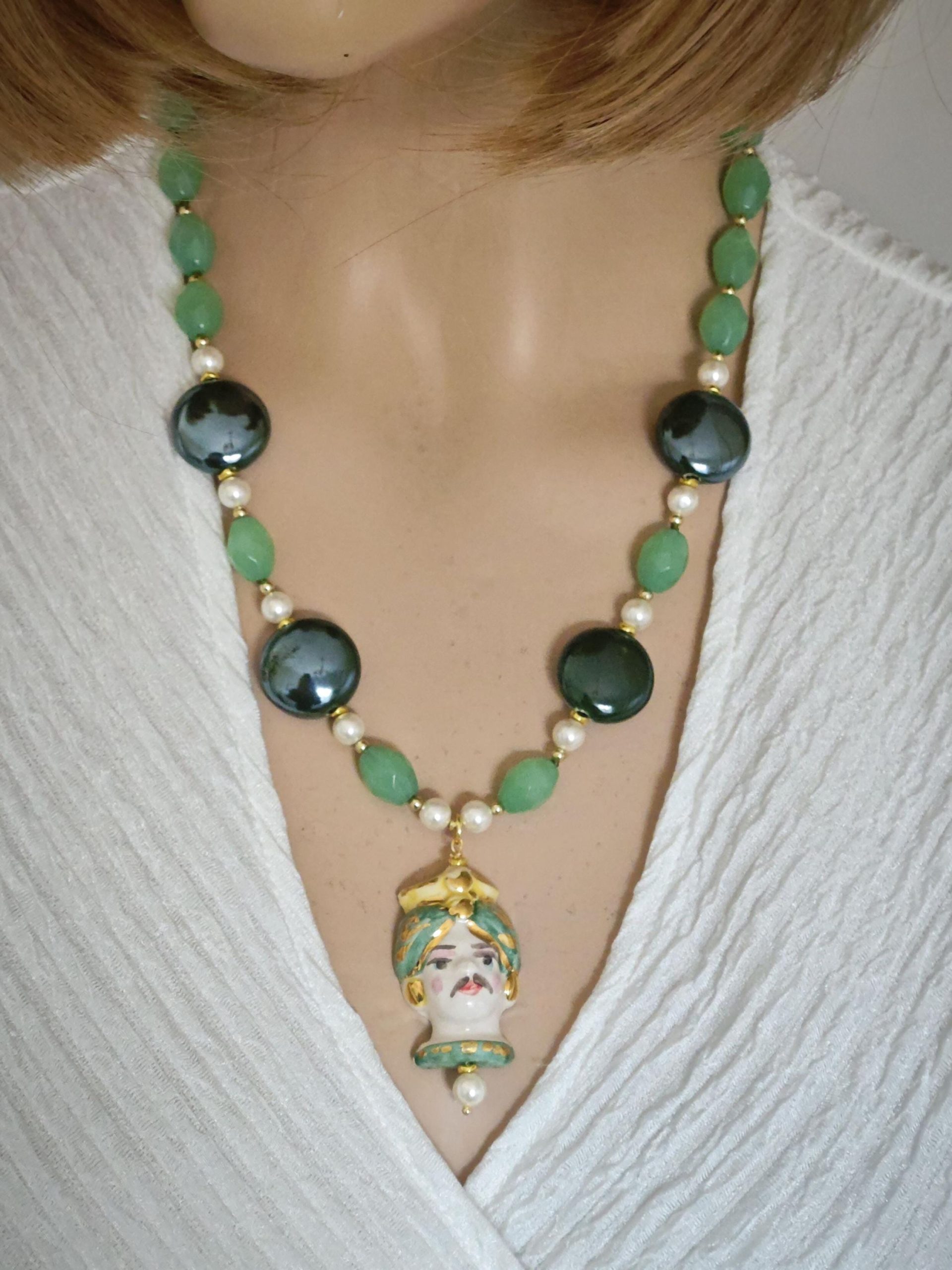 Collana testa di moro in ceramica di Caltagirone con pietre dure quarzo verde , collana siciliana