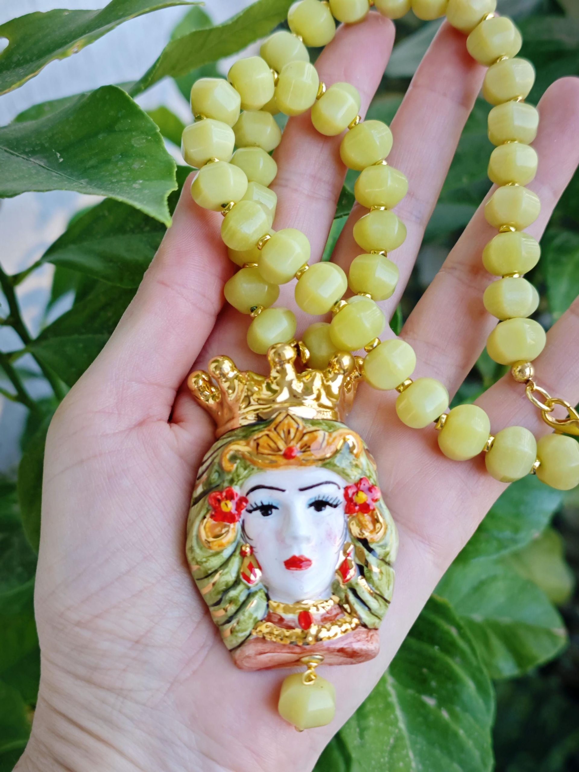 Collana testa di moro in ceramica di Caltagirone con pietre dure quarzo verde , collana siciliana
