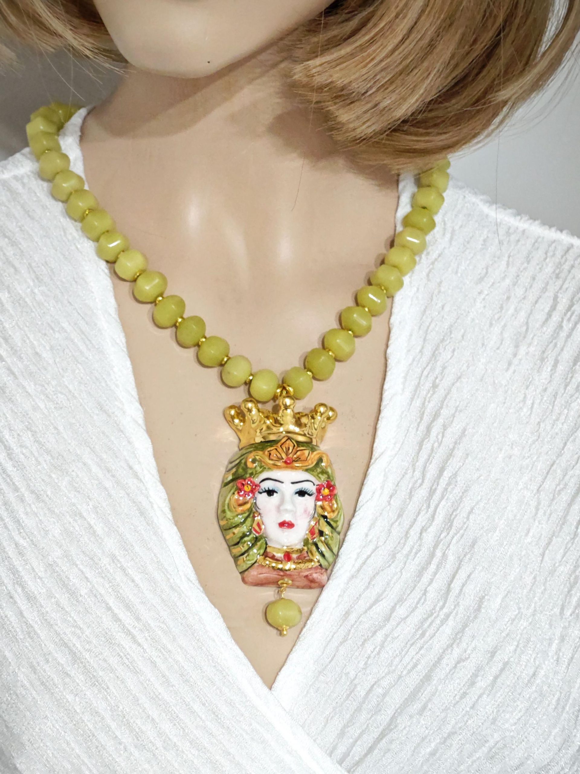 Collana girocollo con pietre dure giada verde olivina a rondella 12 mm e pendente testa di moro donna in ceramica di Caltagirone realizzata e dipinta a mano, con applicazioni foglia oro 22 kt , 65 cm dimensioni.