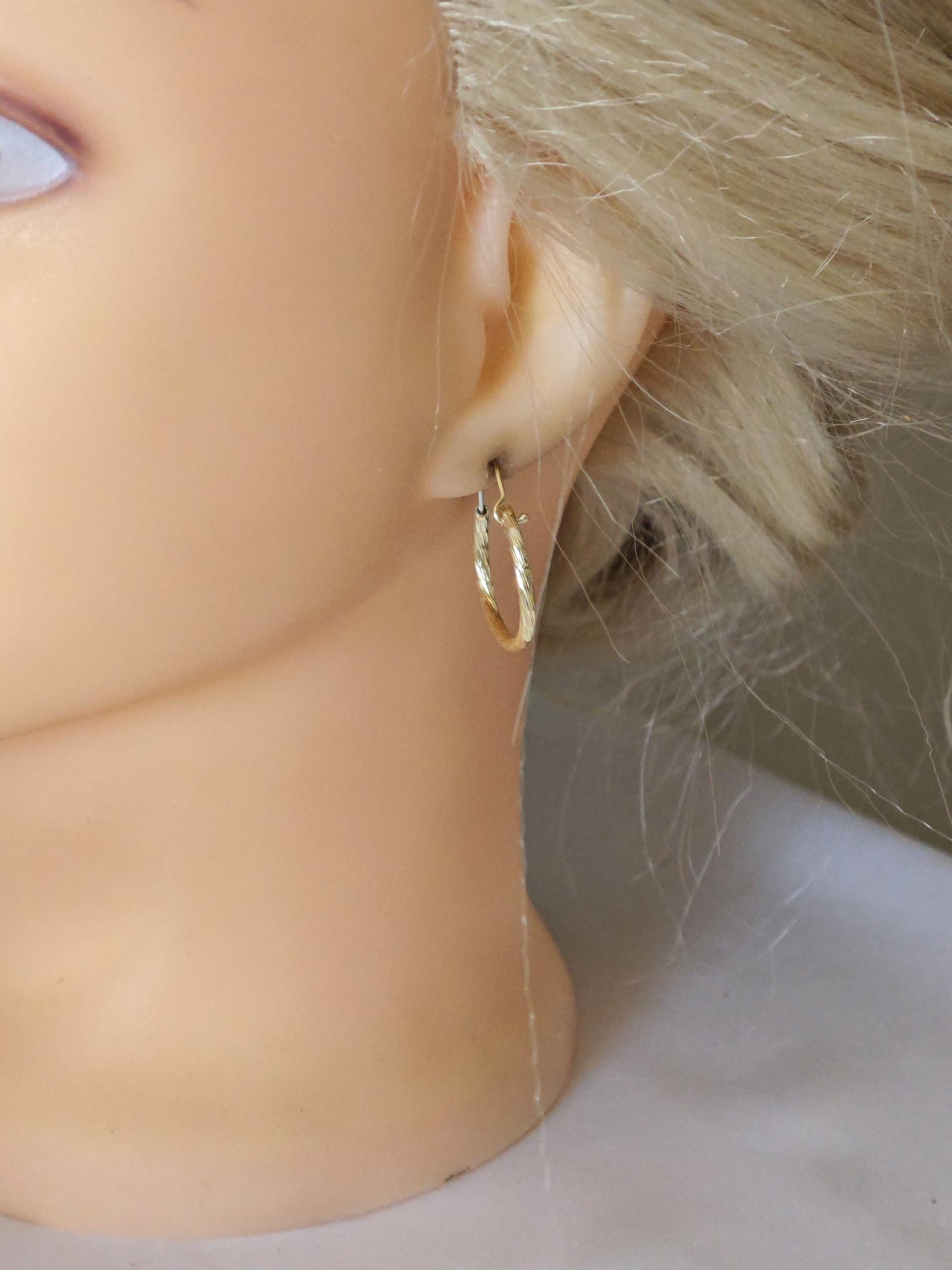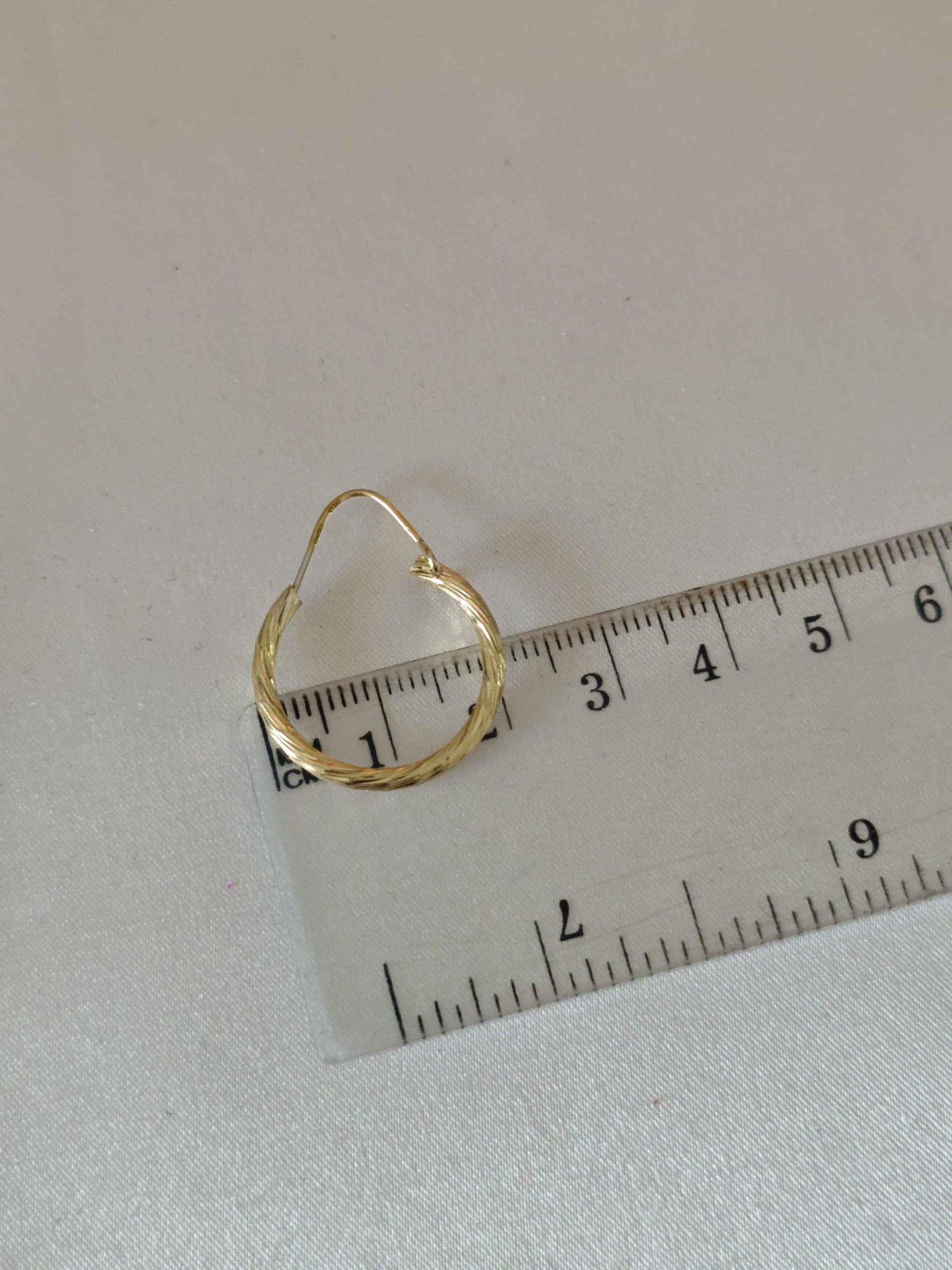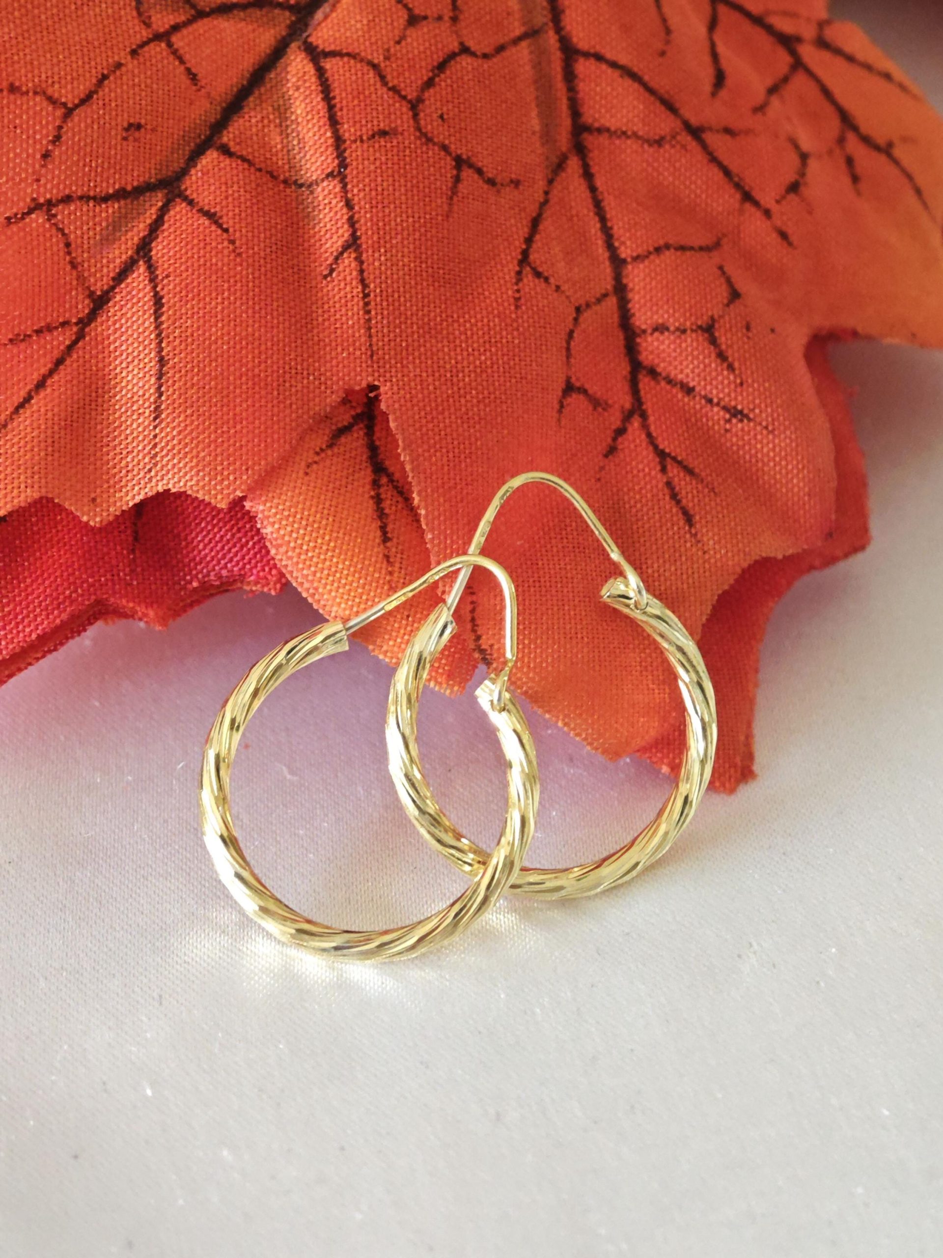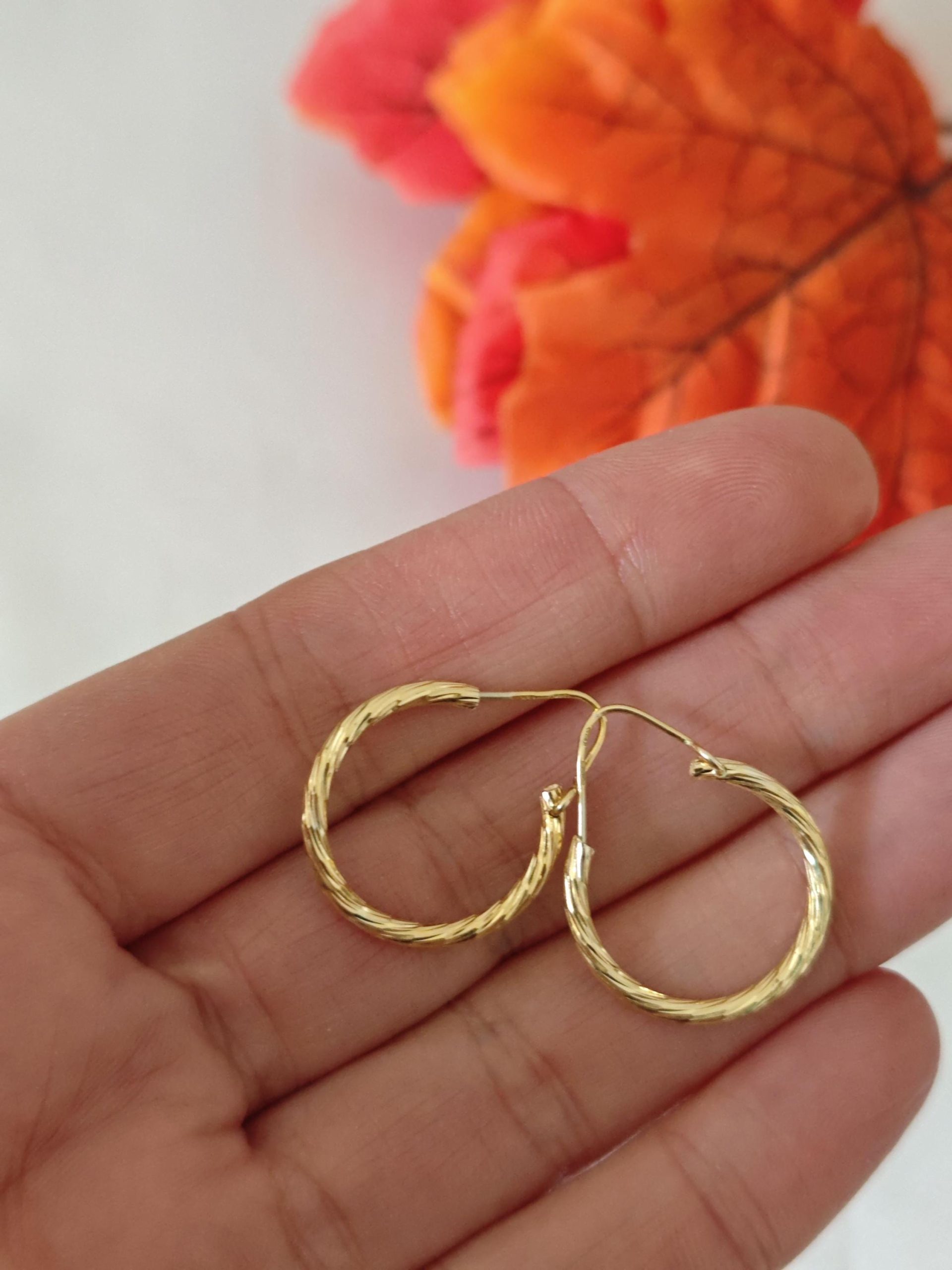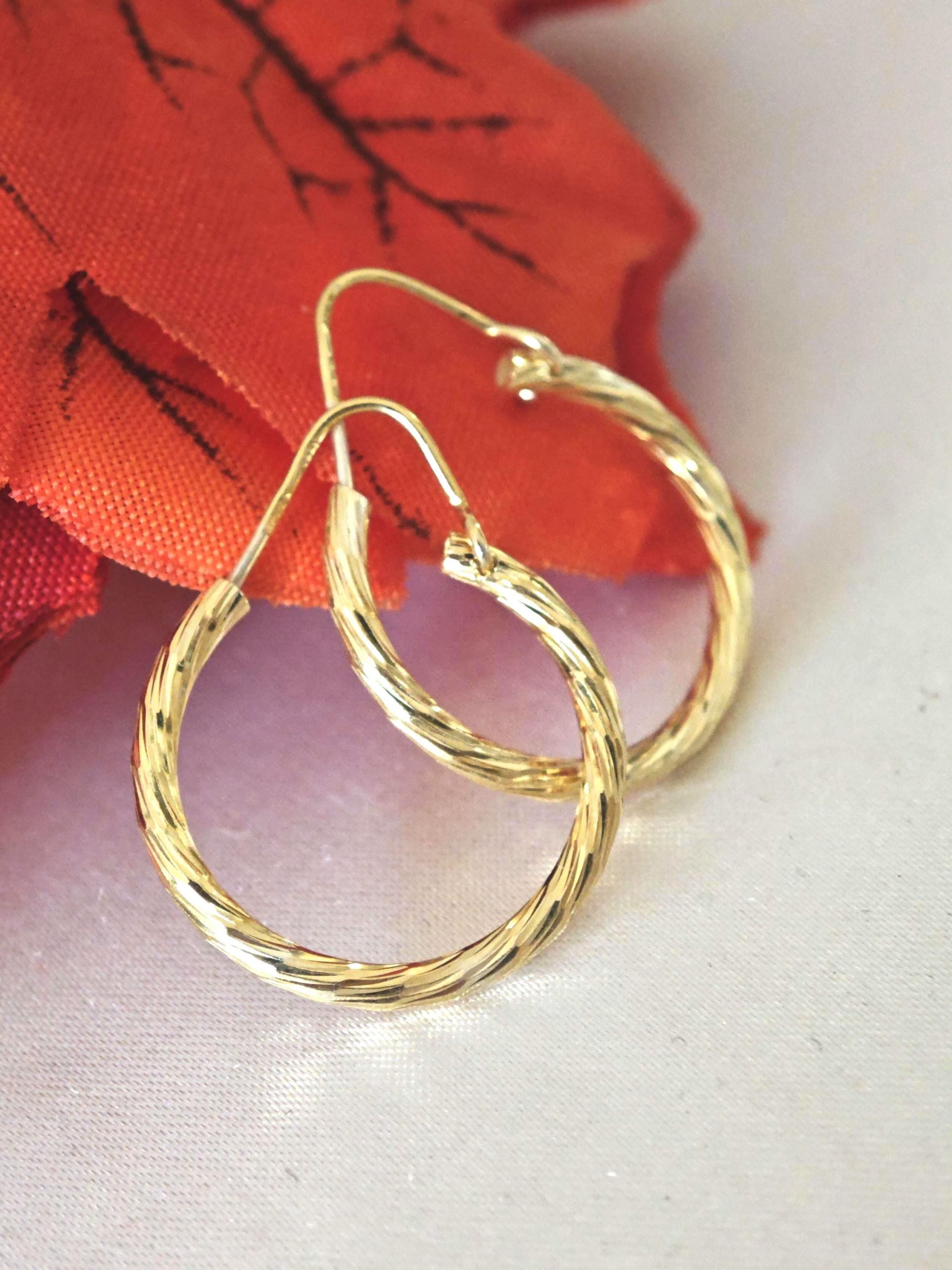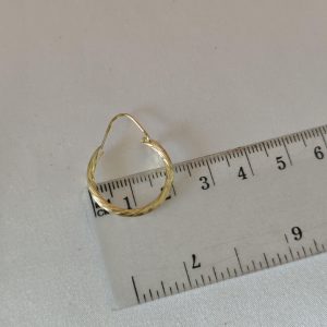Orecchini artigianali a cerchio con lavorazione diamantata 2 cm diametro in argento 925 placcato oro 18 kt.