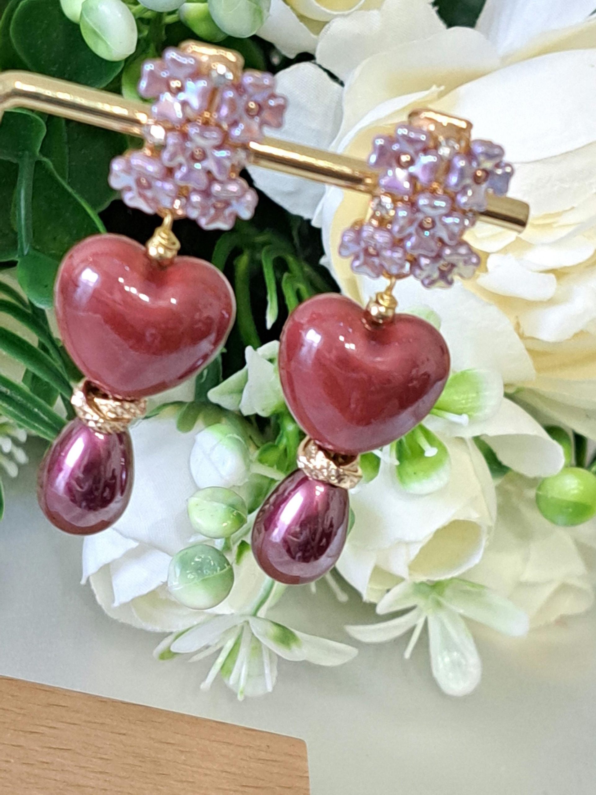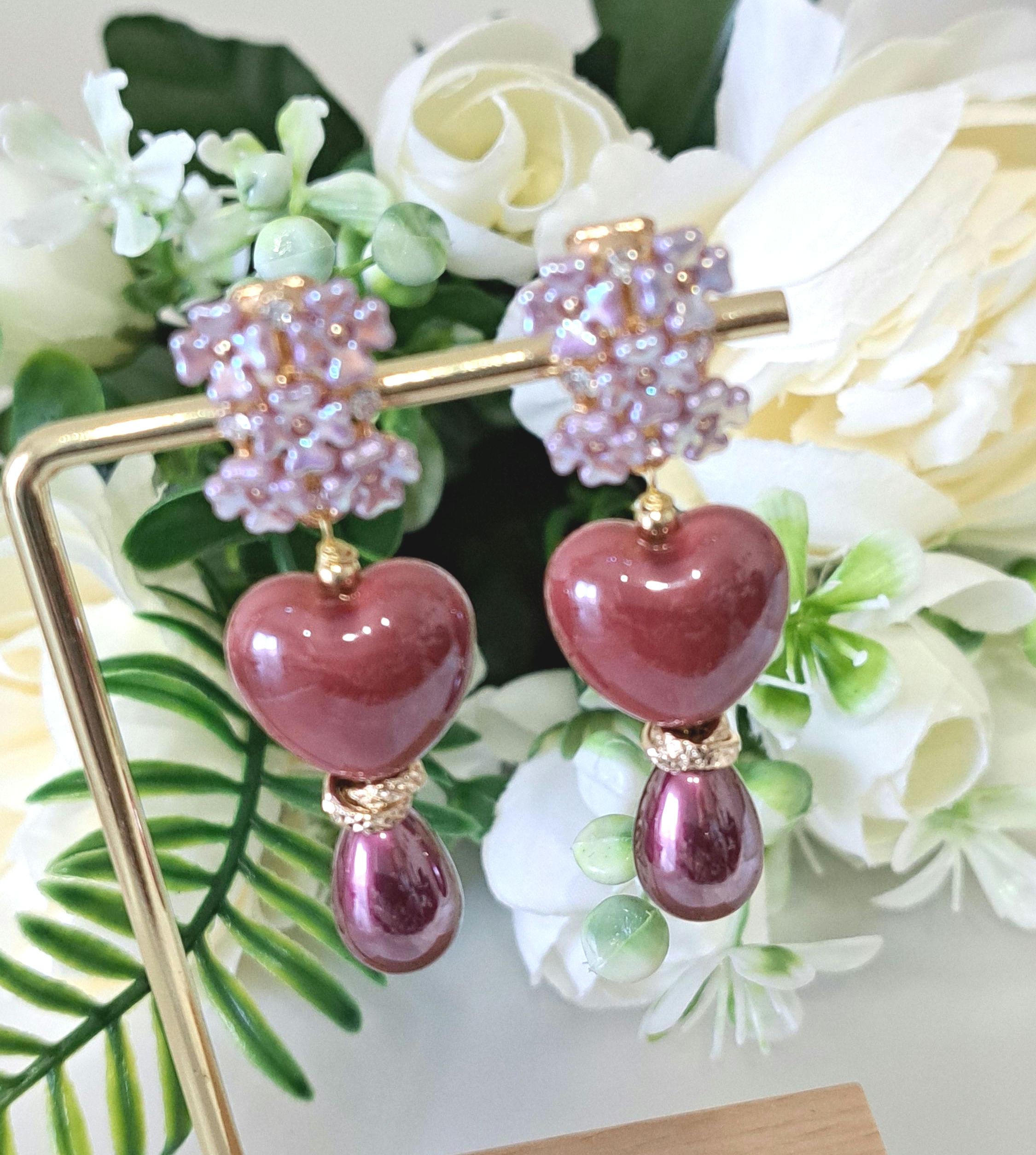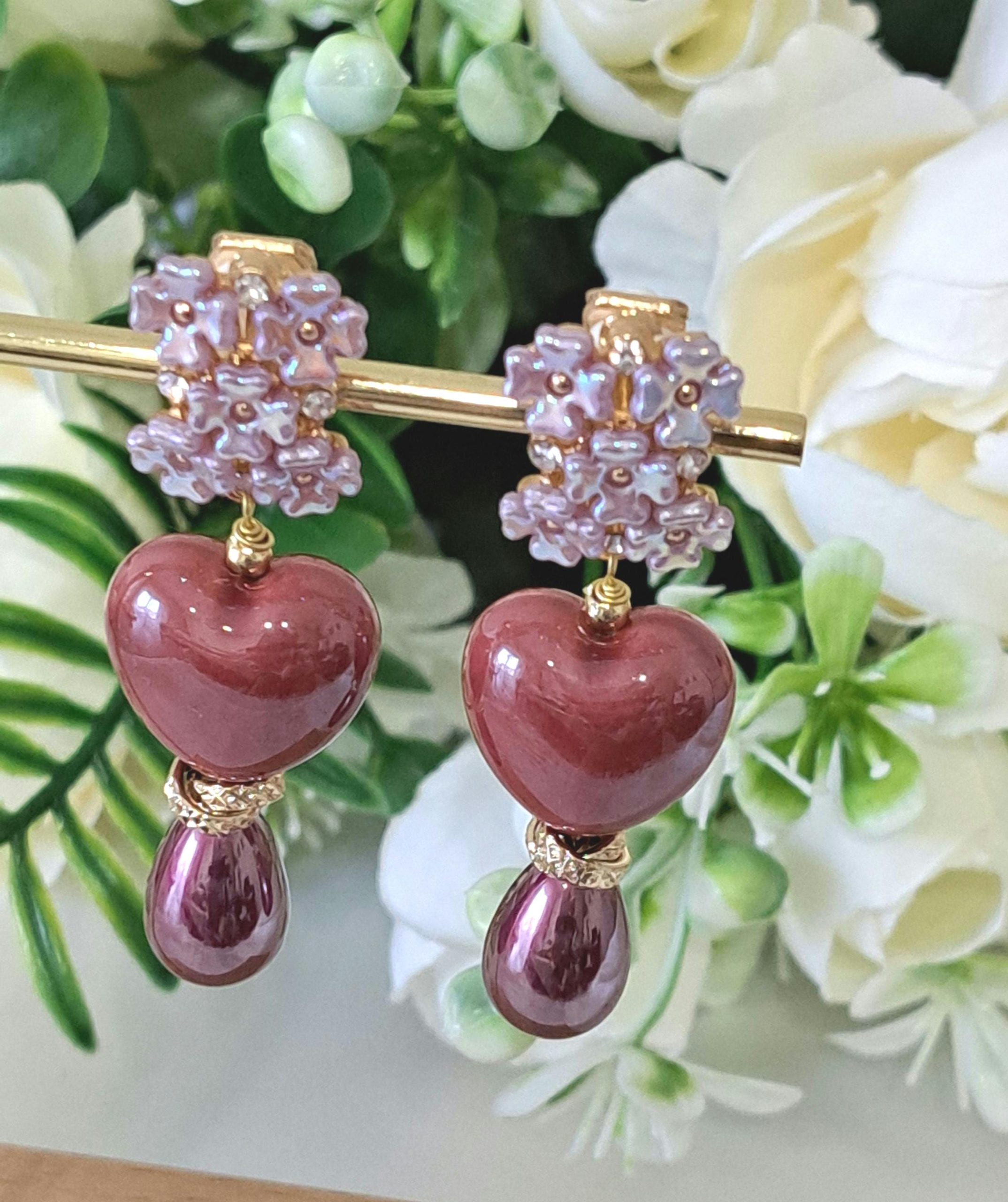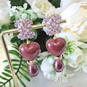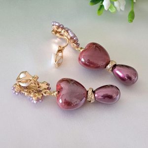 Orecchini pendenti con cuori in ceramica 1,5×1,8 cm dimensioni con perle goccia viola imitazione.