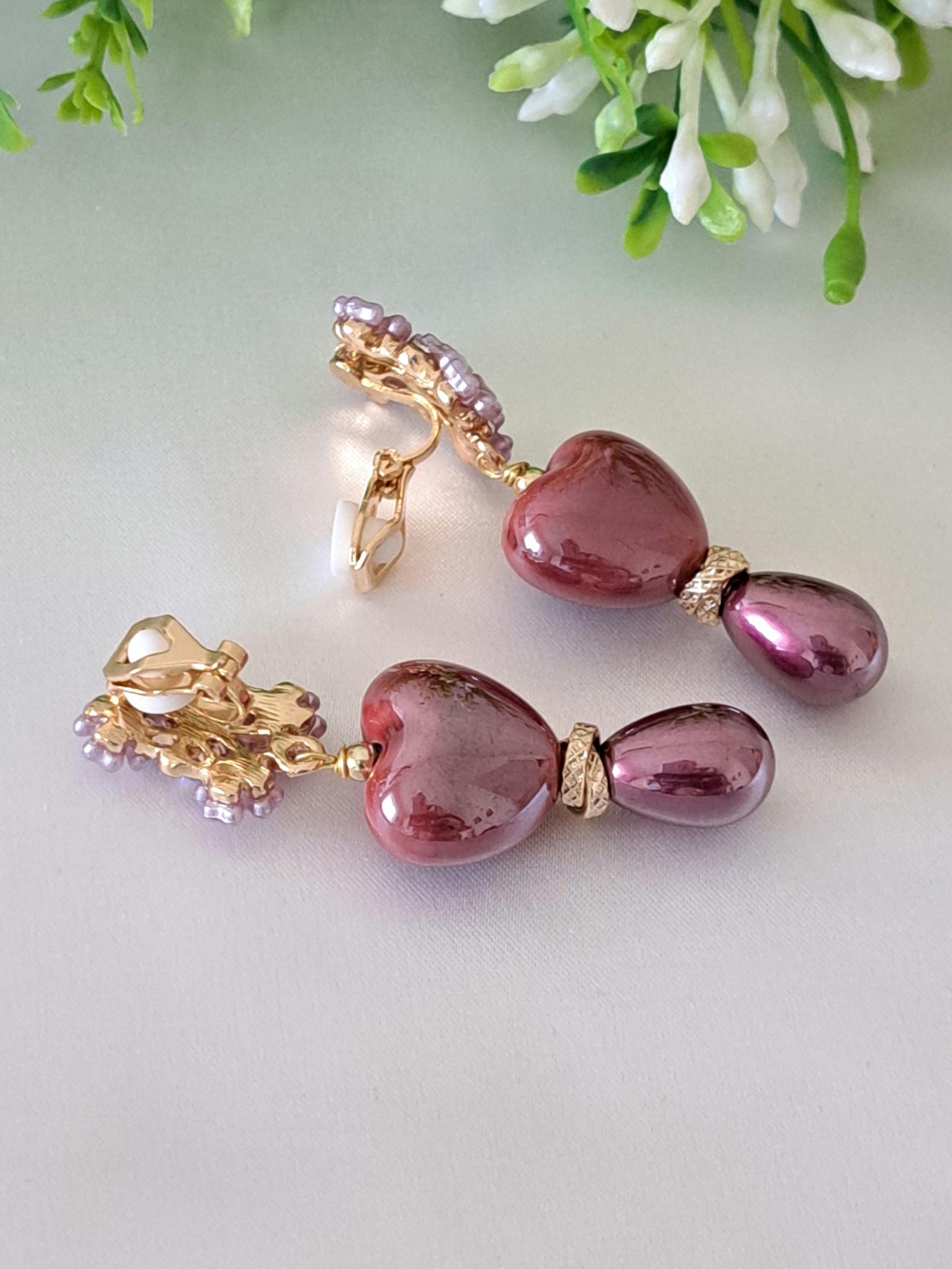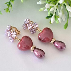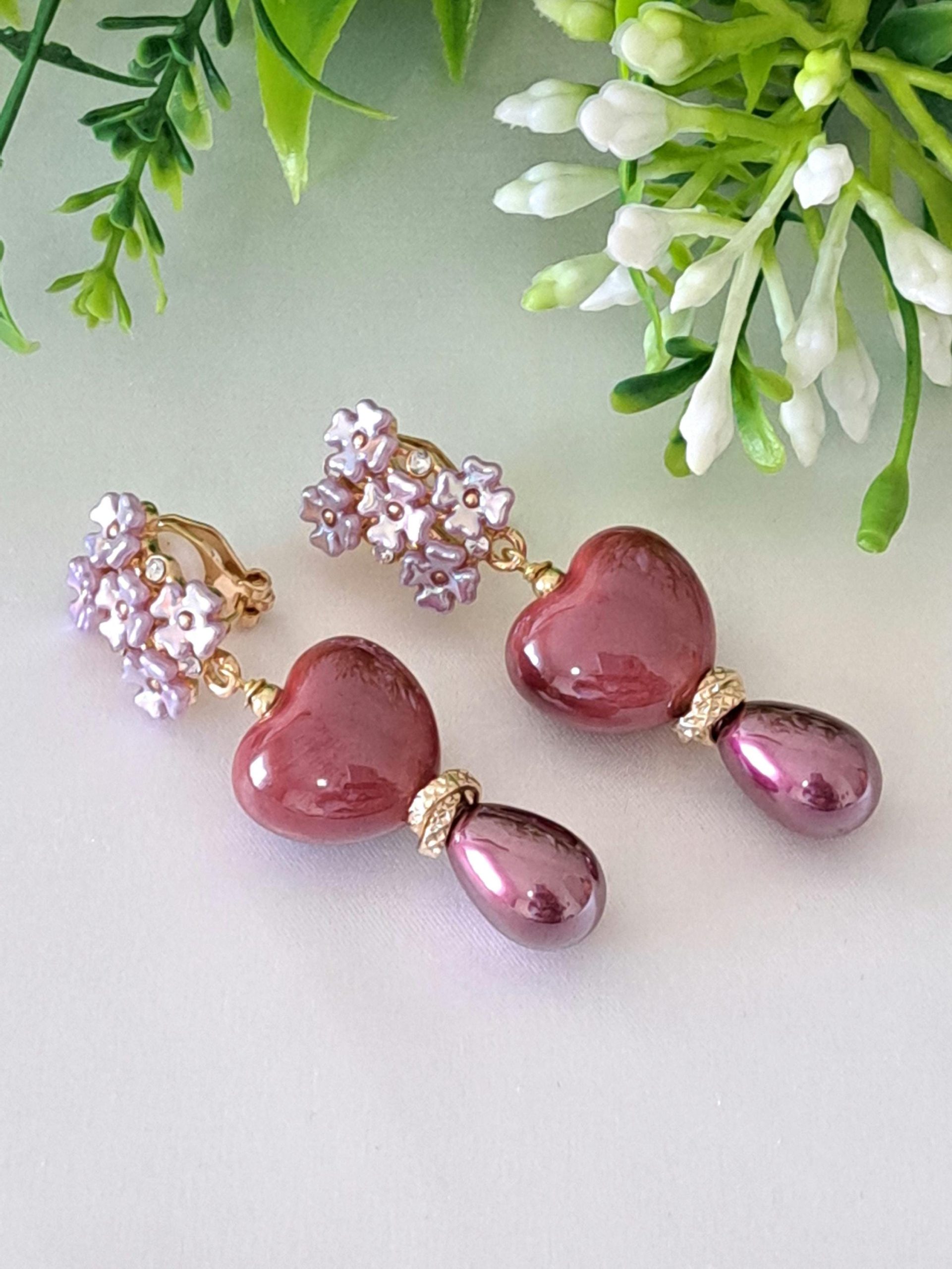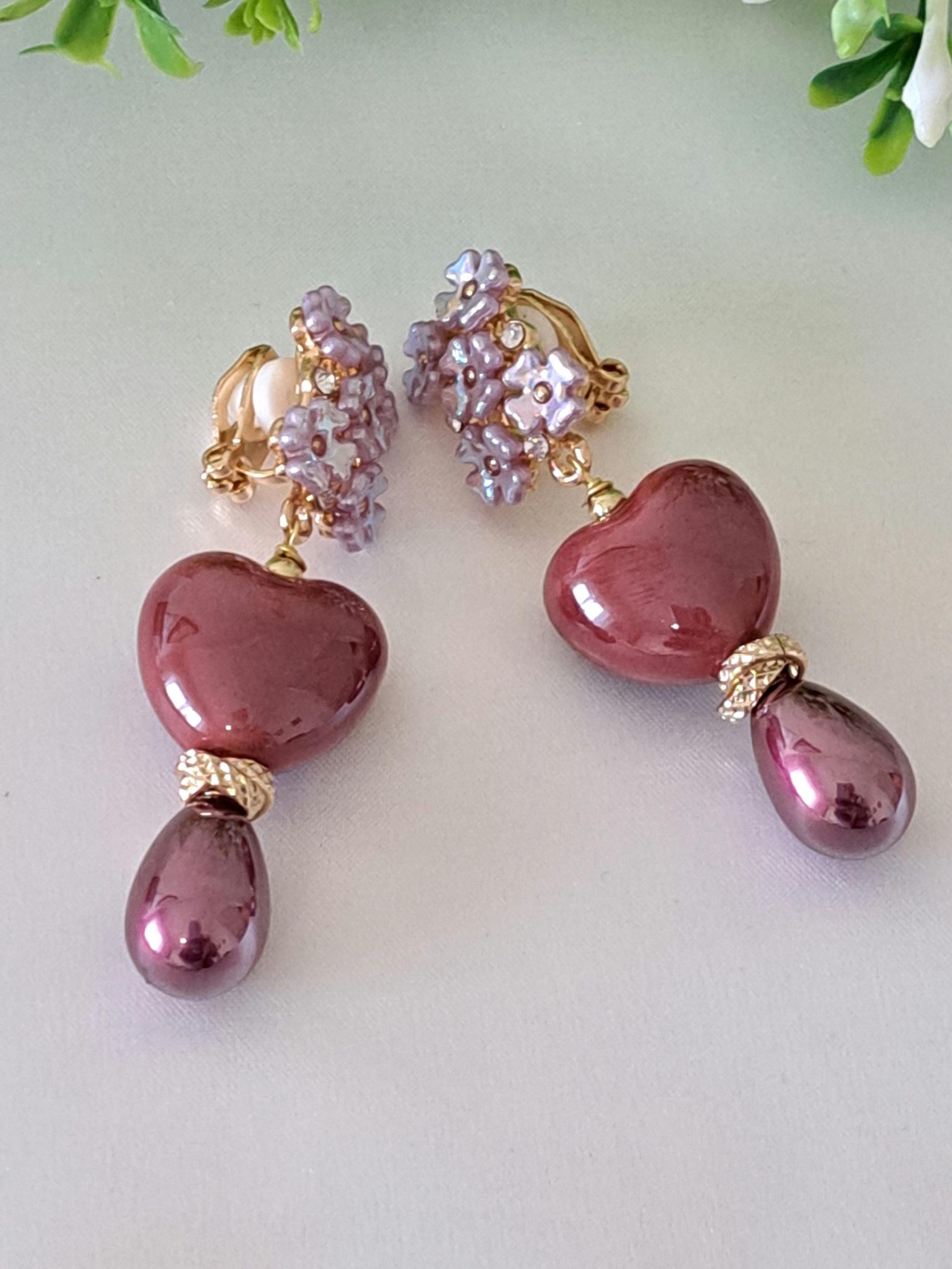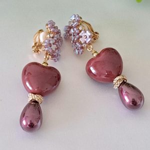 Orecchini a clip con cuori ceramica e perle goccia viola , orecchini fiori