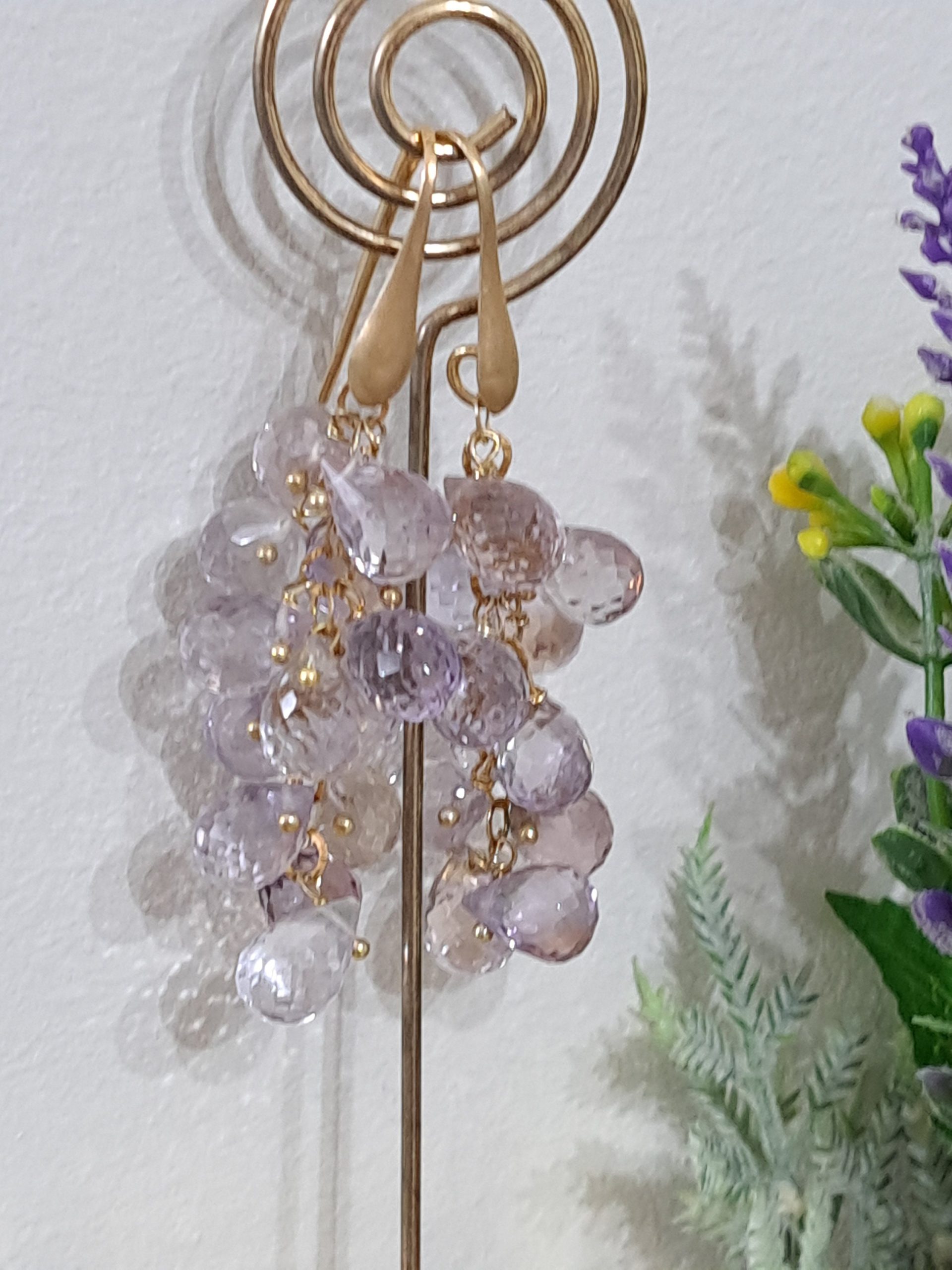 Orecchini a grappolo pietre briolette ametrino, orecchini ametista , orecchini argento 925 placcato oro