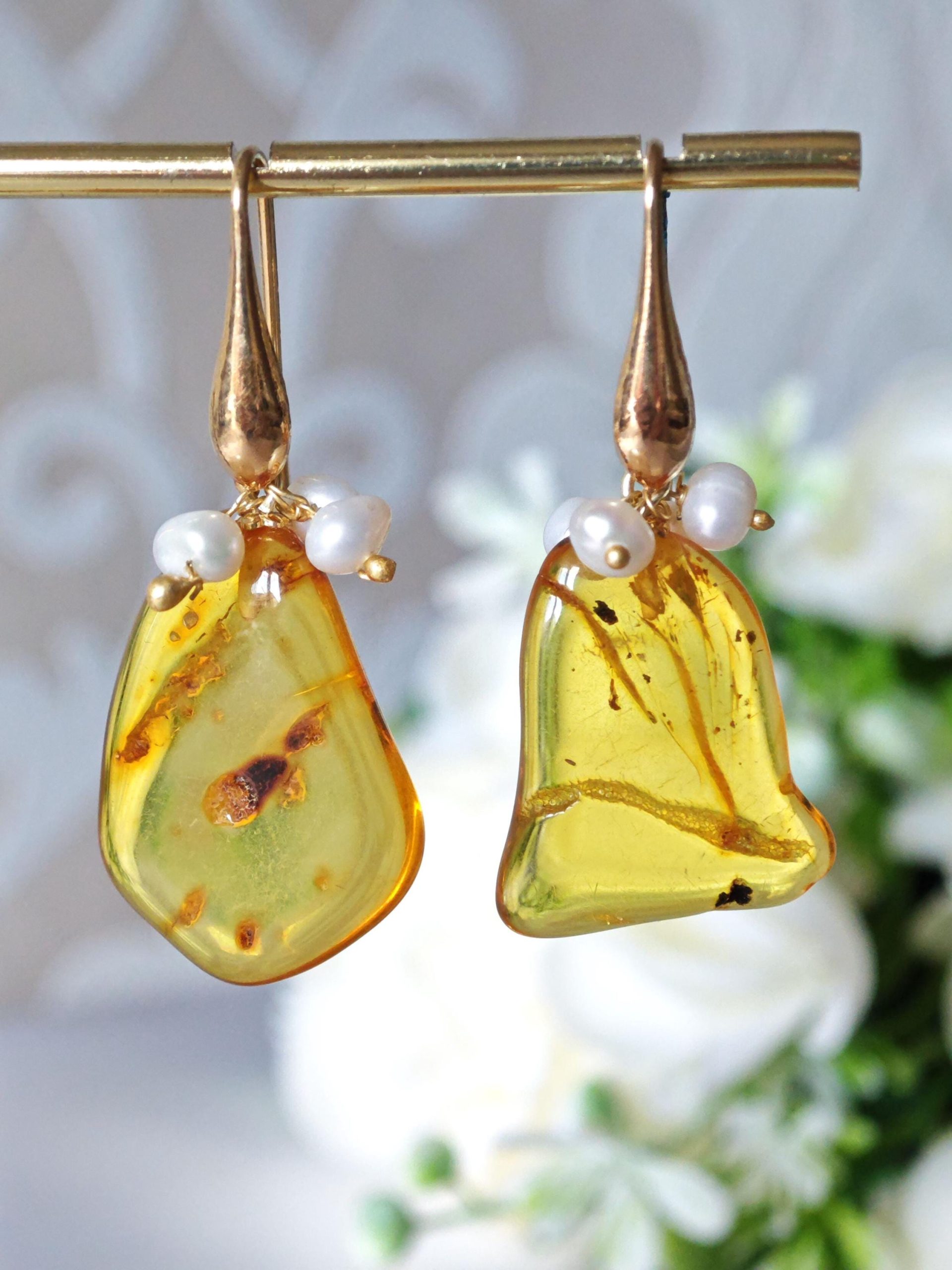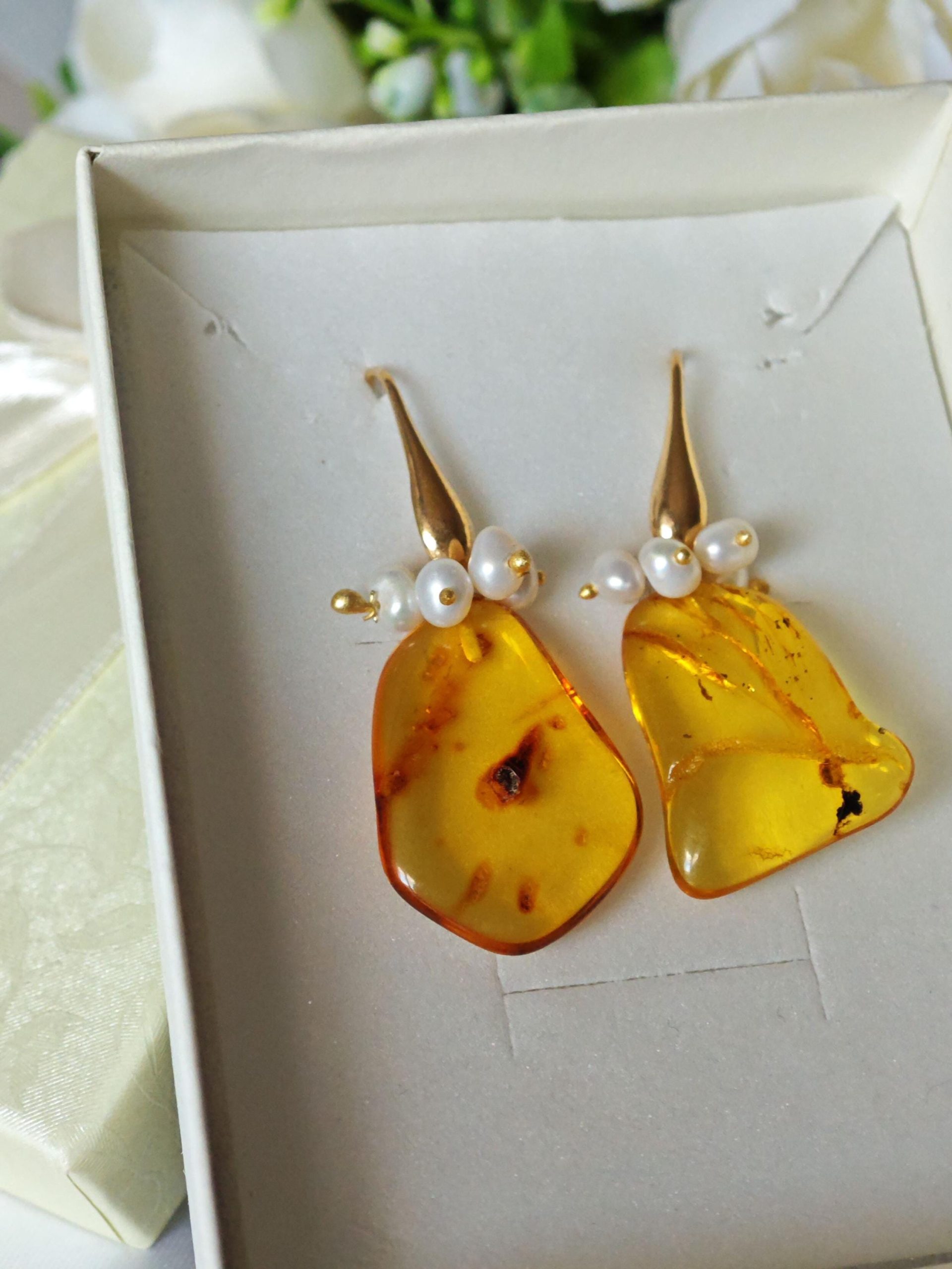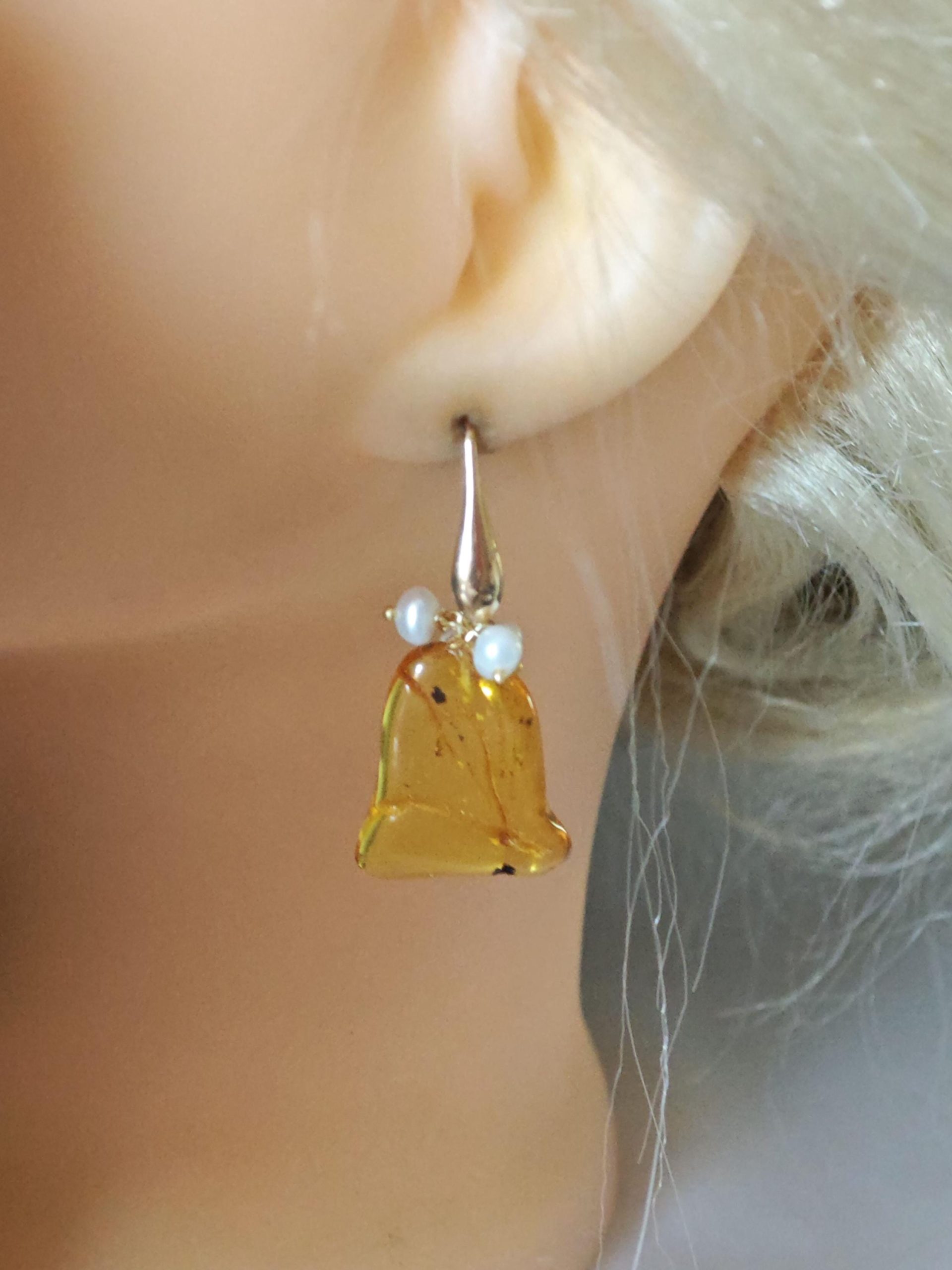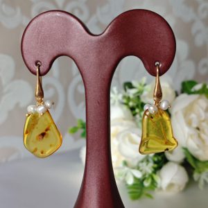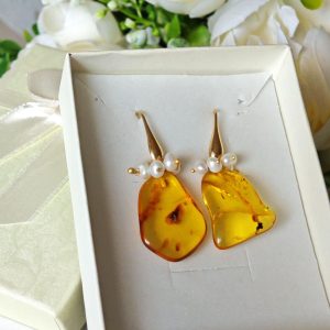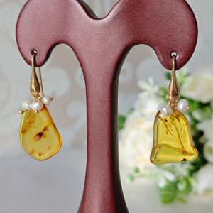 Orecchini pendenti realizzati con ambra baltica naturale , perle naturali bianche , chiusura a monachelle in argento 925 placcato oro.