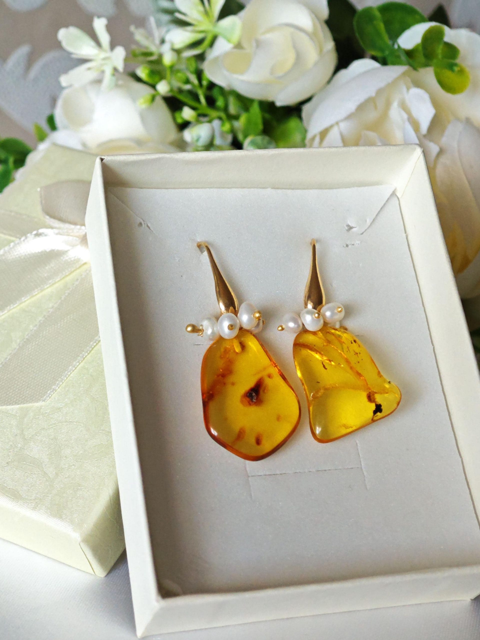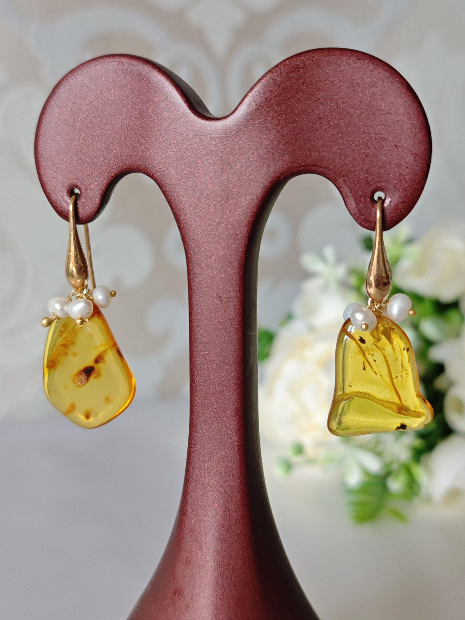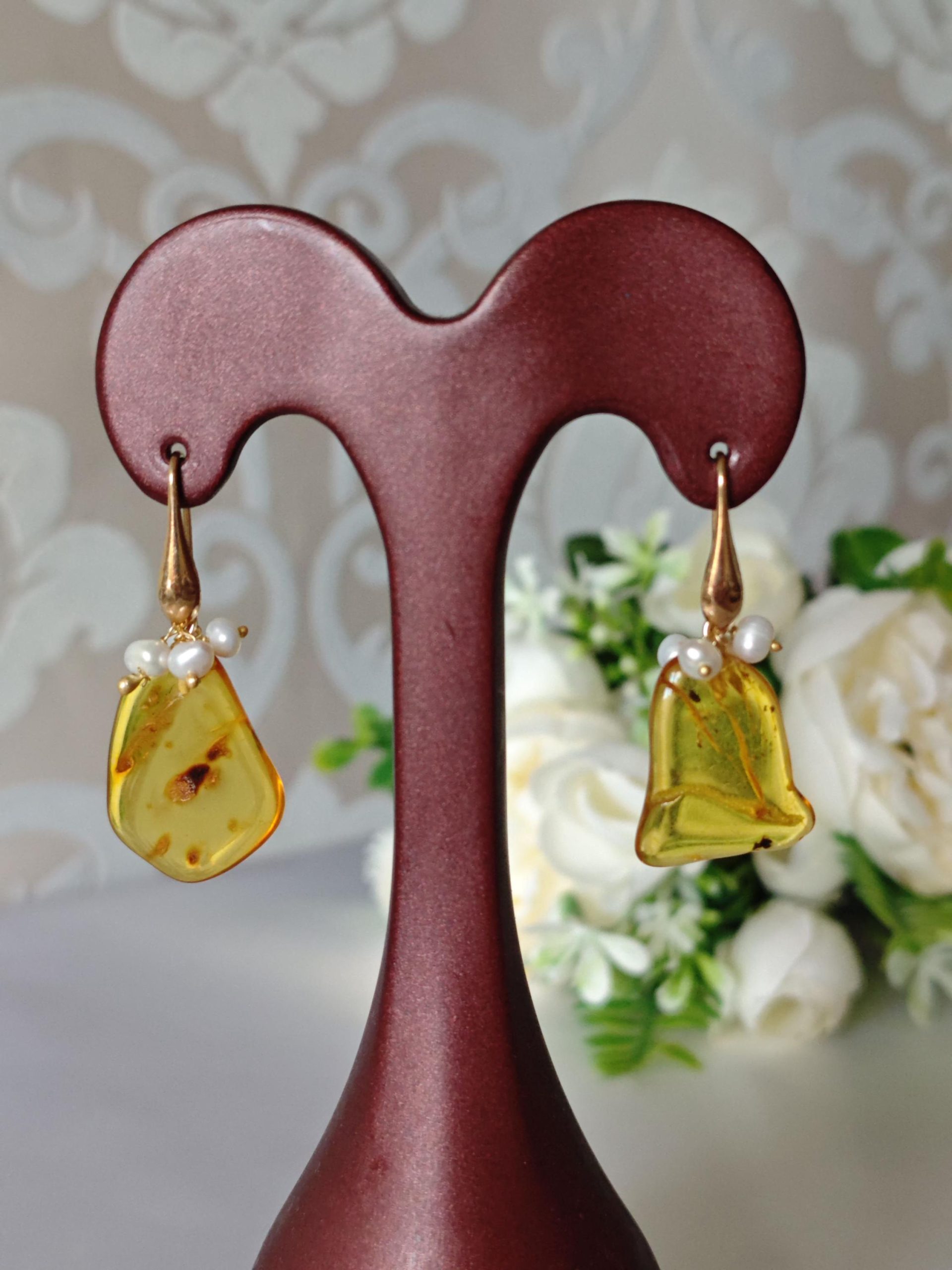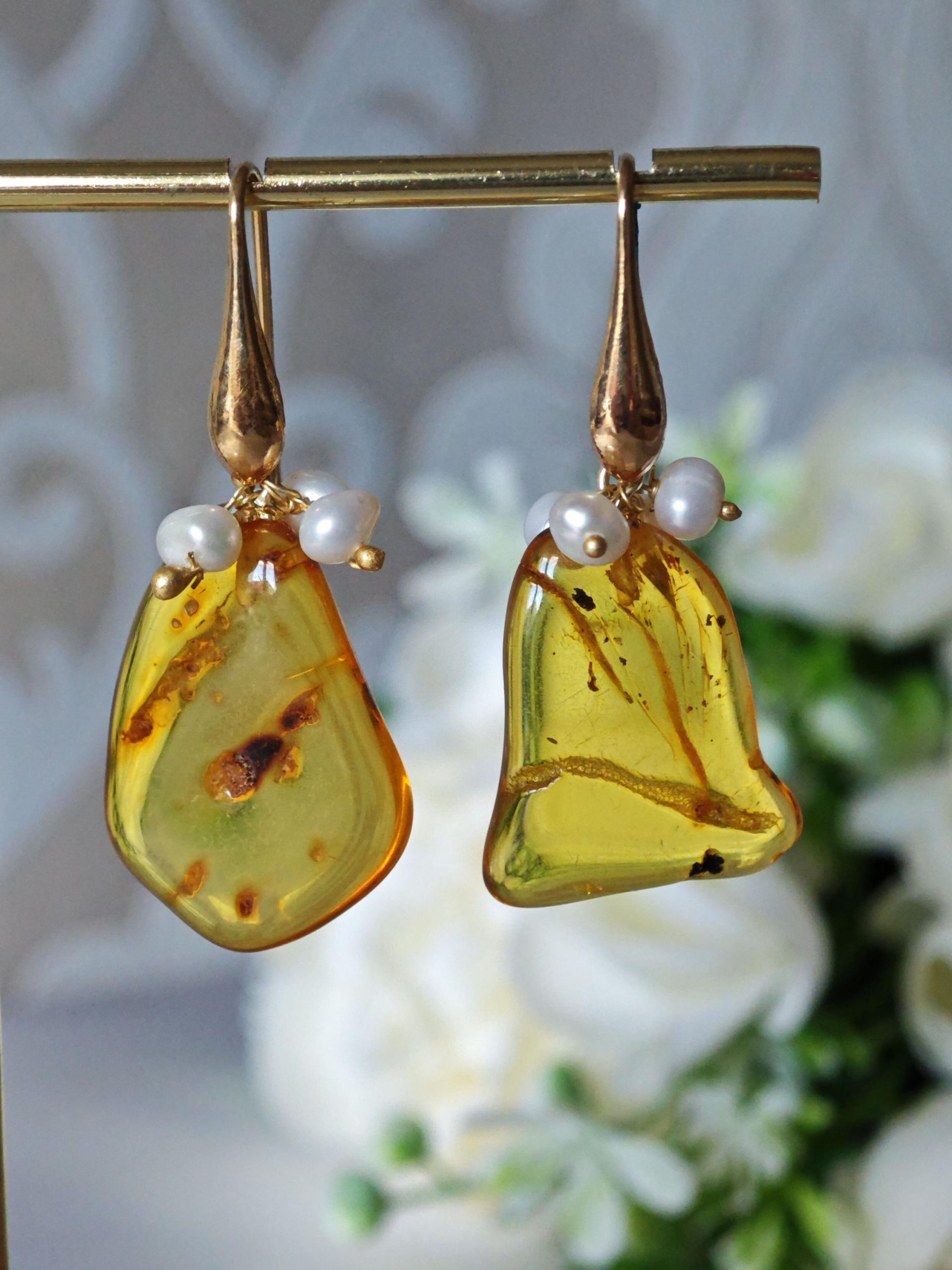 Orecchini pendenti realizzati con ambra baltica naturale , perle naturali bianche , chiusura a monachelle in argento 925 placcato oro.
