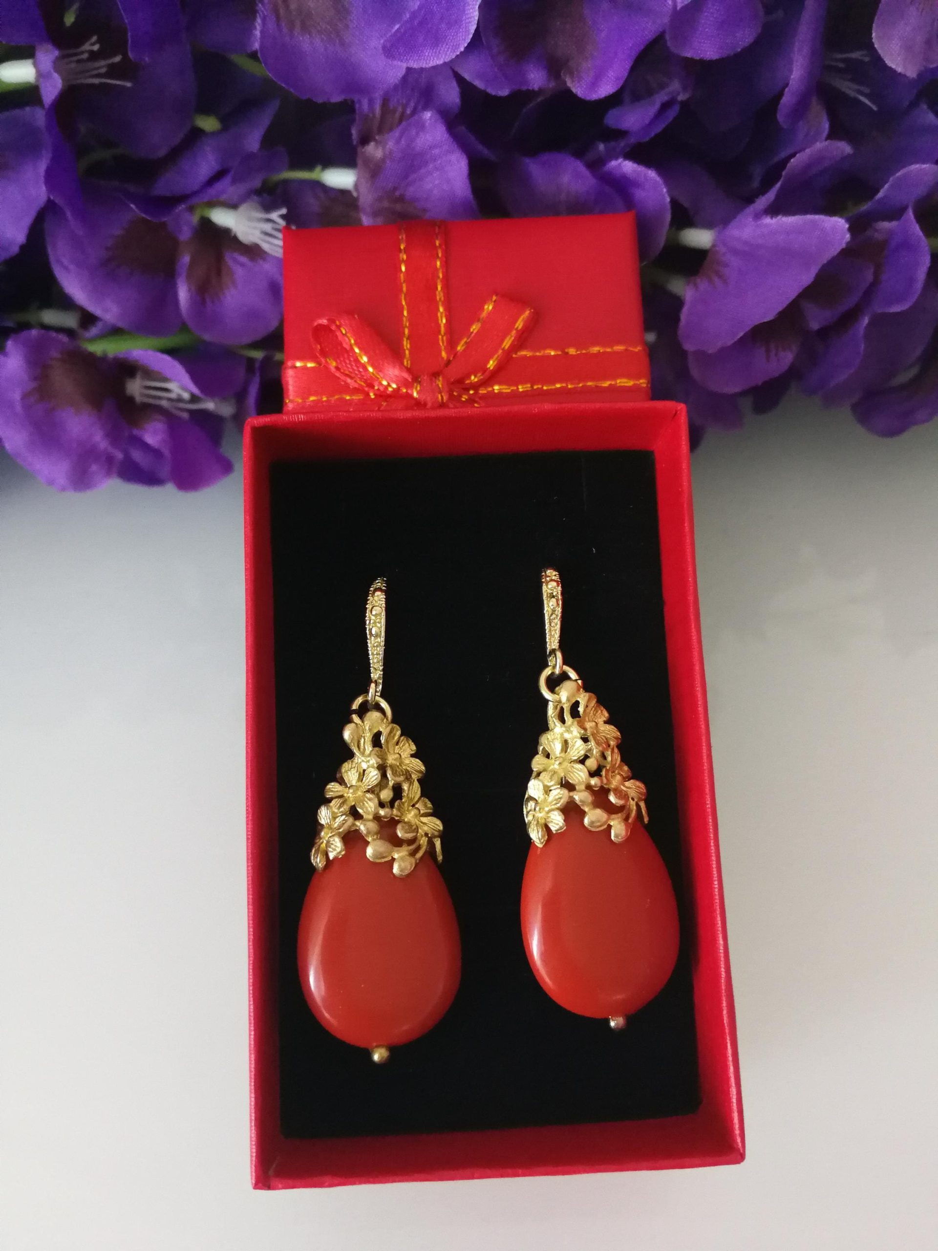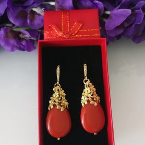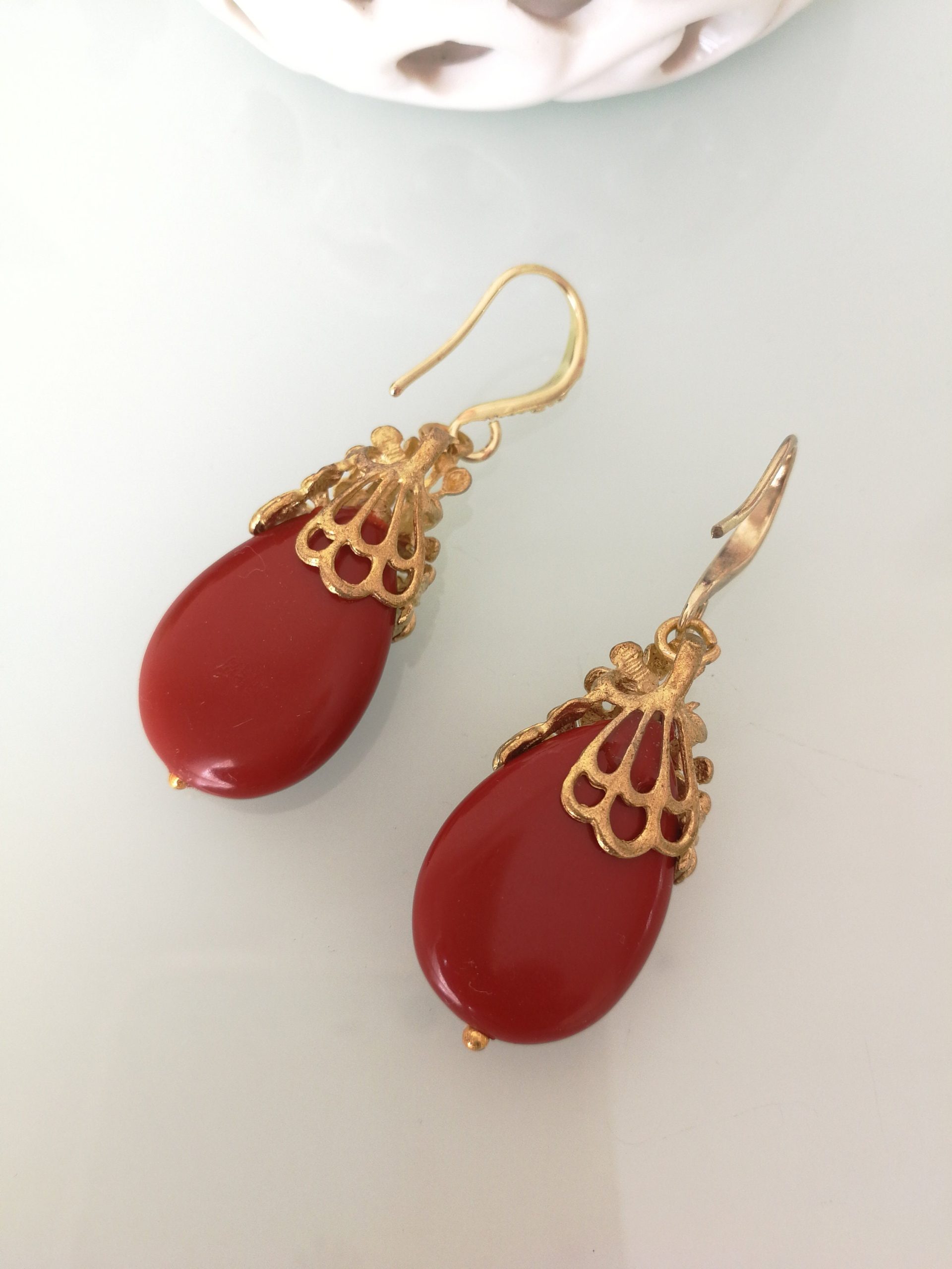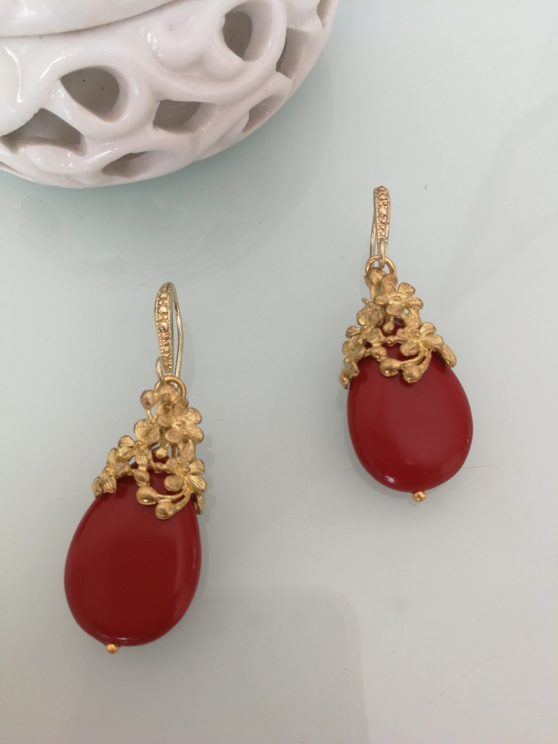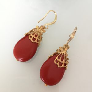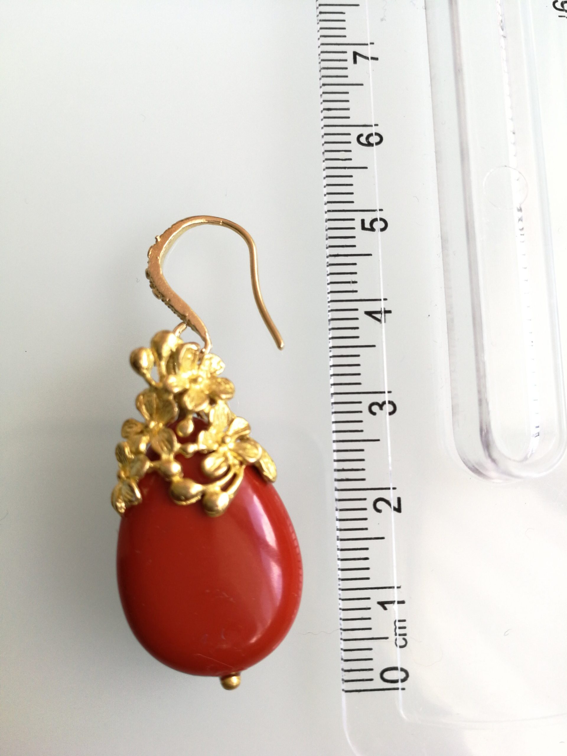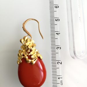 Orecchini antichi vintage degli anni 1990, con gocce di corallo rosso composto imitazione, montatura in ottone dorato a lavorazione artigianale con piccole foglie. Misurano lunghezza 5 cm