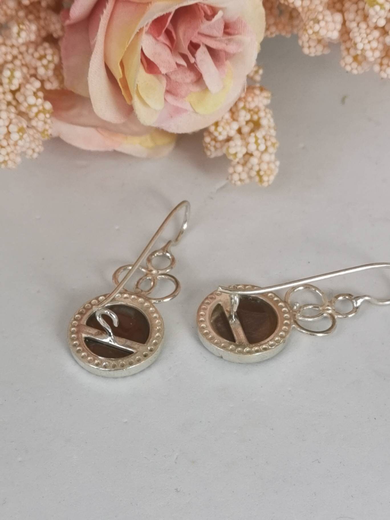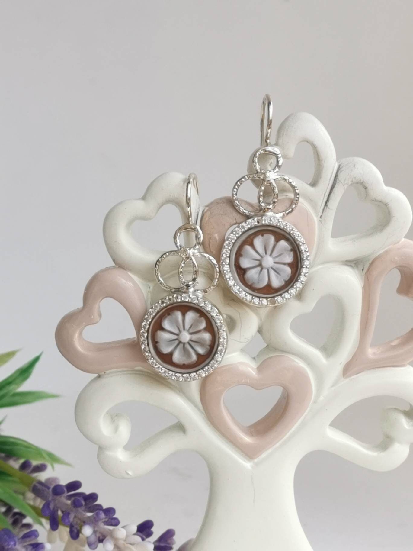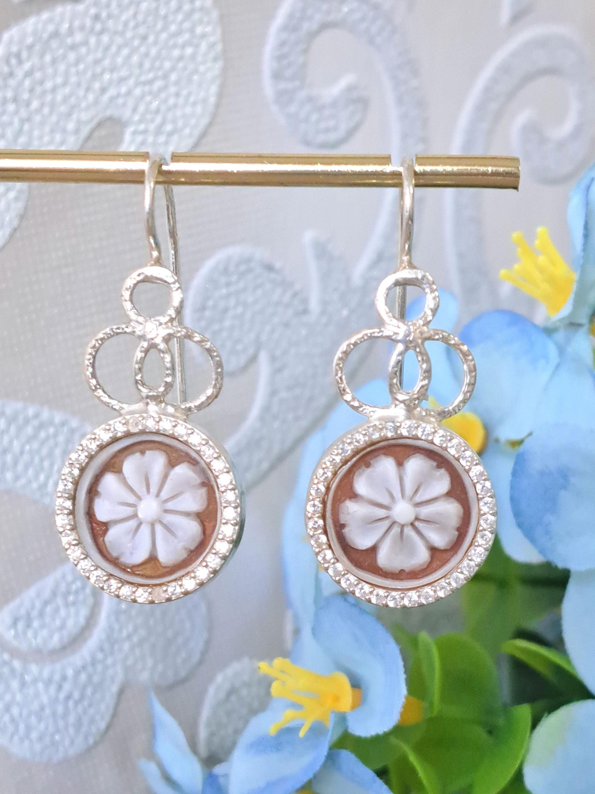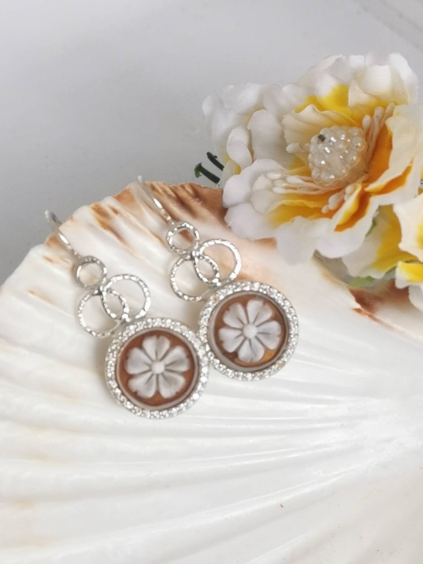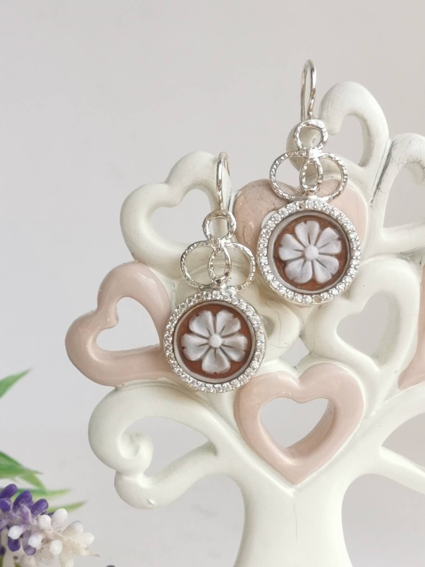 Orecchini artigianali in argento 925 con cammeo autentico in conchiglia sardonica scolpito a mano a del Torre del greco in conchiglia sardonica raffigurante fiori e cornice zirconi naturali