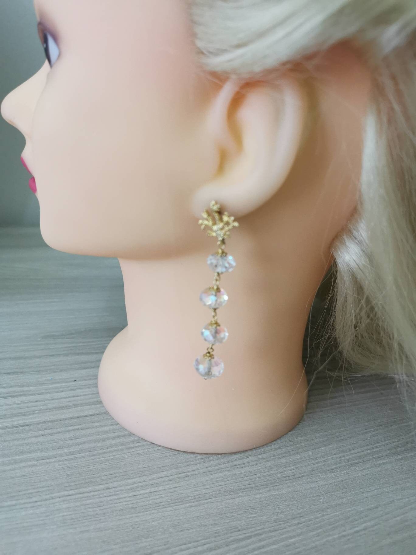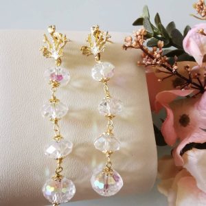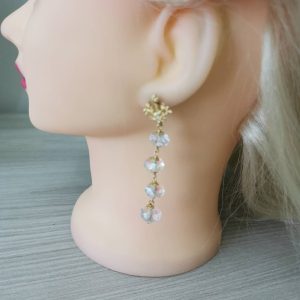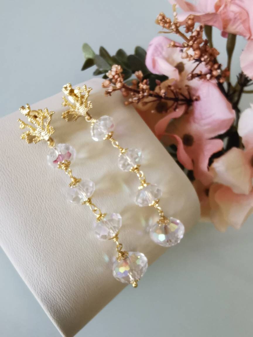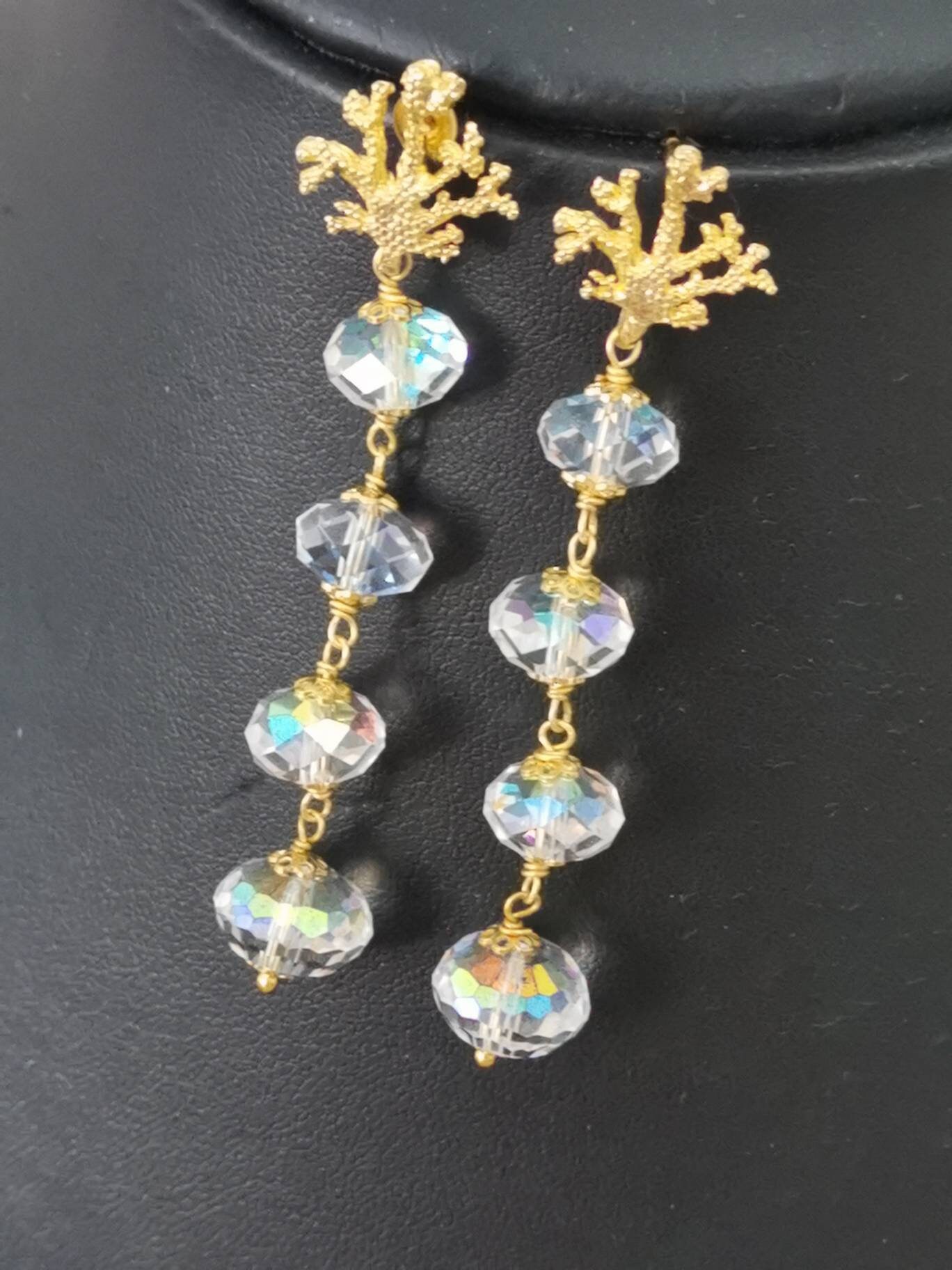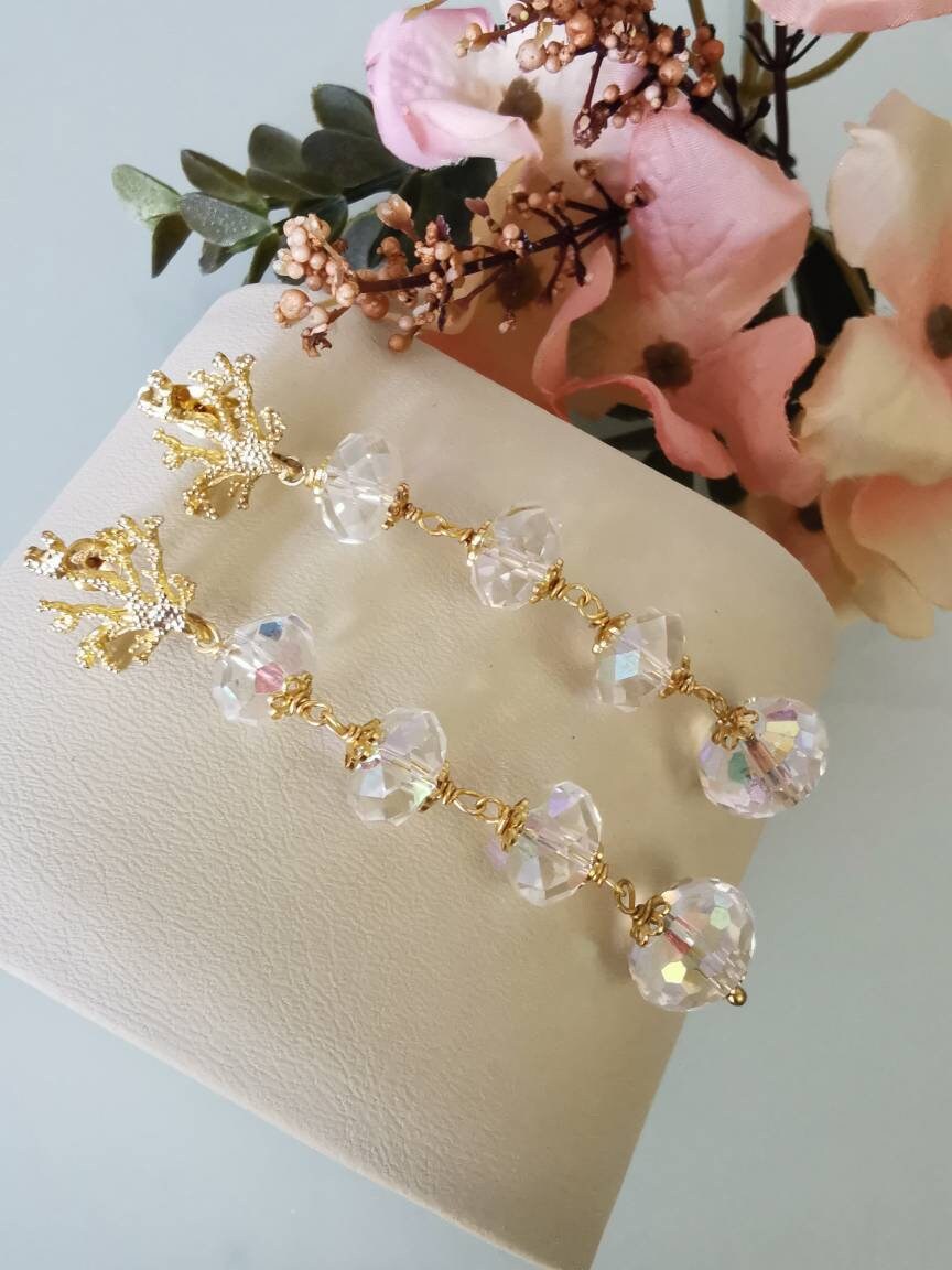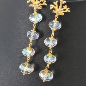 Orecchini pendenti realizzati con bellissimi cristalli aurora borealis e chiusure a farfallina a forma di corallo in argento 925 placcato oro.
