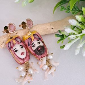 Orecchini teste di moro in ceramica Caltagirone con perle bianche ,corallo rosa naturale e pietre quarzo rosa , orecchini siciliani