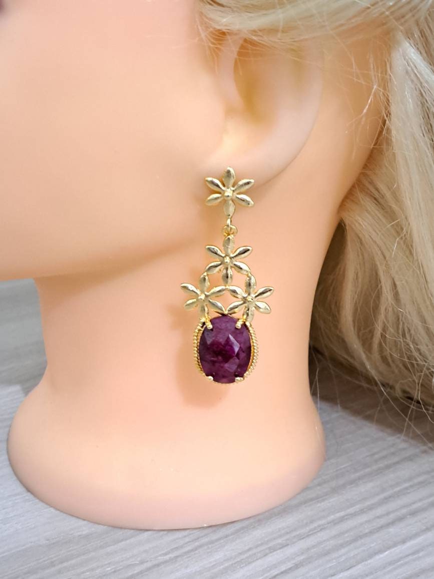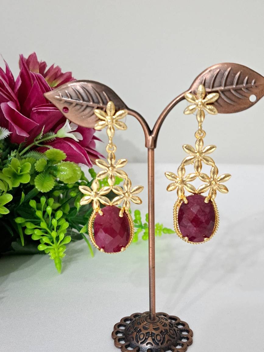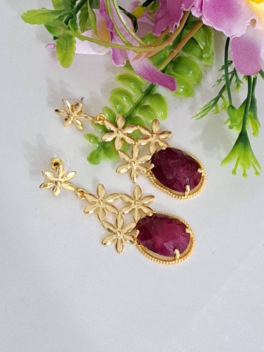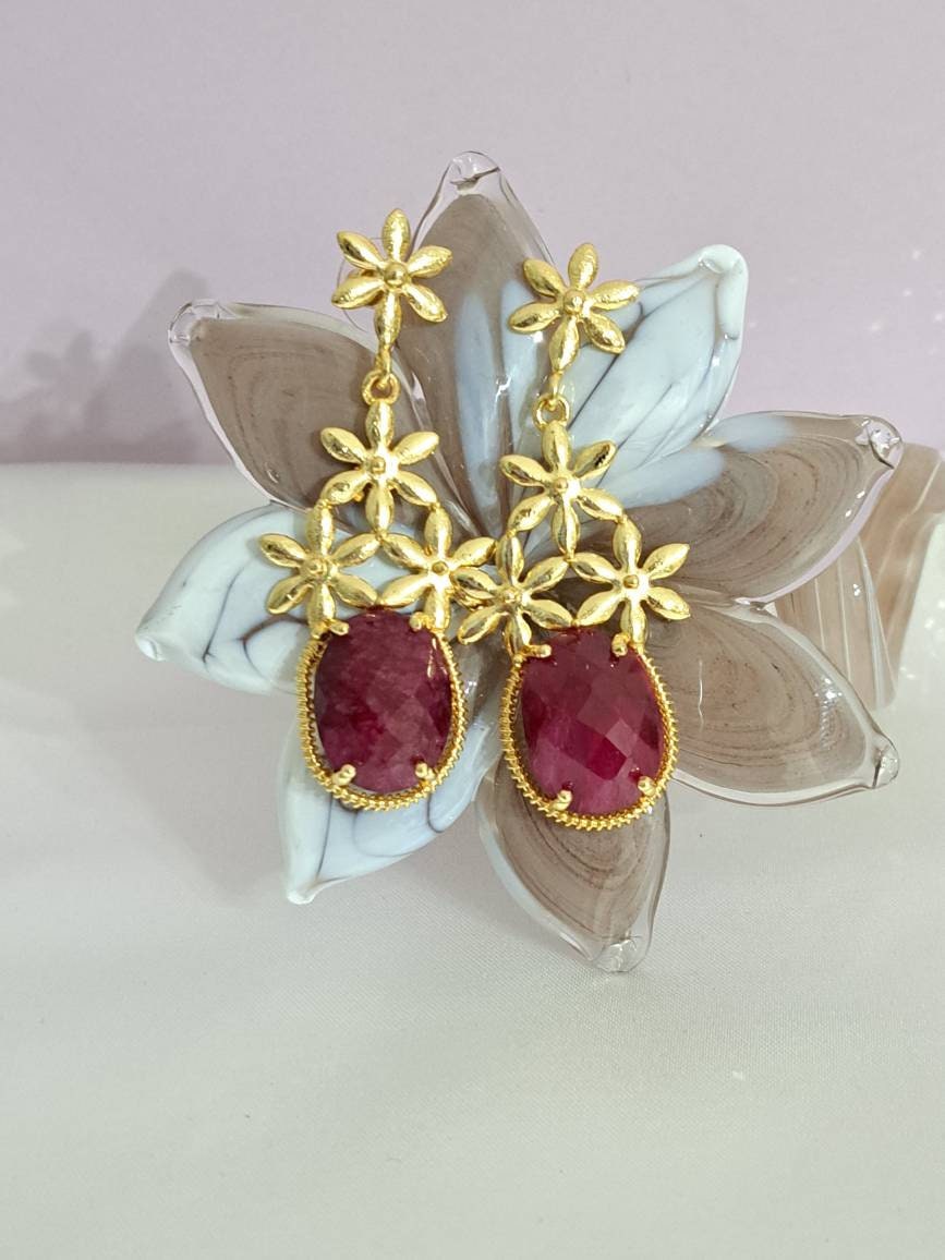 Orecchini artigianali con pietre dure sfaccettate radice di rubino con fiori e chiusure a perno con farfallina in ottone dorato .