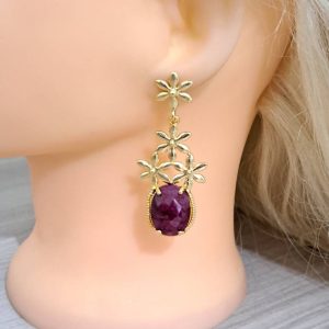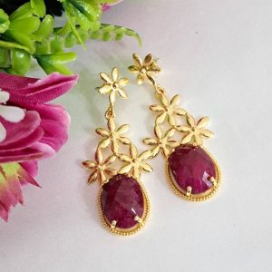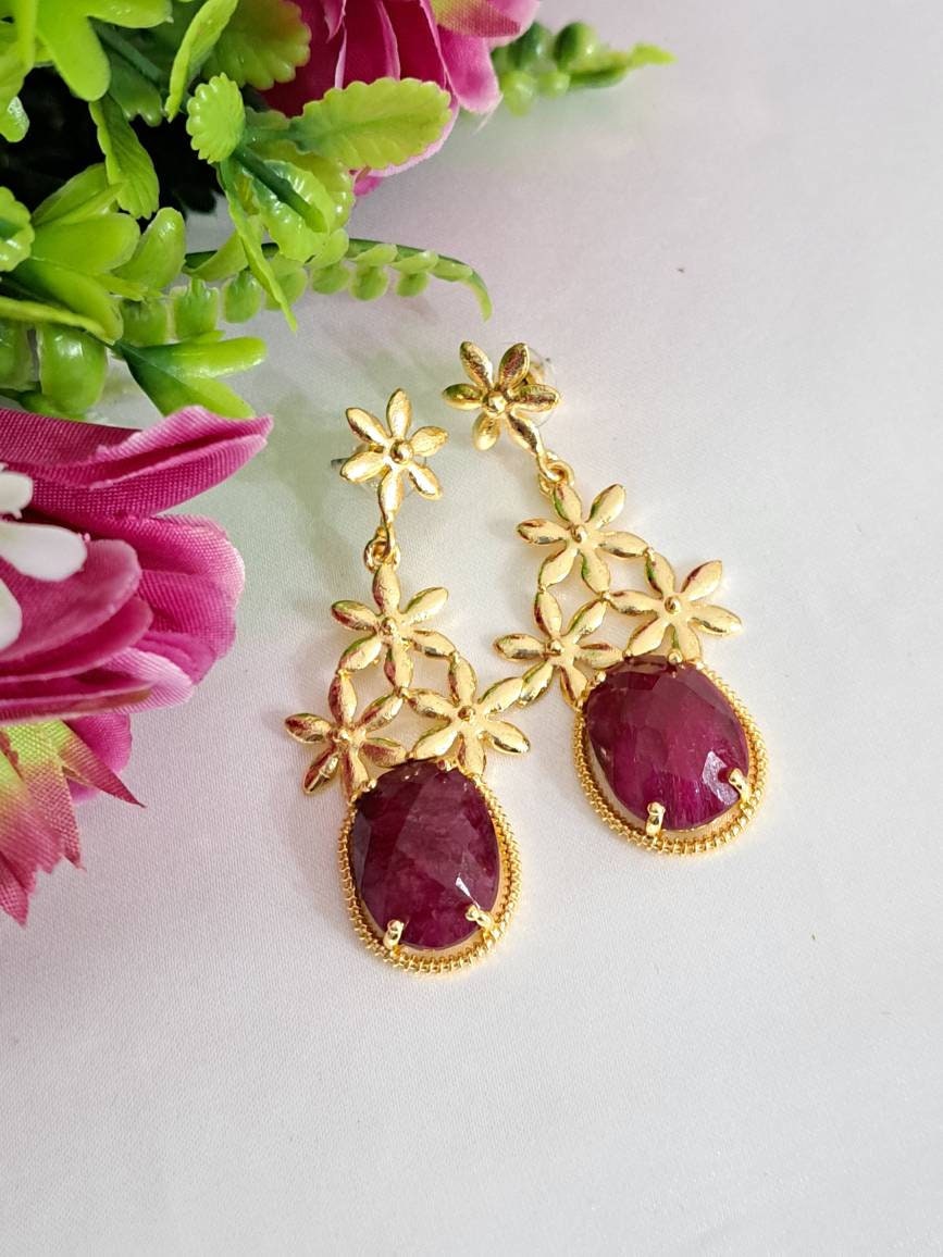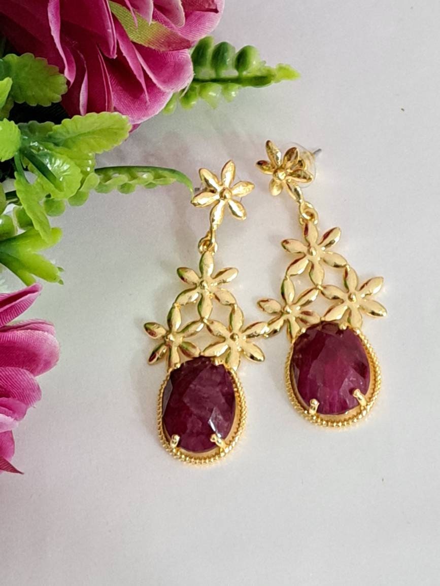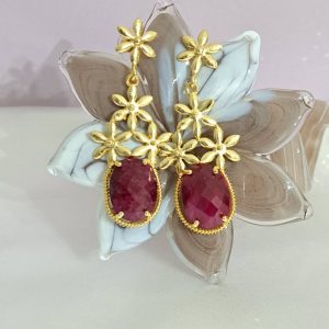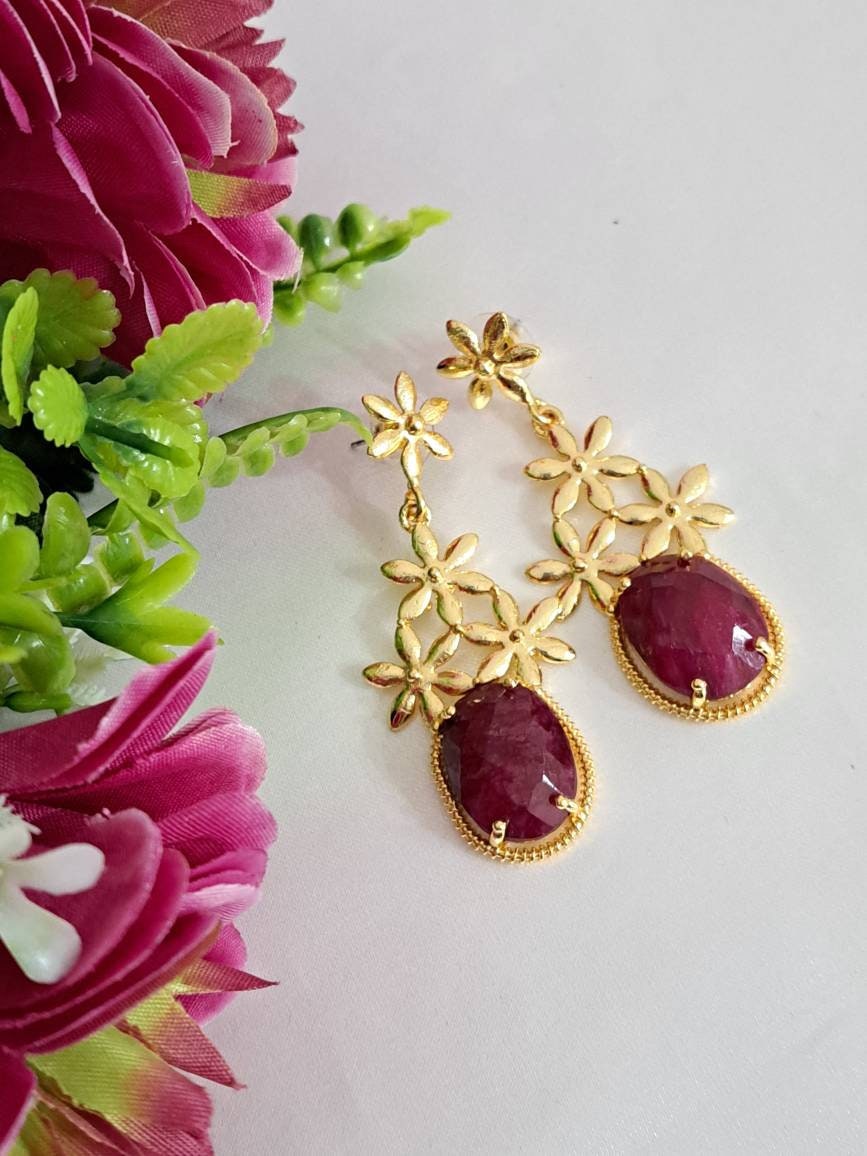 Orecchini artigianali con pietre dure sfaccettate radice di rubino con fiori e chiusure a perno con farfallina in ottone dorato .