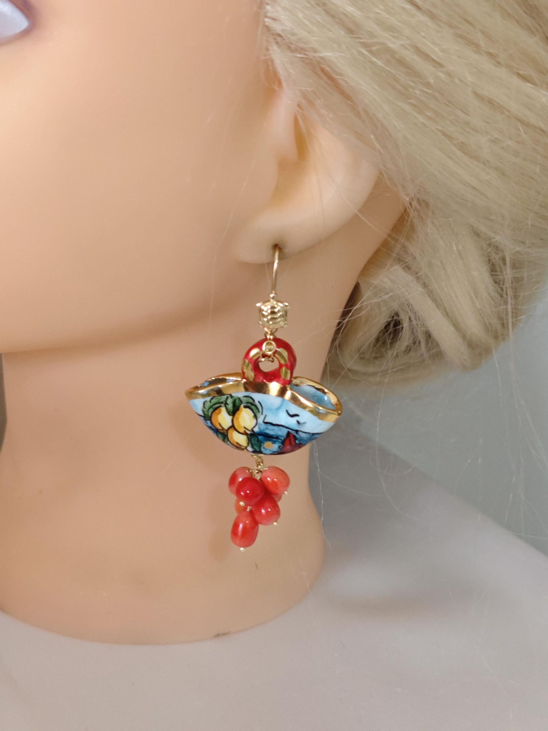 Orecchini borsette ceramica di Caltagirone e perle corallo rosso, orecchini siciliani
