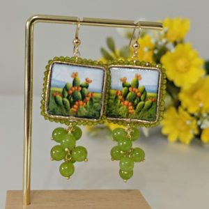 Orecchini piastrelle in ceramica di Caltagirone con pietre agata verde , orecchini siciliani
